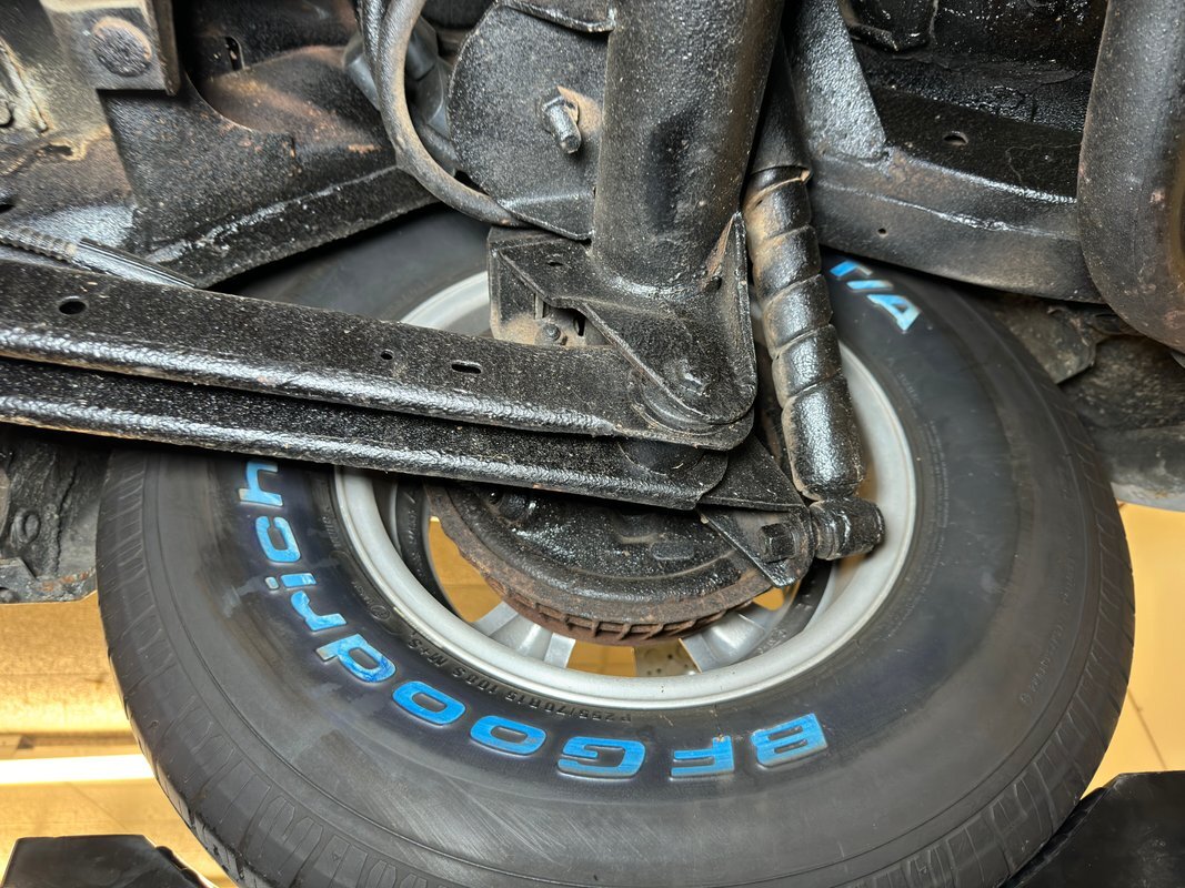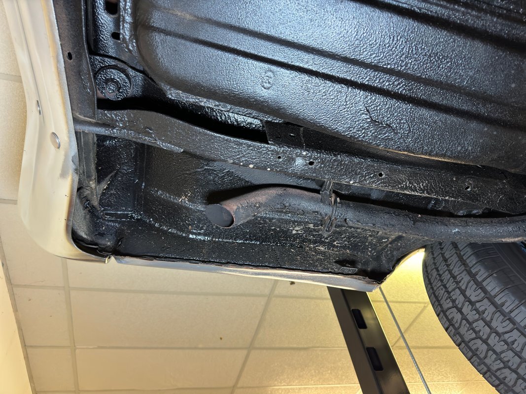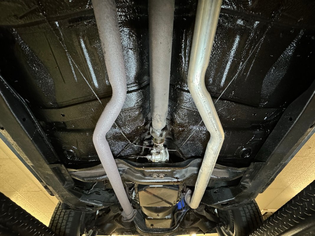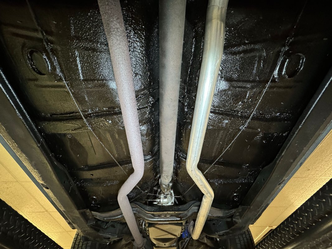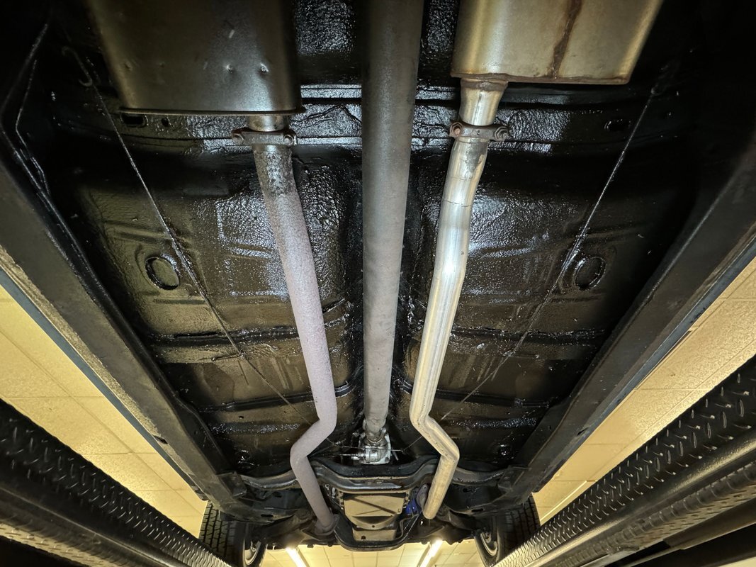 The belly pans appear to have been undercoated and there's not much surface rust underneath. One side of the dual exhaust looks newer than the other which is colored by surface rust but intact, and there's a stock muffler on that side and a Flowmaster on the newer run and they exit discreetly before reaching the back bumper. Some oil is noted on the oil pan and some residual fluid on the transmission pan and there's a bit of grime by the wheels but we've seen worse. There is some flaking rust around a body mount being the worse of the corrosion. For suspension, the car comes with coil springs up front and a four link with coil springs in the back and Delco spiral shock absorbers demonstrate more vintage hardware underneath.