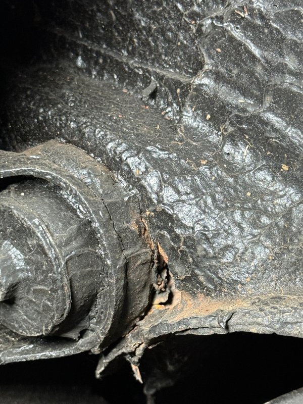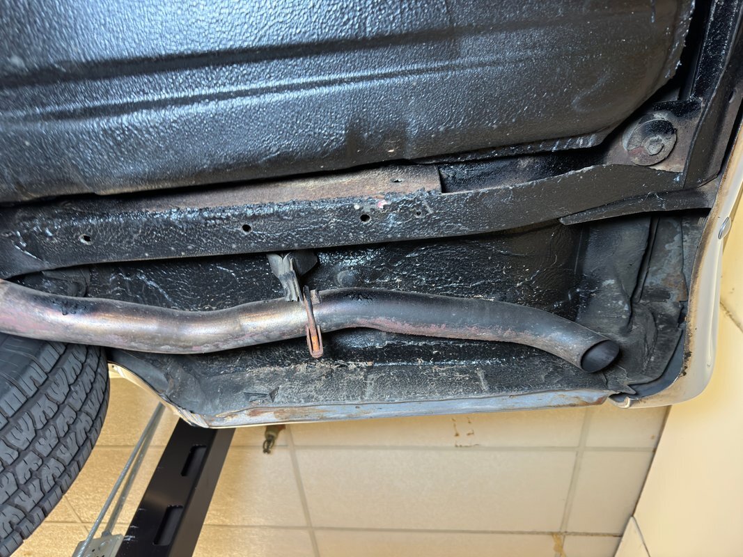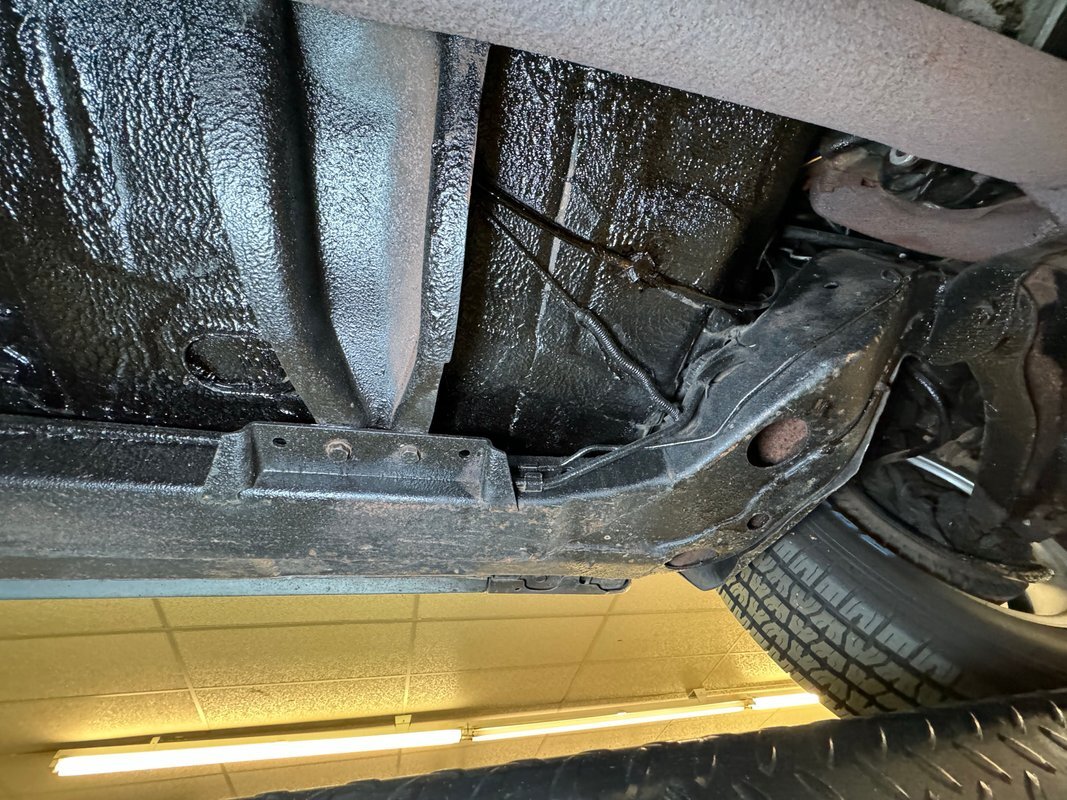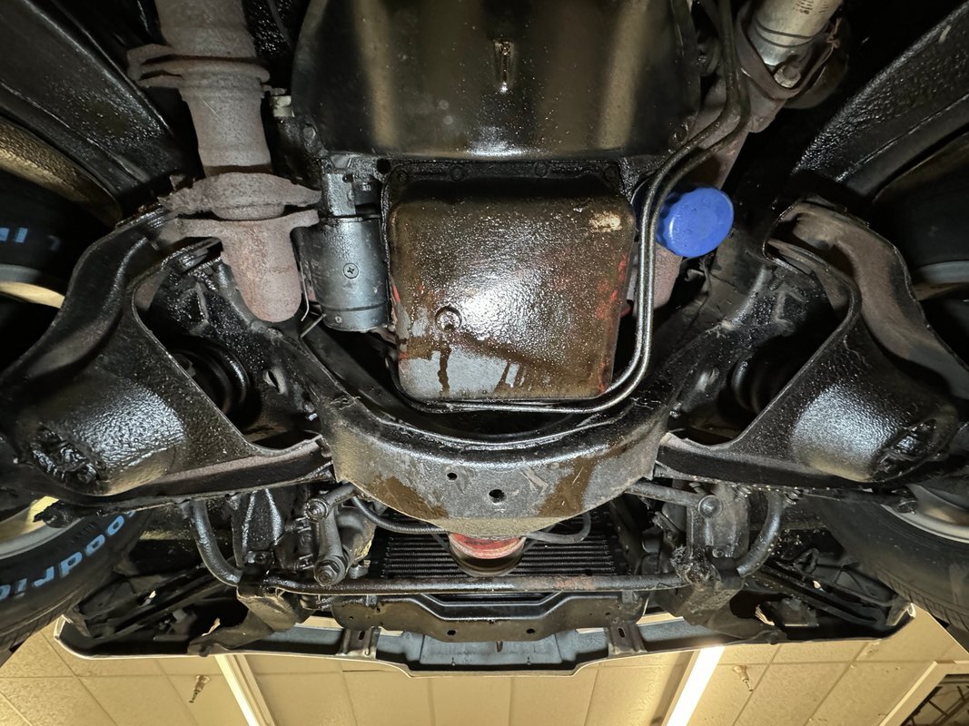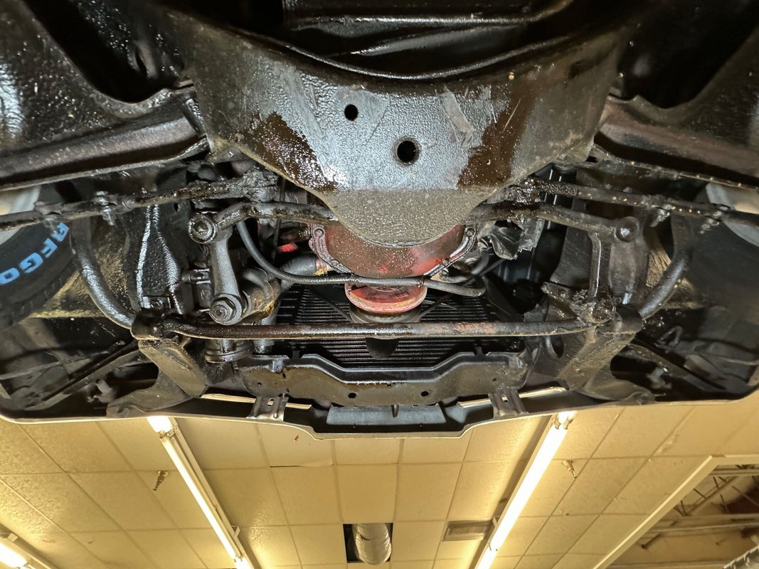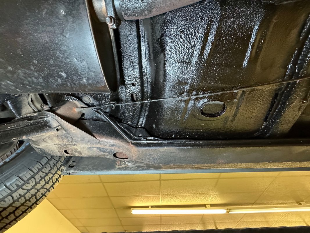 The belly pans appear to have been undercoated and there's not much surface rust underneath. One side of the dual exhaust looks newer than the other which is colored by surface rust but intact, and there's a stock muffler on that side and a Flowmaster on the newer run and they exit discreetly before reaching the back bumper. Some oil is noted on the oil pan and some residual fluid on the transmission pan and there's a bit of grime by the wheels but we've seen worse. There is some flaking rust around a body mount being the worse of the corrosion. For suspension, the car comes with coil springs up front and a four link with coil springs in the back and Delco spiral shock absorbers demonstrate more vintage hardware underneath.
