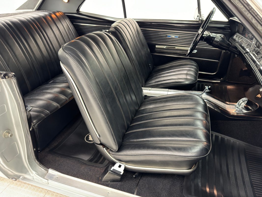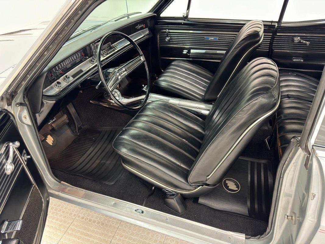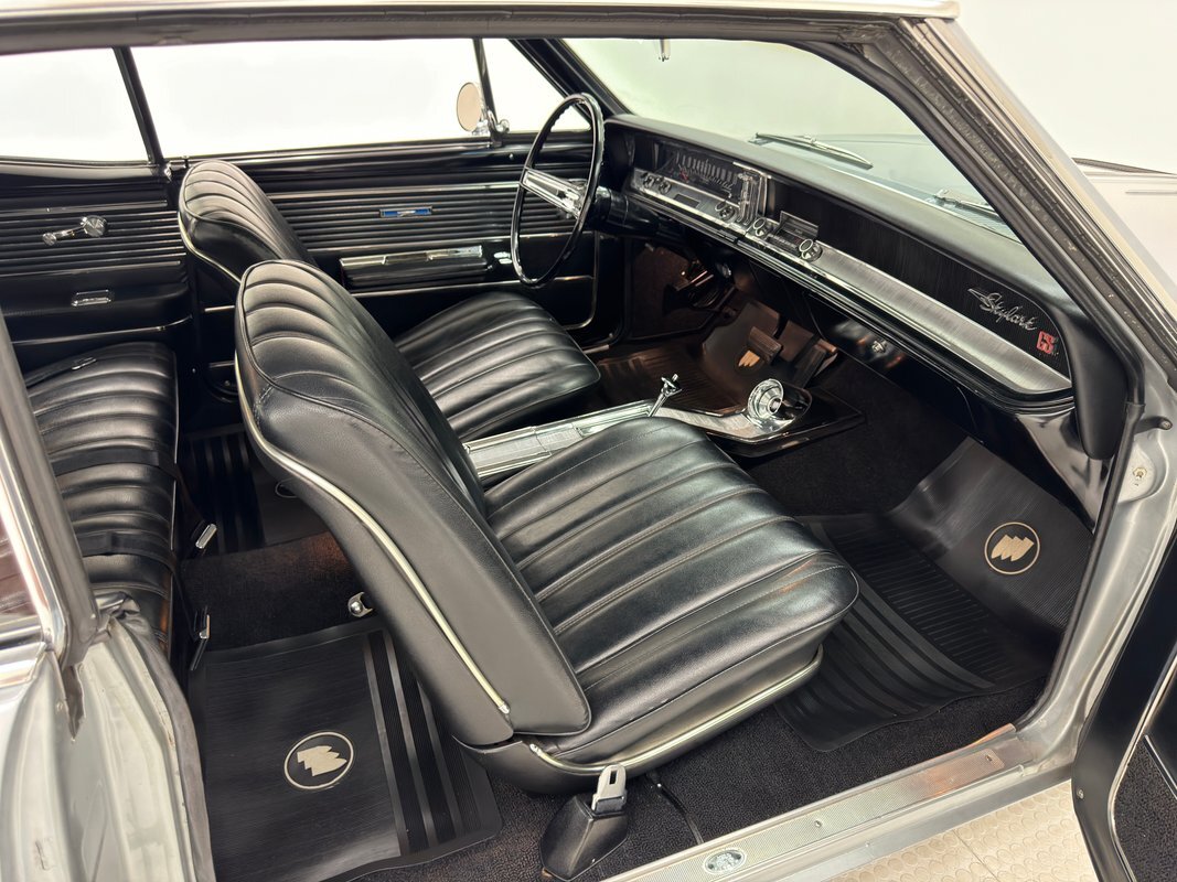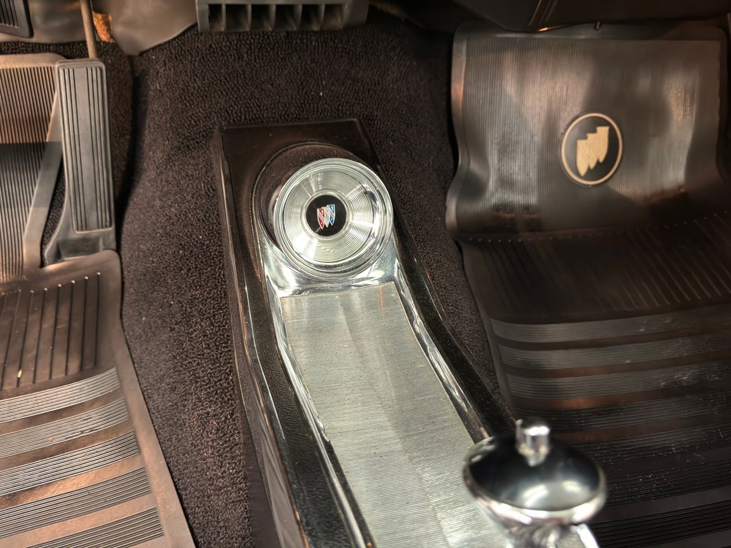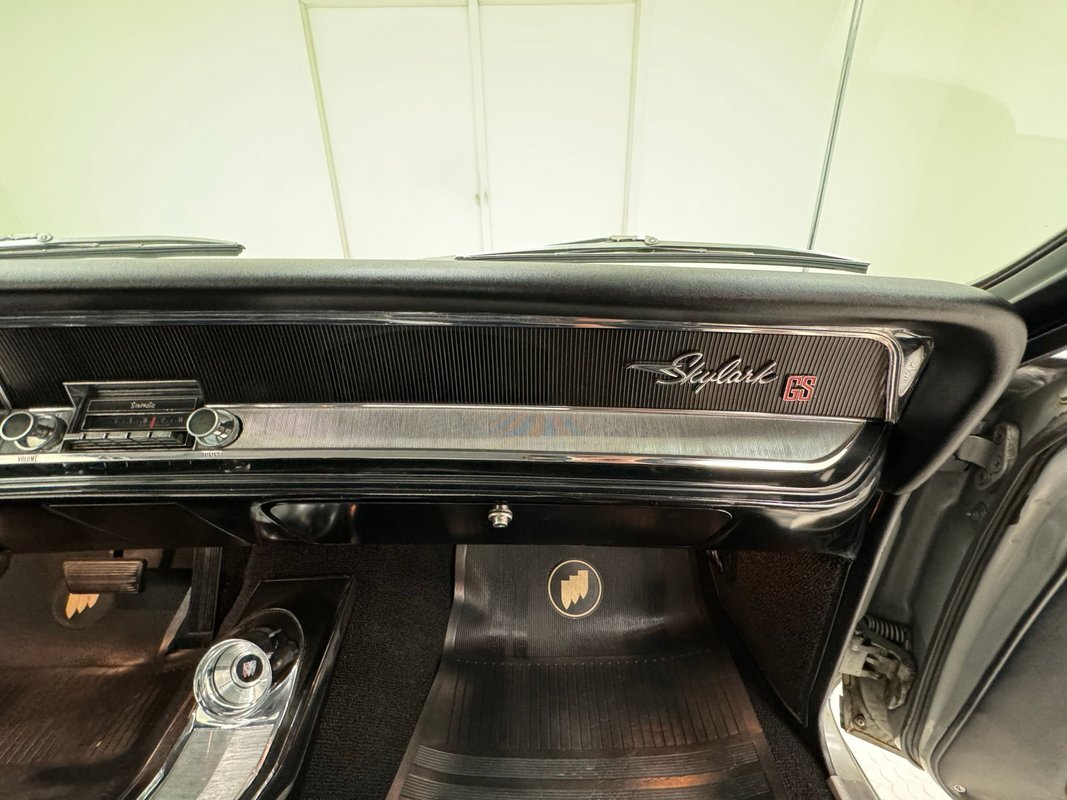 Black door panels striped with silver trim pieces and wearing a carpeted bottom and black painted top are stylish and neat. The low back black vinyl bucket seats up front have a stitched pattern on relatively flat surfaces split by a center console while the back bench is robust and clean and accompanied by the door panel design on the walls along with an armrest and ashtrays. A simple steering wheel with a cross spoke and horn fronts a horizontally displayed speedometer with other square gauge and knobs on a metallic paneled dashboard in clean condition. An AM radio is embedded in the center and a vertically finned dash welcomes the passenger and reminds them they're in a Skylark GS. A circular, raised Buick motif fronts the center console which extends rearward to collect the polished shifter in a simple indicator plate which gives way to a center storage compartment sculpted into the console. Black loop carpet under Buick rubber mats looks clean and so does the gray stitched headliner up above. The trunk is also clean and lined with a gray rug.