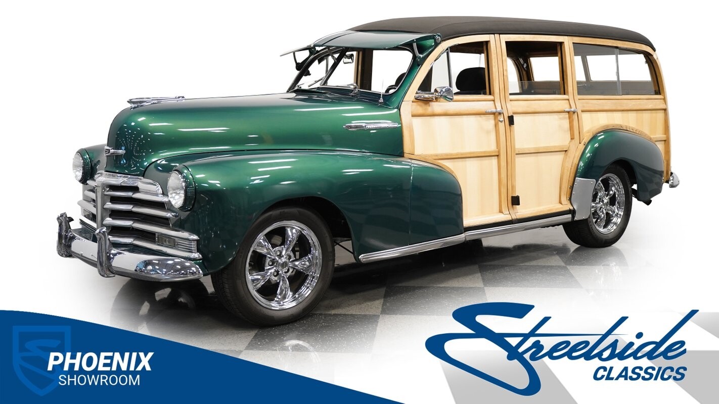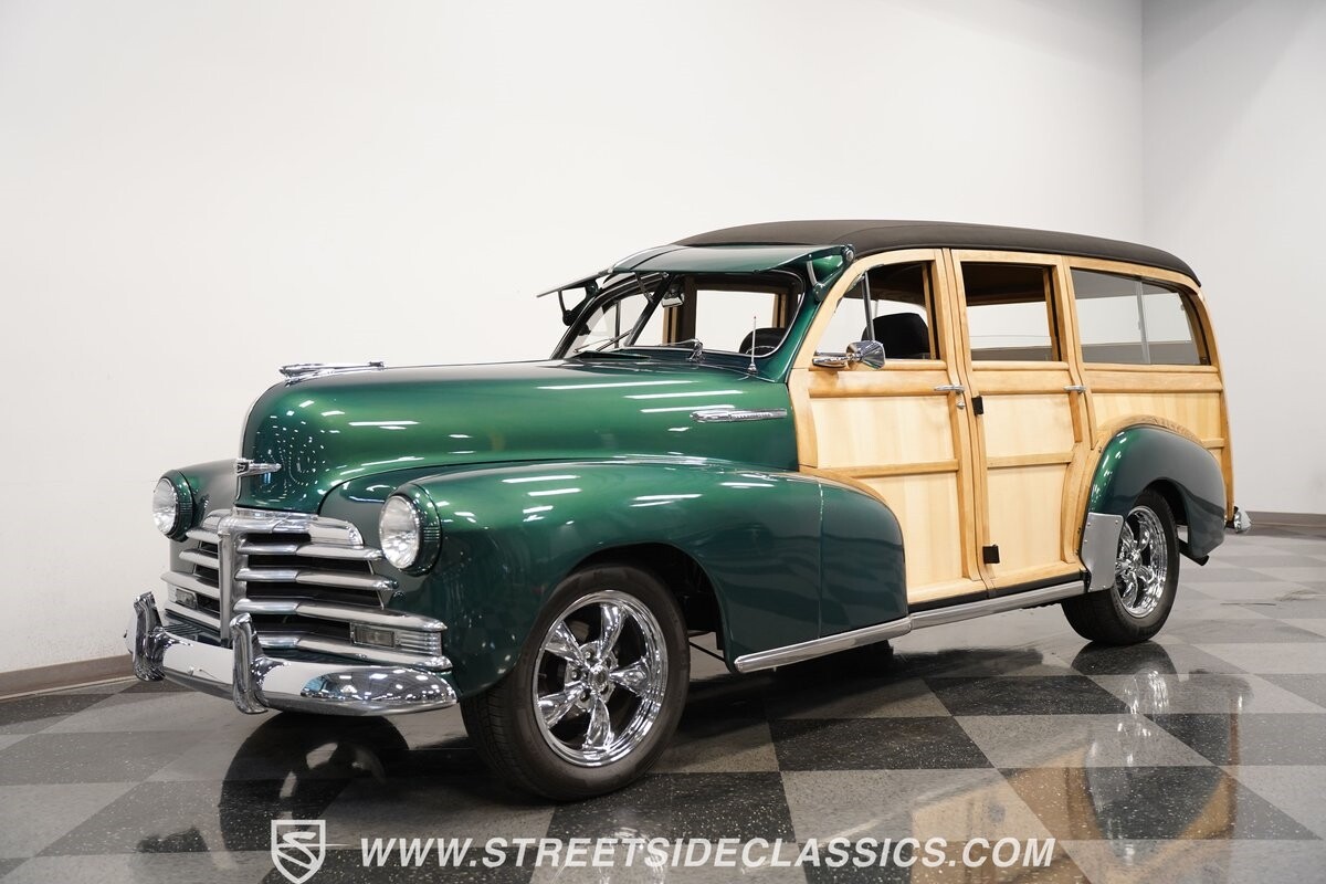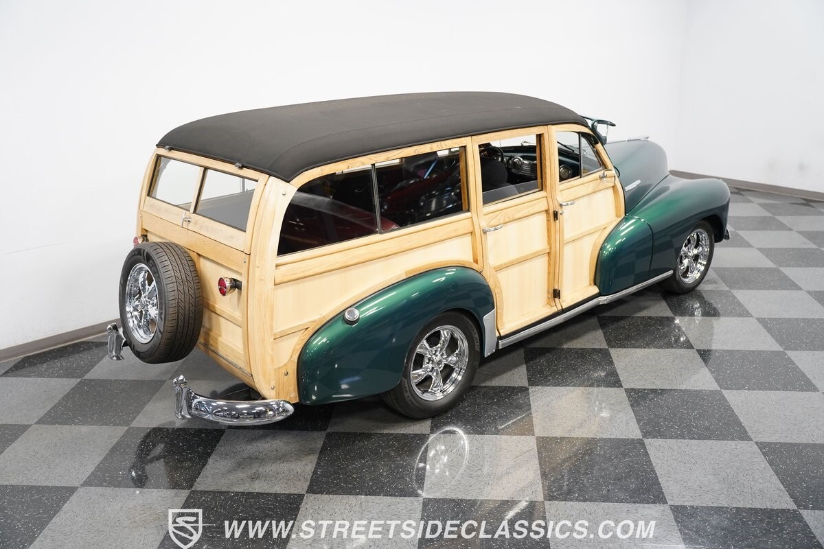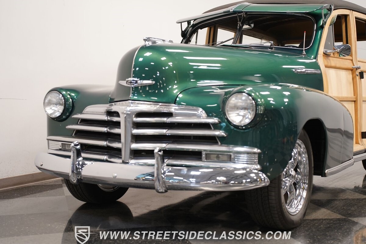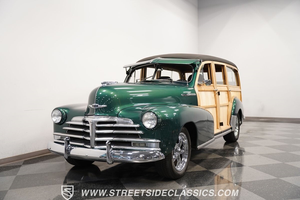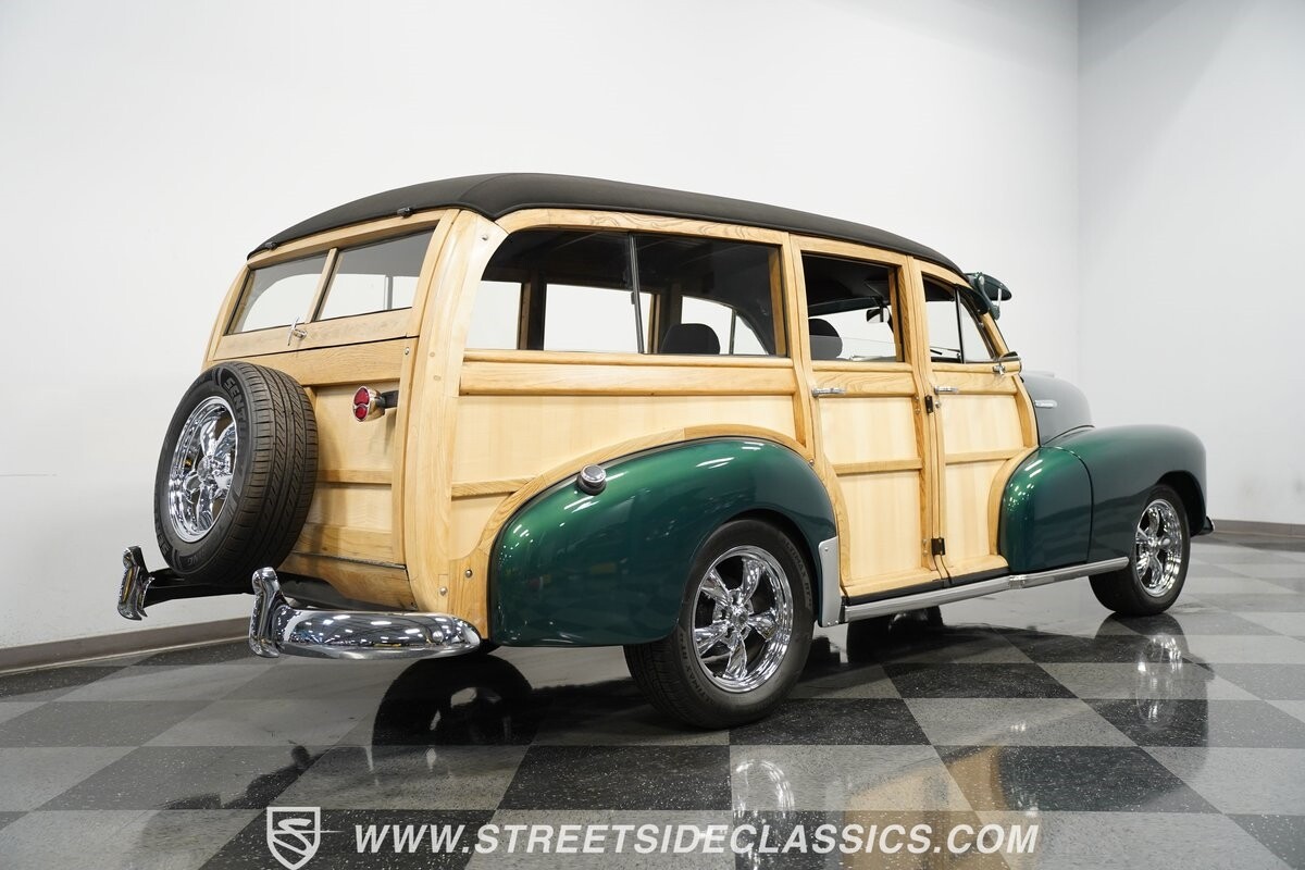 Embark on a classic surf adventure with this 1947 Chevrolet Fleetmaster Woody Wagon. Its metallic green exterior evokes the deep hues of the ocean, glistening under the sun. The wagon's wooden body, though unvarnished, stands as a testament to the craftsmanship of a bygone era. It proudly rides on 17-inch American Racing wheels, their shine rivaling the sun's brilliance. New chrome mirrors catch your eye, while the flawless front grille and bumper promise enduring strength. The black Hartz cloth top, in pristine condition, offers respite from the sun, and the recently installed sealed headlights act as guiding beacons through foggy mornings.