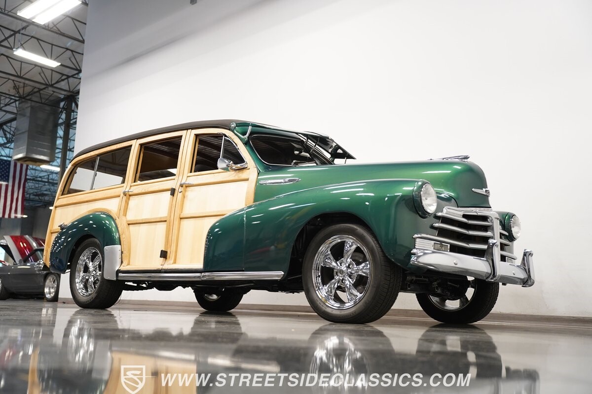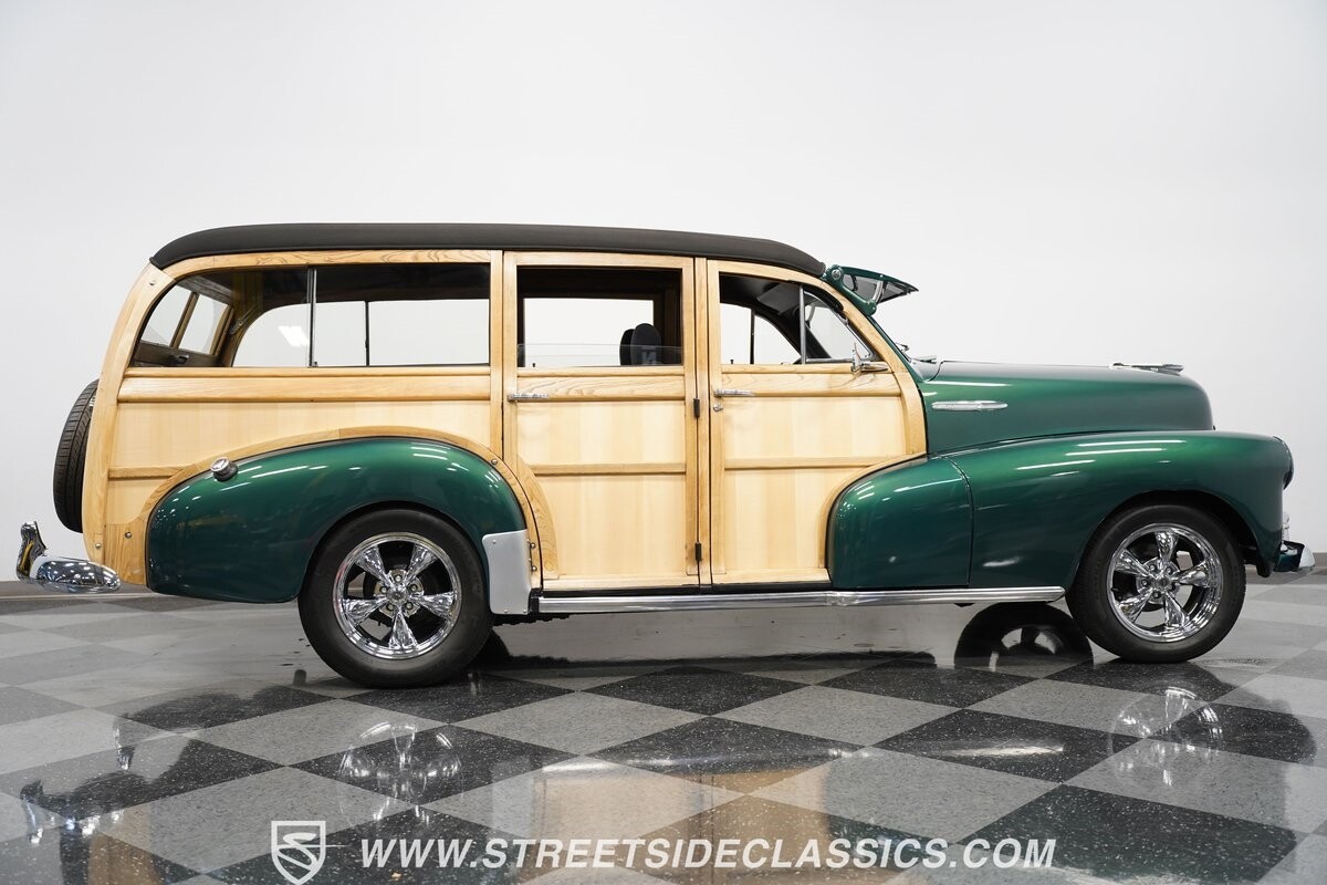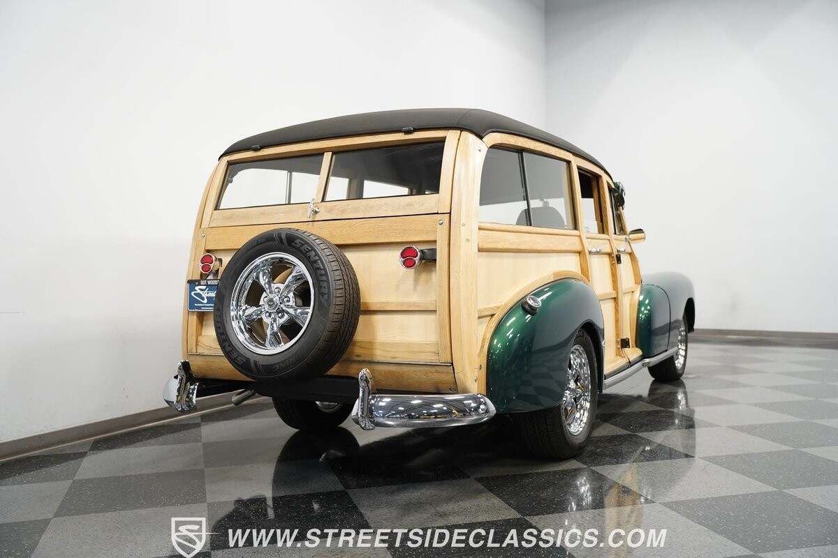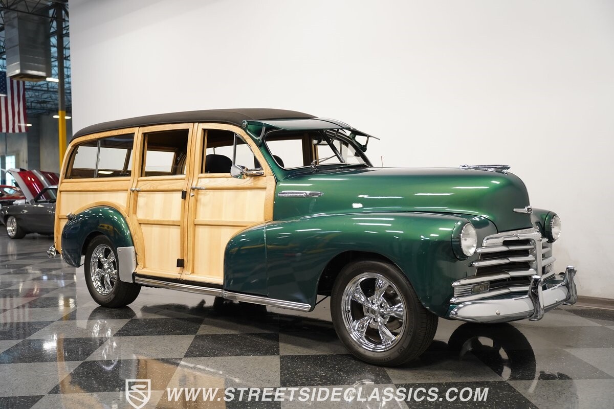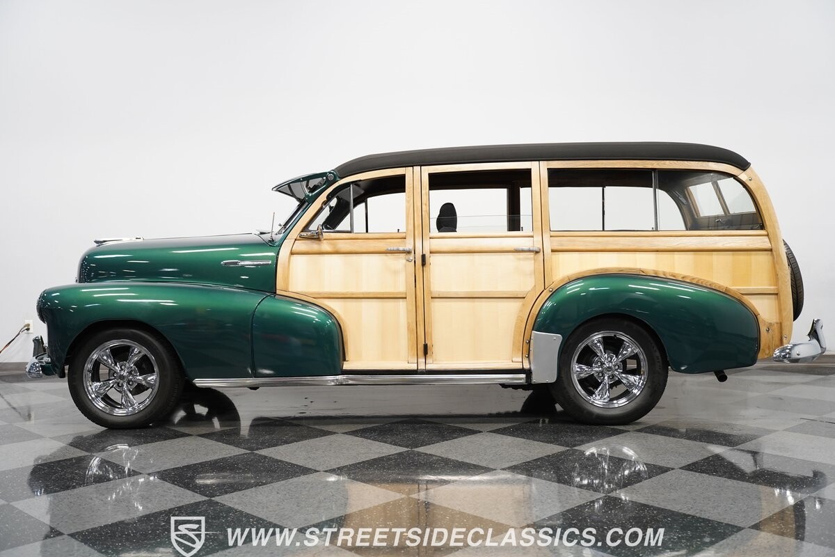 Embark on a classic surf adventure with this 1947 Chevrolet Fleetmaster Woody Wagon. Its metallic green exterior evokes the deep hues of the ocean, glistening under the sun. The wagon's wooden body, though unvarnished, stands as a testament to the craftsmanship of a bygone era. It proudly rides on 17-inch American Racing wheels, their shine rivaling the sun's brilliance. New chrome mirrors catch your eye, while the flawless front grille and bumper promise enduring strength. The black Hartz cloth top, in pristine condition, offers respite from the sun, and the recently installed sealed headlights act as guiding beacons through foggy mornings.