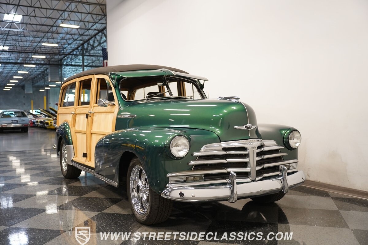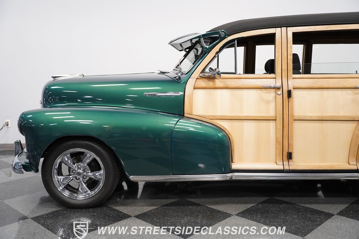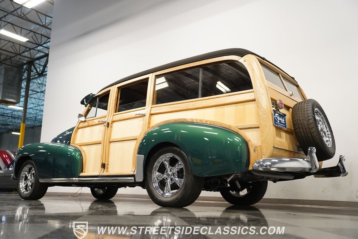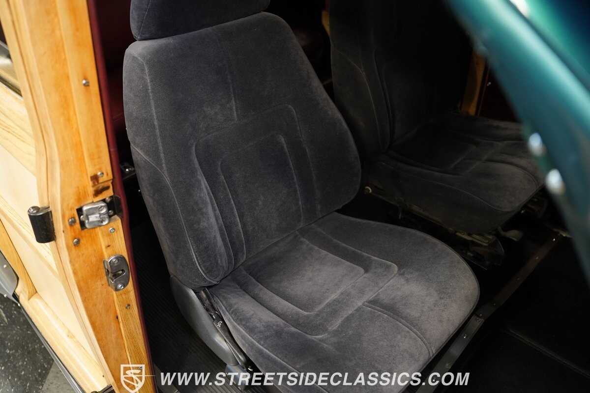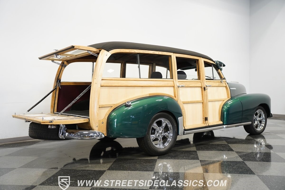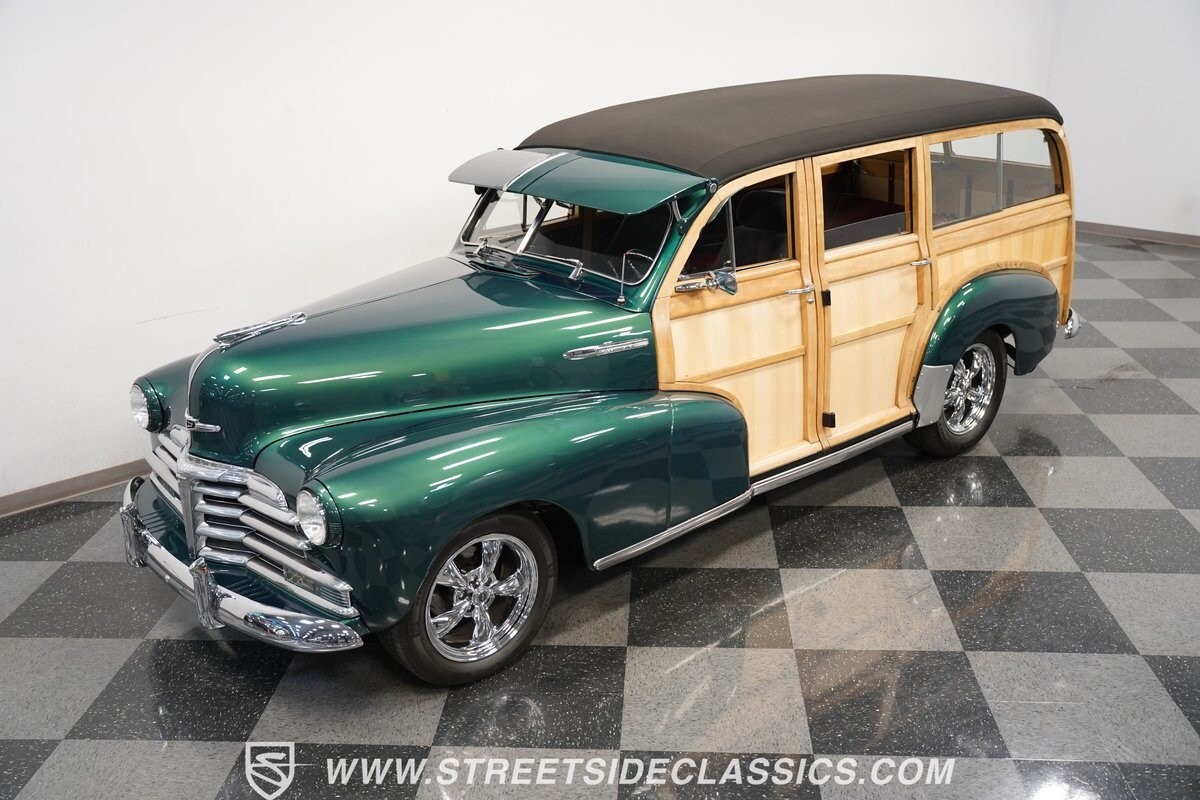 Embark on a classic surf adventure with this 1947 Chevrolet Fleetmaster Woody Wagon. Its metallic green exterior evokes the deep hues of the ocean, glistening under the sun. The wagon's wooden body, though unvarnished, stands as a testament to the craftsmanship of a bygone era. It proudly rides on 17-inch American Racing wheels, their shine rivaling the sun's brilliance. New chrome mirrors catch your eye, while the flawless front grille and bumper promise enduring strength. The black Hartz cloth top, in pristine condition, offers respite from the sun, and the recently installed sealed headlights act as guiding beacons through foggy mornings.