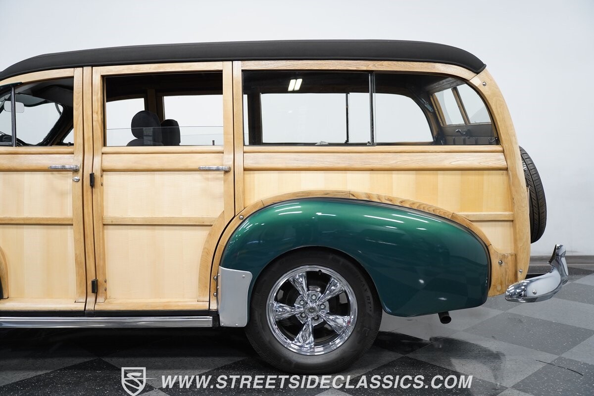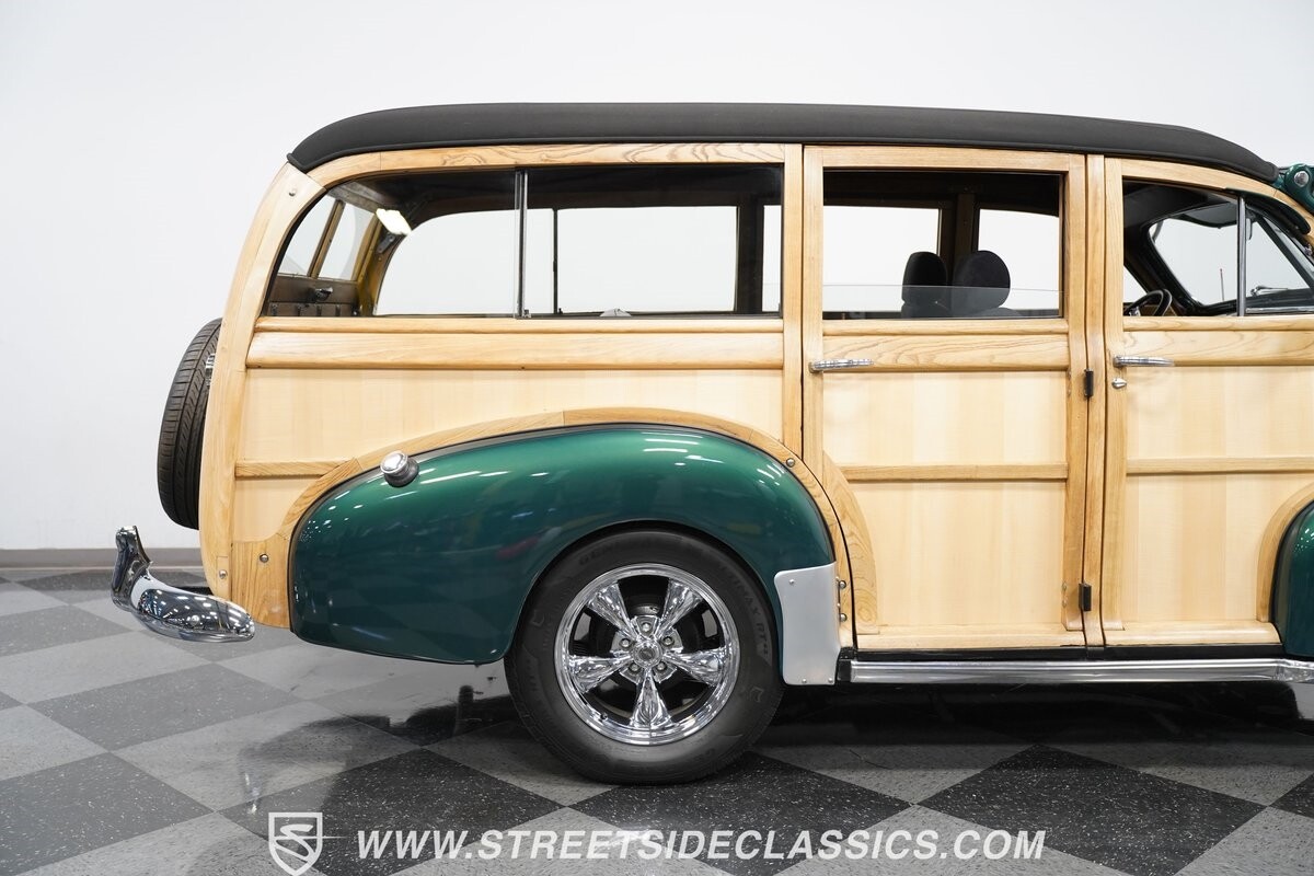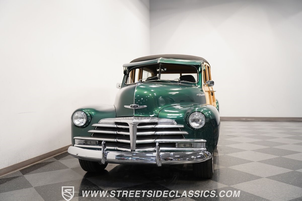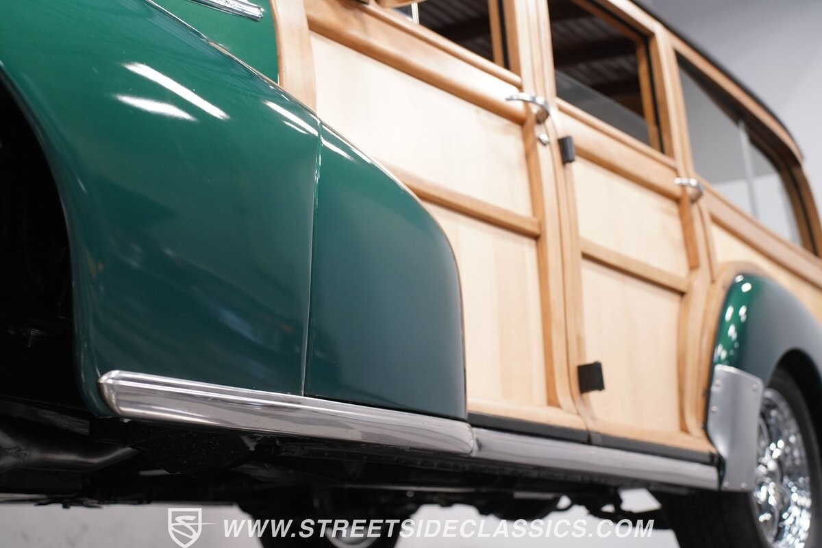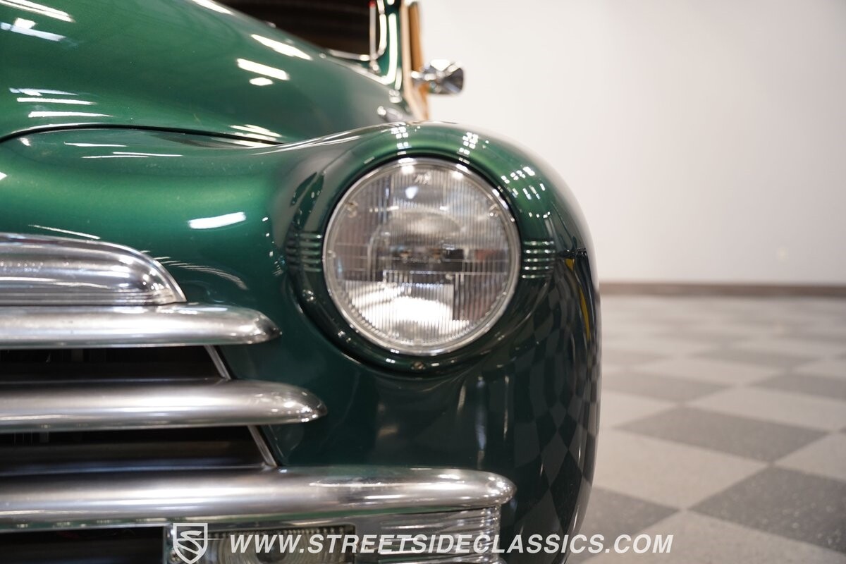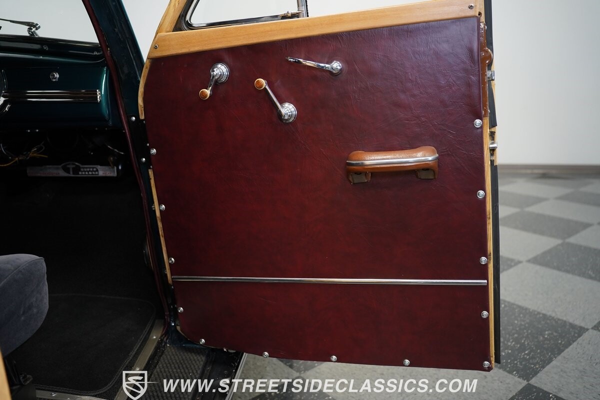 Embark on a classic surf adventure with this 1947 Chevrolet Fleetmaster Woody Wagon. Its metallic green exterior evokes the deep hues of the ocean, glistening under the sun. The wagon's wooden body, though unvarnished, stands as a testament to the craftsmanship of a bygone era. It proudly rides on 17-inch American Racing wheels, their shine rivaling the sun's brilliance. New chrome mirrors catch your eye, while the flawless front grille and bumper promise enduring strength. The black Hartz cloth top, in pristine condition, offers respite from the sun, and the recently installed sealed headlights act as guiding beacons through foggy mornings.