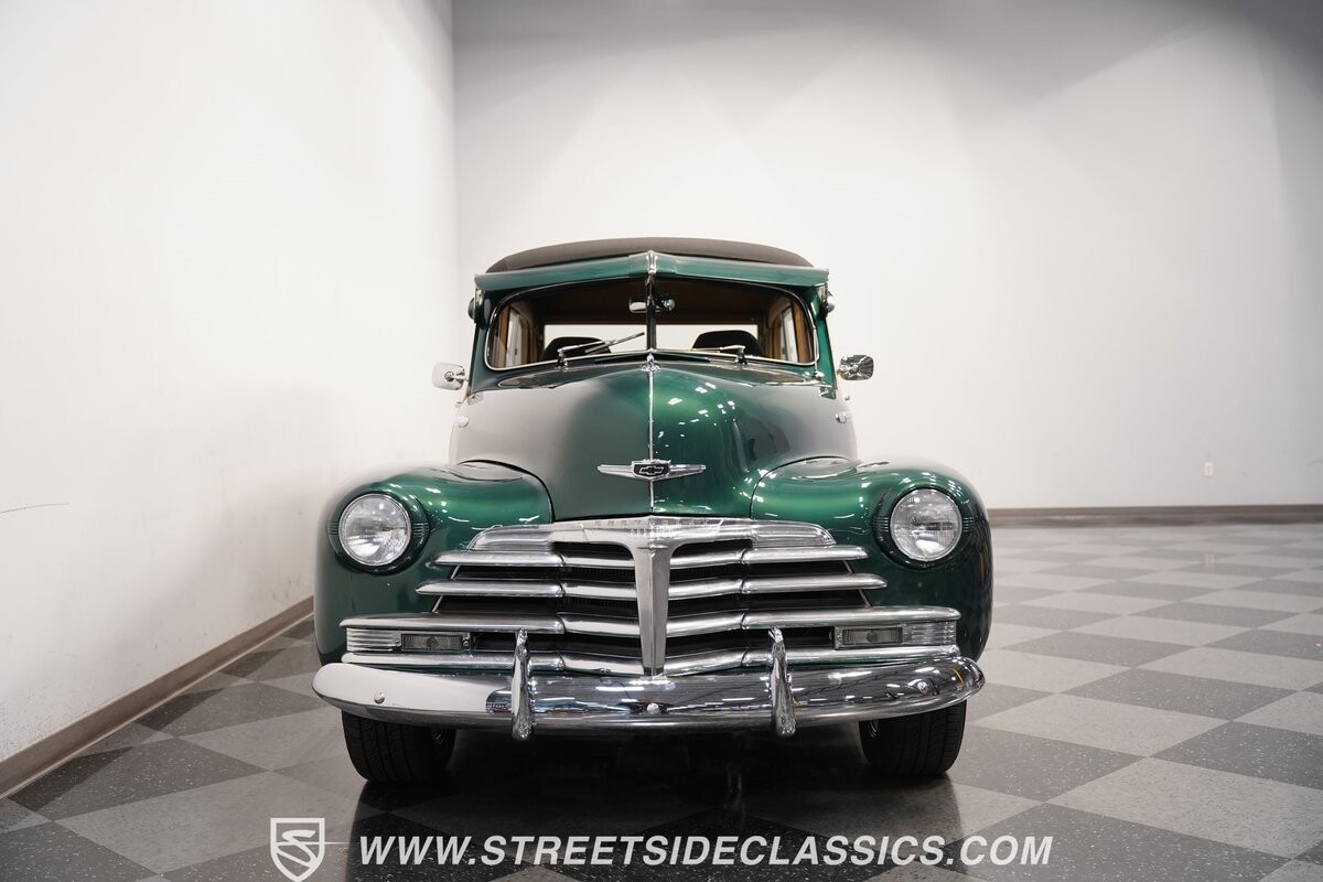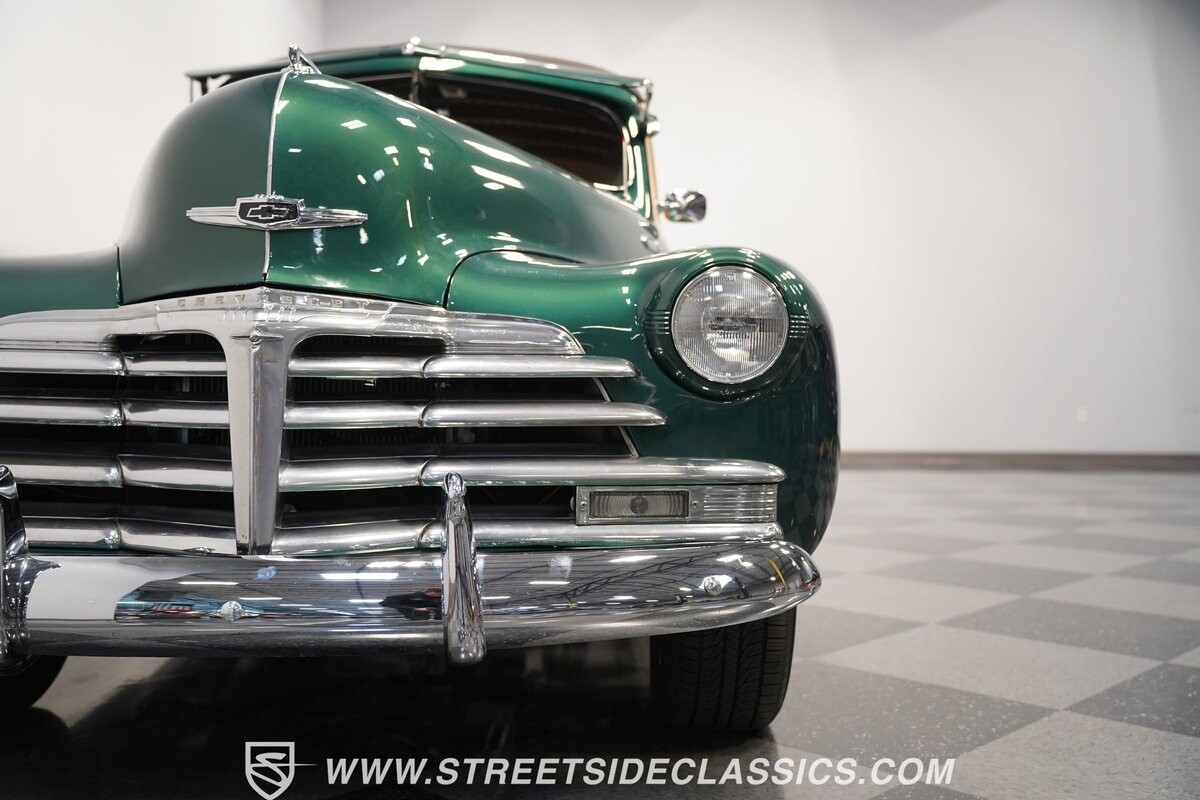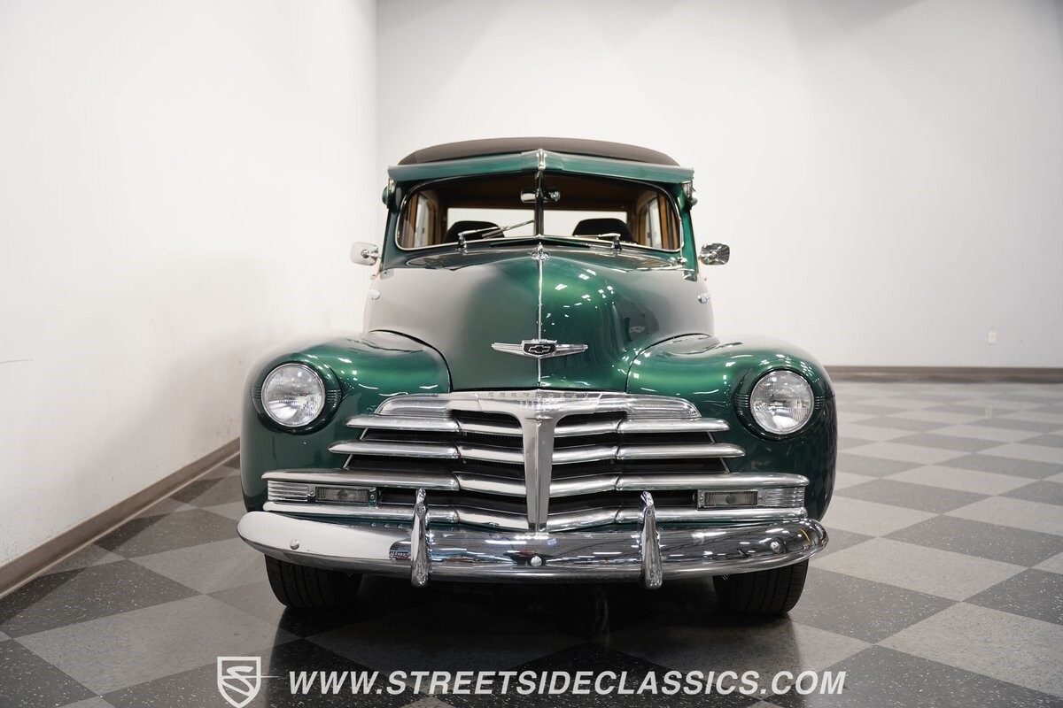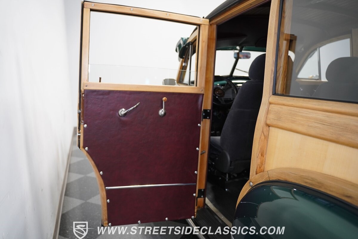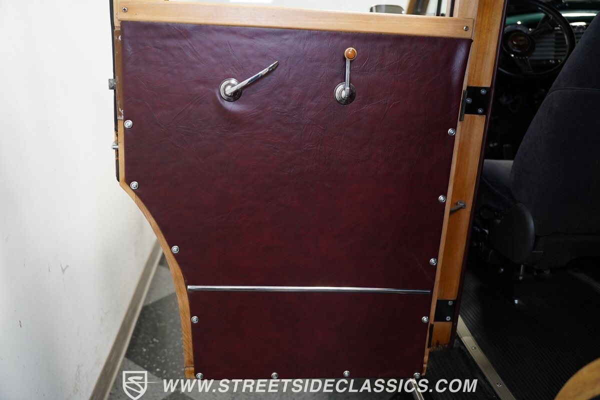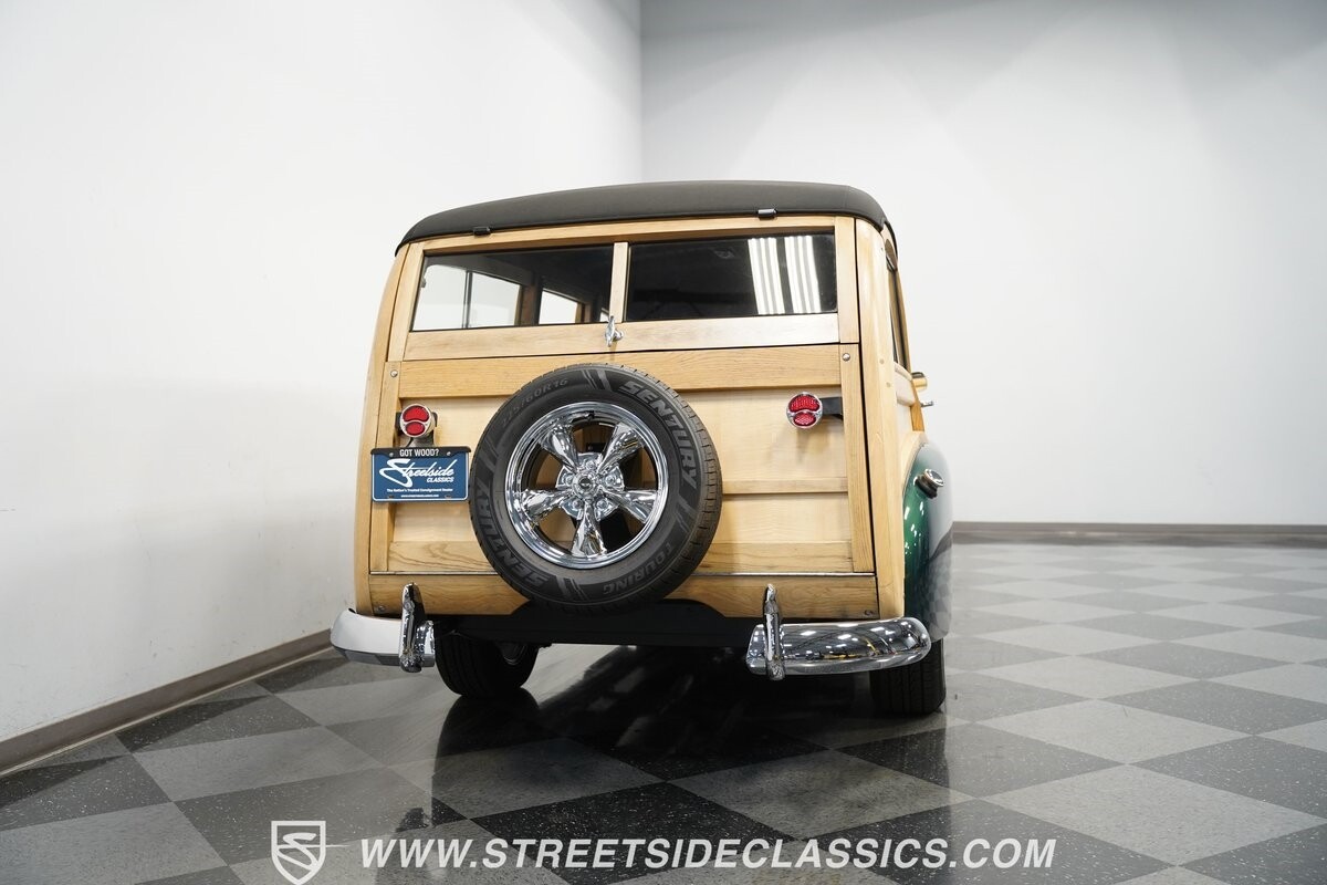Embark on a classic surf adventure with this 1947 Chevrolet Fleetmaster Woody Wagon. Its metallic green exterior evokes the deep hues of the ocean, glistening under the sun. The wagon's wooden body, though unvarnished, stands as a testament to the craftsmanship of a bygone era. It proudly rides on 17-inch American Racing wheels, their shine rivaling the sun's brilliance. New chrome mirrors catch your eye, while the flawless front grille and bumper promise enduring strength. The black Hartz cloth top, in pristine condition, offers respite from the sun, and the recently installed sealed headlights act as guiding beacons through foggy mornings.