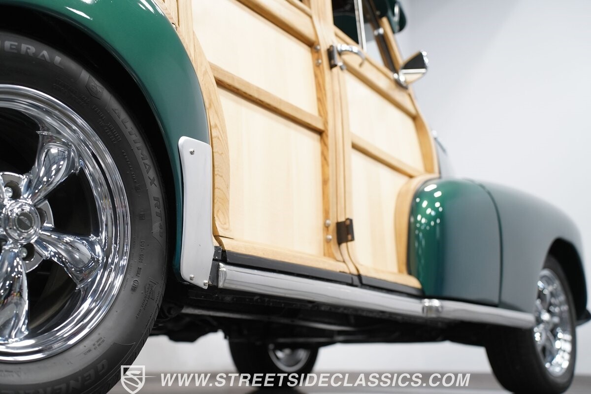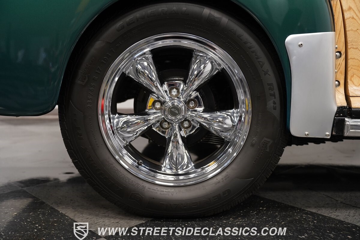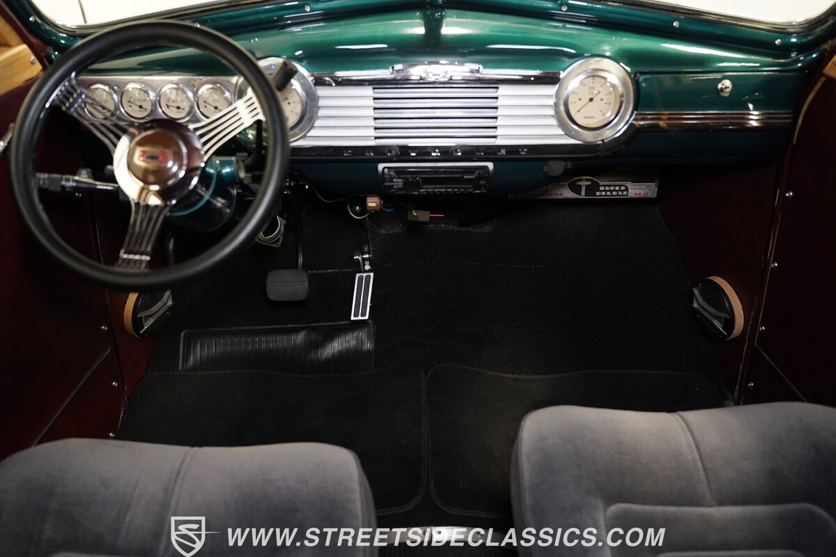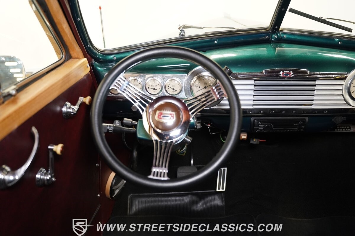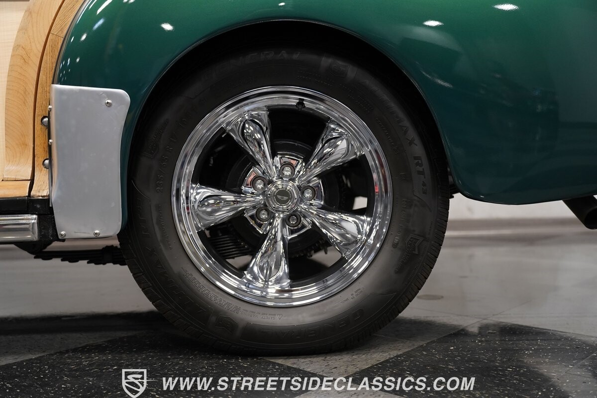 This 1947 Chevrolet Fleetmaster Woody Wagon keeps the good times rolling, thanks to the Goodwrench 350 crate motor fed by a Holley four-barrel carburetor and an Edelbrock performer intake. The HEI distributor ensures reliable ignition, and it's all managed through a 700R4 4-speed automatic transmission. The engine bay is a model of cleanliness and organization, with tidy wiring and proper clamps showcasing meticulous attention to detail. With power disc brakes in the front and drums in the rear, a Mustang 2 front end, and a Ford 9-inch rear axle, along with an added rear sway bar, this wagon's performance is enhanced, making every journey, whether to a show or a family outing, an experience to cherish.