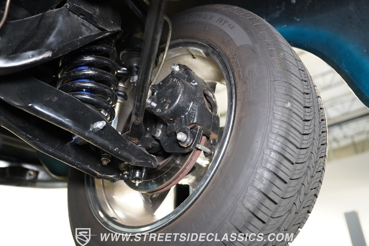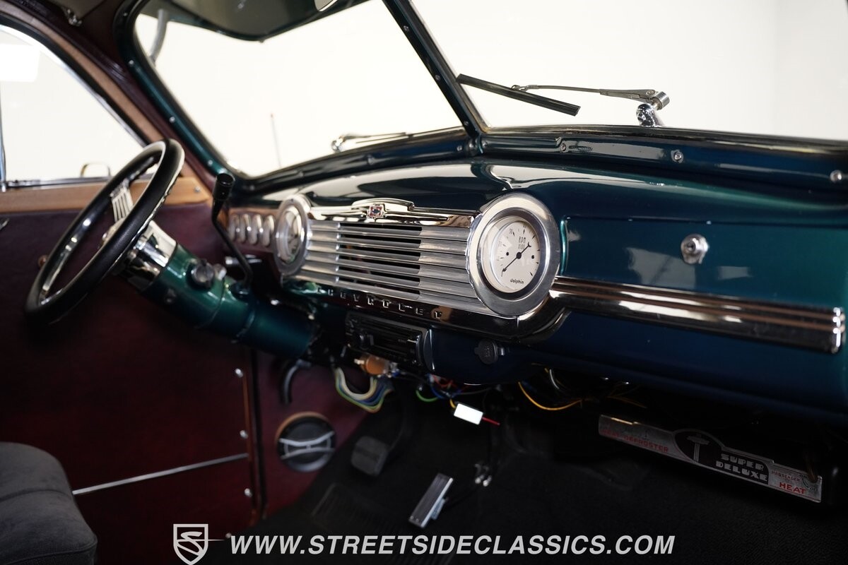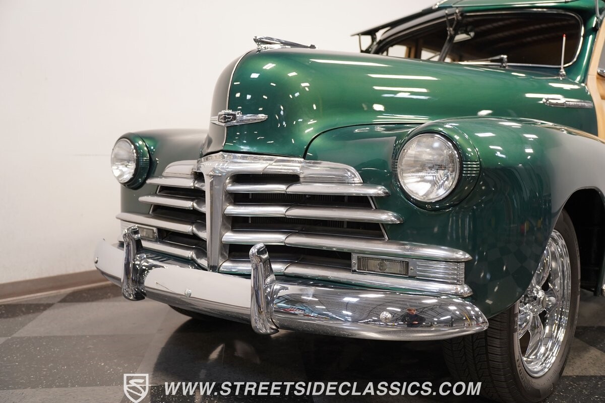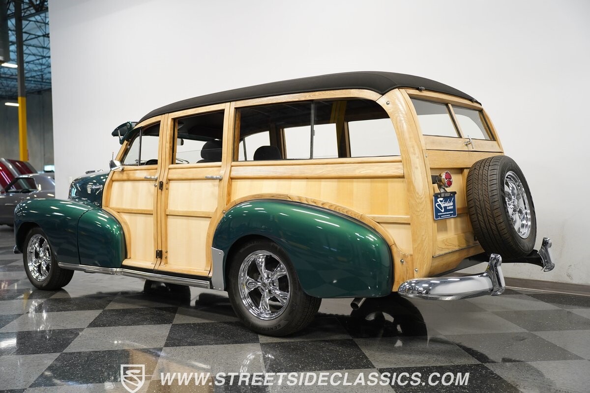 This 1947 Chevrolet Fleetmaster Woody Wagon keeps the good times rolling, thanks to the Goodwrench 350 crate motor fed by a Holley four-barrel carburetor and an Edelbrock performer intake. The HEI distributor ensures reliable ignition, and it's all managed through a 700R4 4-speed automatic transmission. The engine bay is a model of cleanliness and organization, with tidy wiring and proper clamps showcasing meticulous attention to detail. With power disc brakes in the front and drums in the rear, a Mustang 2 front end, and a Ford 9-inch rear axle, along with an added rear sway bar, this wagon's performance is enhanced, making every journey, whether to a show or a family outing, an experience to cherish.