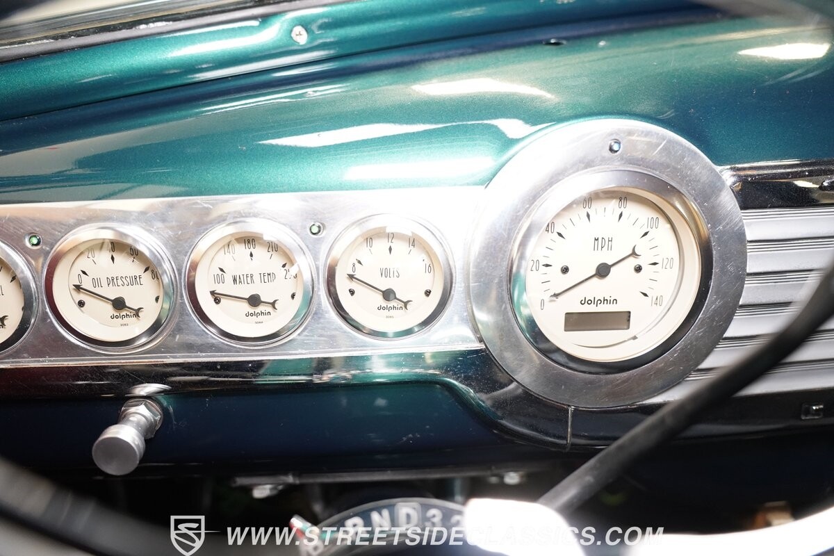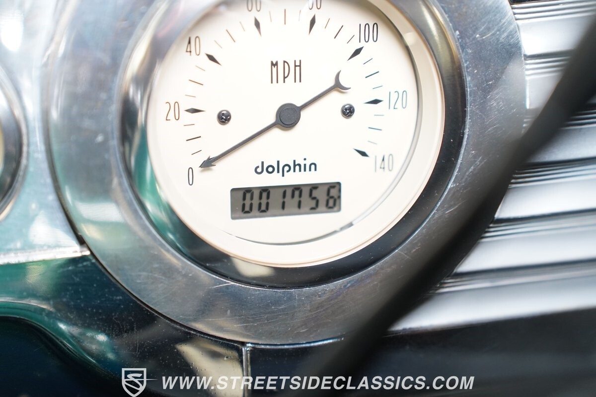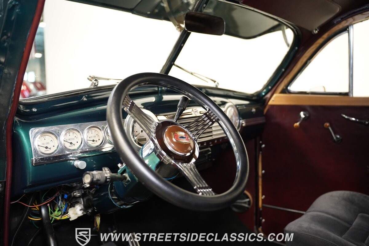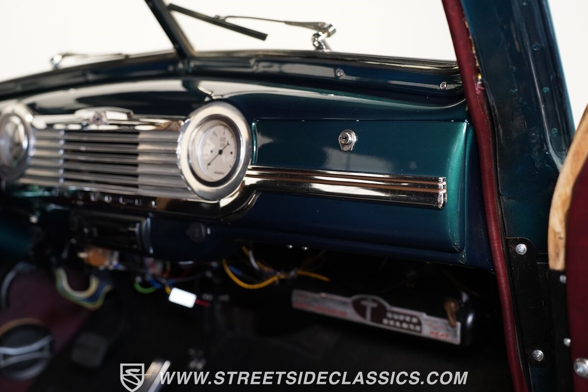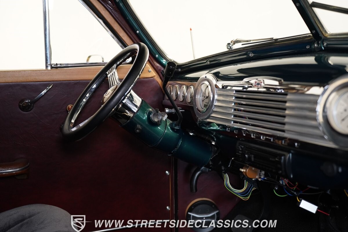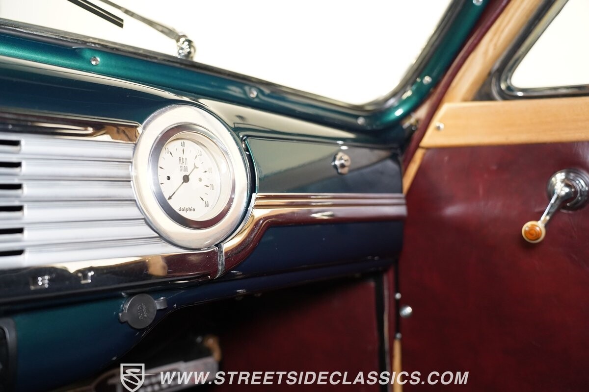 Inside the 1947 Chevrolet Fleetmaster Woody Wagon, you'll find an inviting maroon and gray interior. The front boasts elevated gray cloth bucket seats, while the rear retains its original-style bench, adorned in red vinyl that echoes the wagon's vibrant exterior. Above, a genuine wooden roof with grain that tells tales of past journeys. The partially vinyl headlined interior seamlessly transitions into treated wood slats, creating an atmosphere of rustic elegance. Modern chrome accents, such as the steering wheel and tilt column, add a contemporary touch. The exterior-matching dash features Dolphin gauges, meticulously monitoring every detail of your drive. With an aftermarket Sony head unit, your beach-bound journeys are accompanied by the perfect soundtrack, turning every mile into a cherished memory.