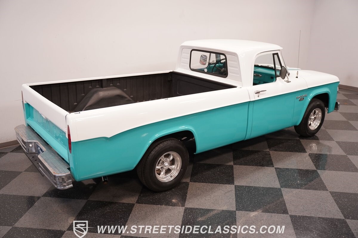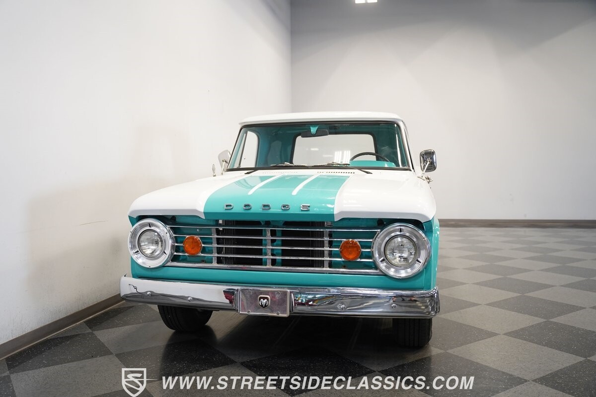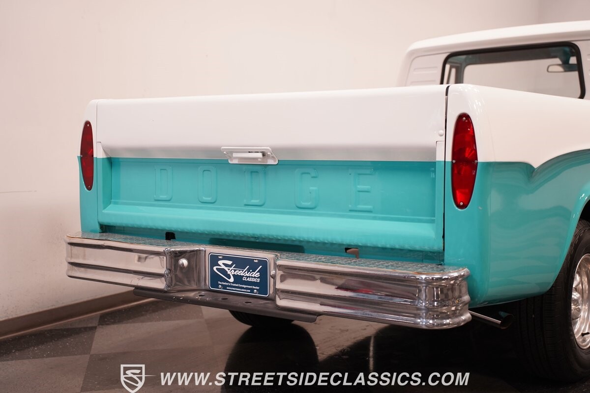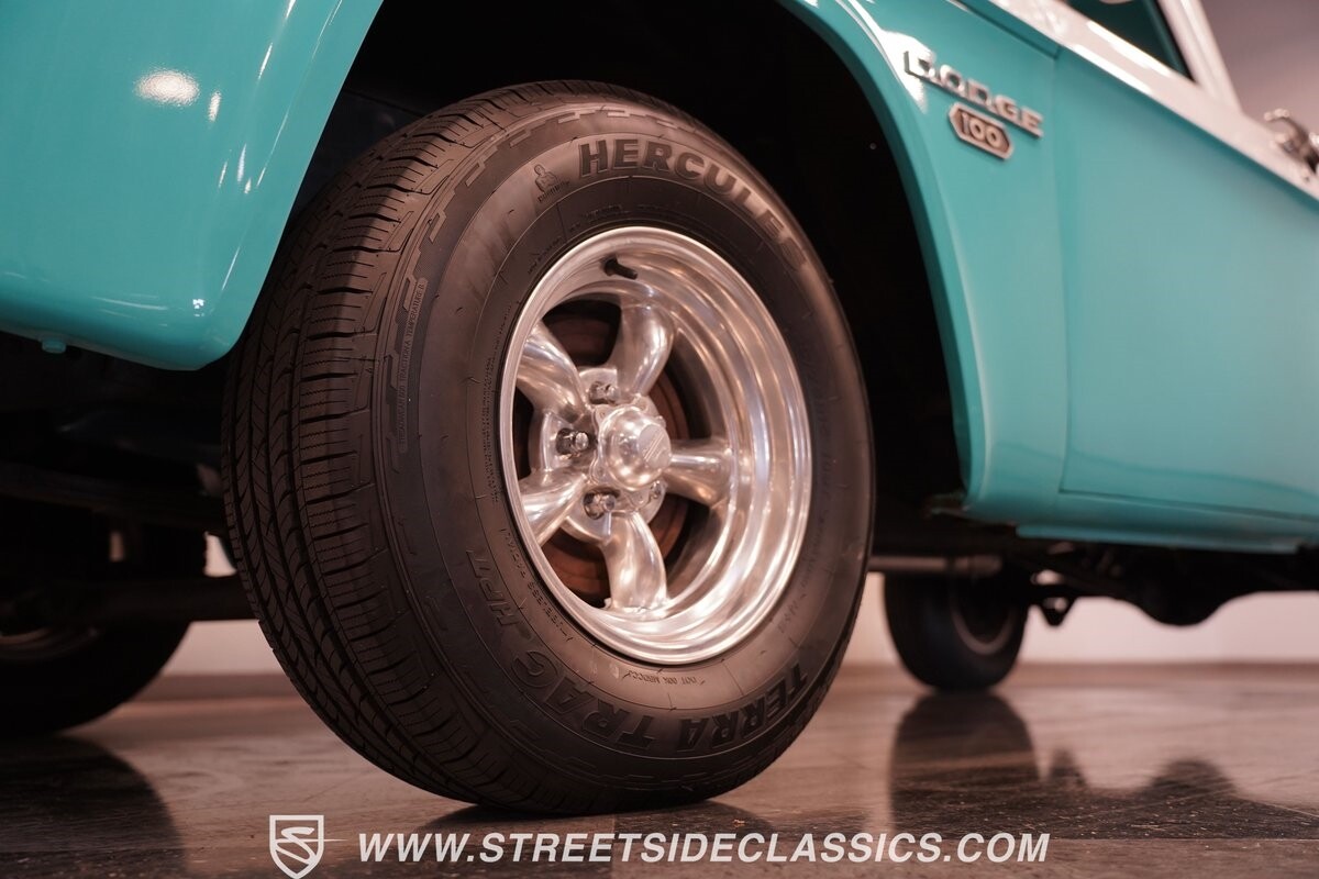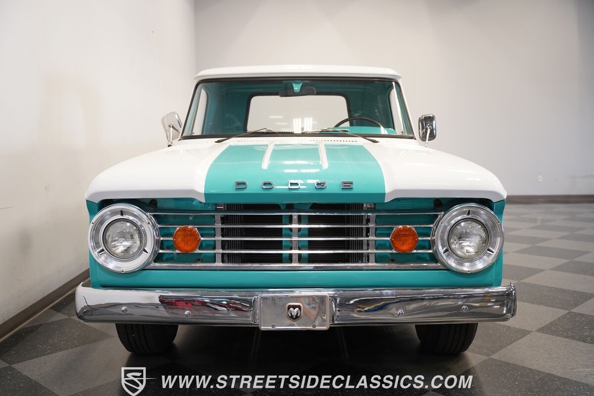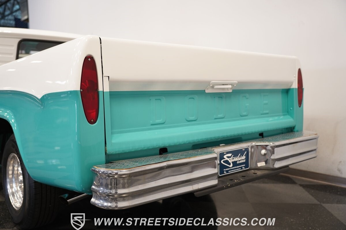 Radiating a retro vibe that's hard to overlook, this 1966 Dodge D100 pickup dazzles with its vibrant two-tone teal and white paint job, perfectly encapsulating the spirit of the era. Not just a feast for the eyes, the truck features a side-exit exhaust that hints at its rugged capabilities and a diamond plate rear bumper that matches its sturdy front counterpart. The truck bed, lined with a tough material, is ready for any challenge, while the 15" American Racing wheels, wrapped in 235/75R15 tires, solidify its robust stance.