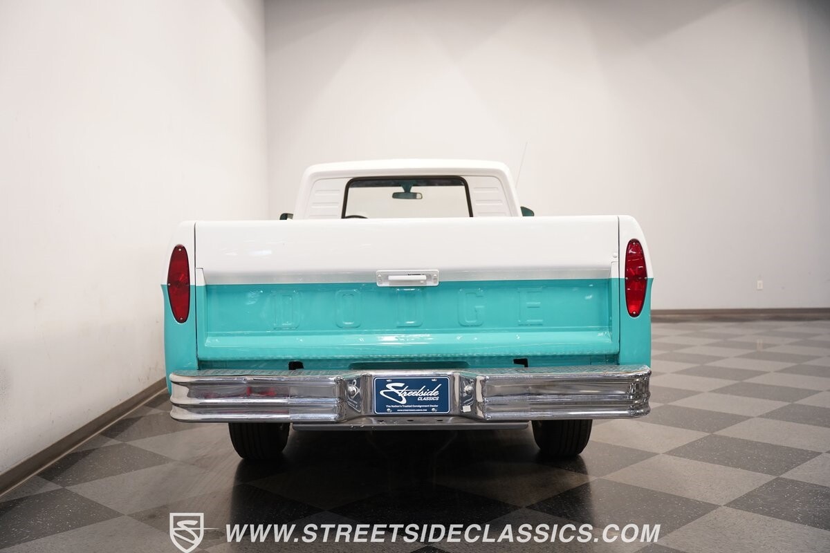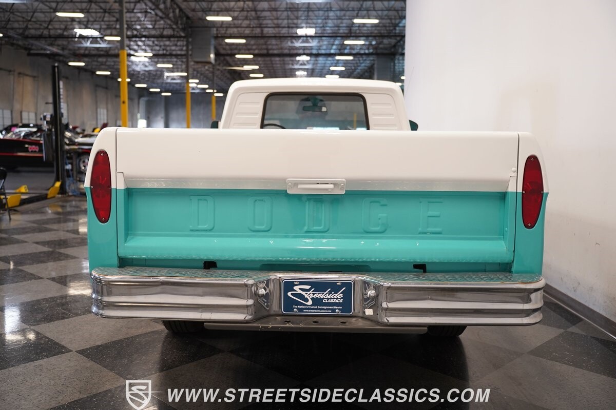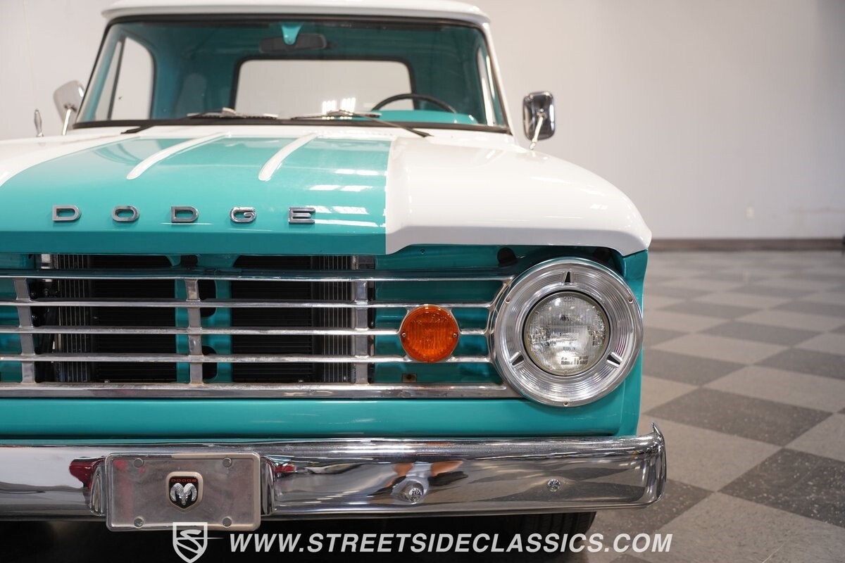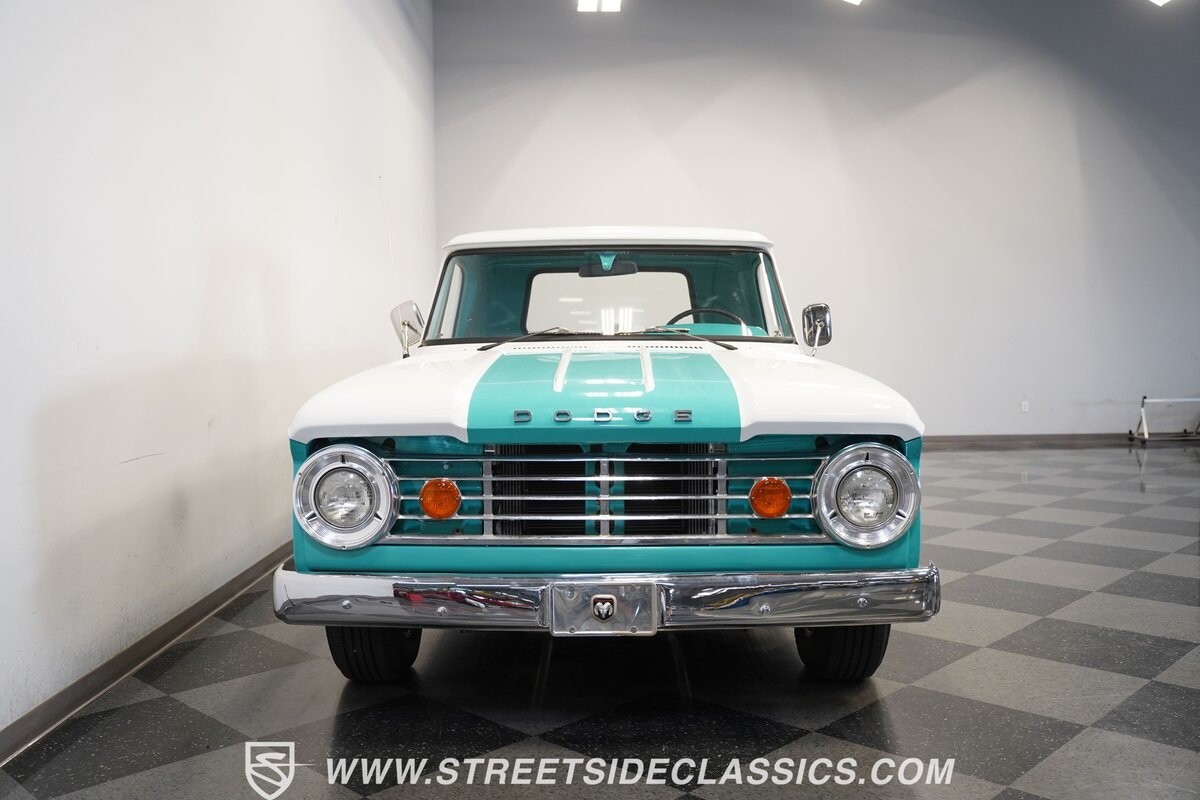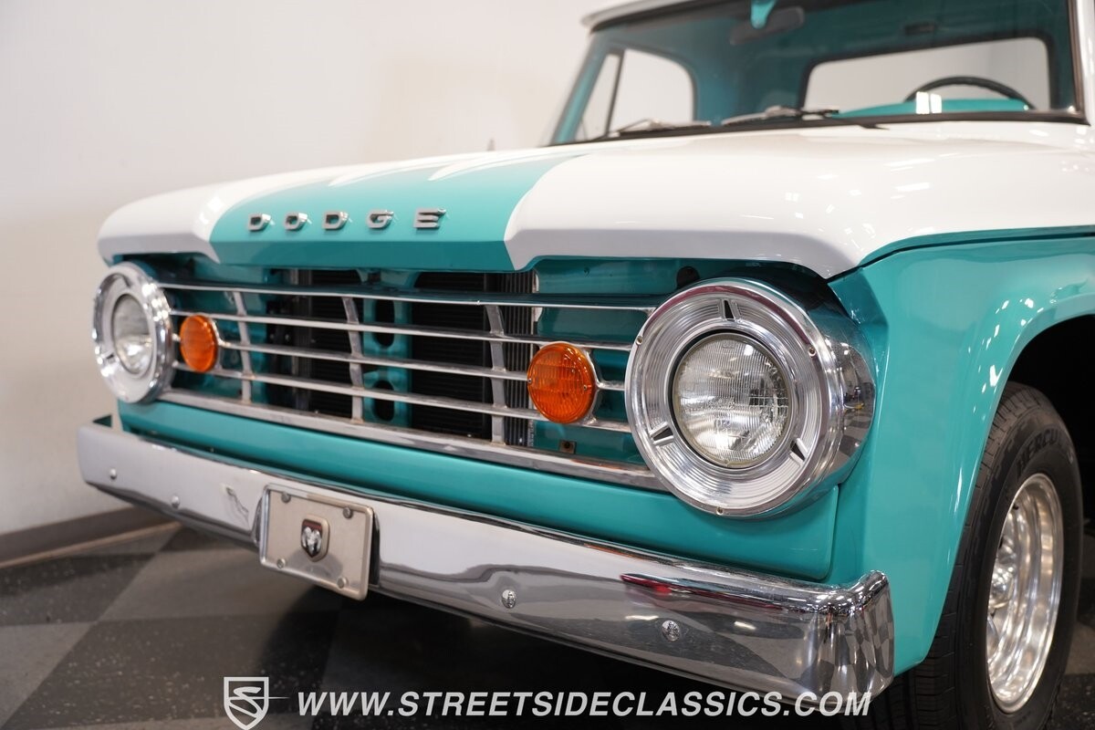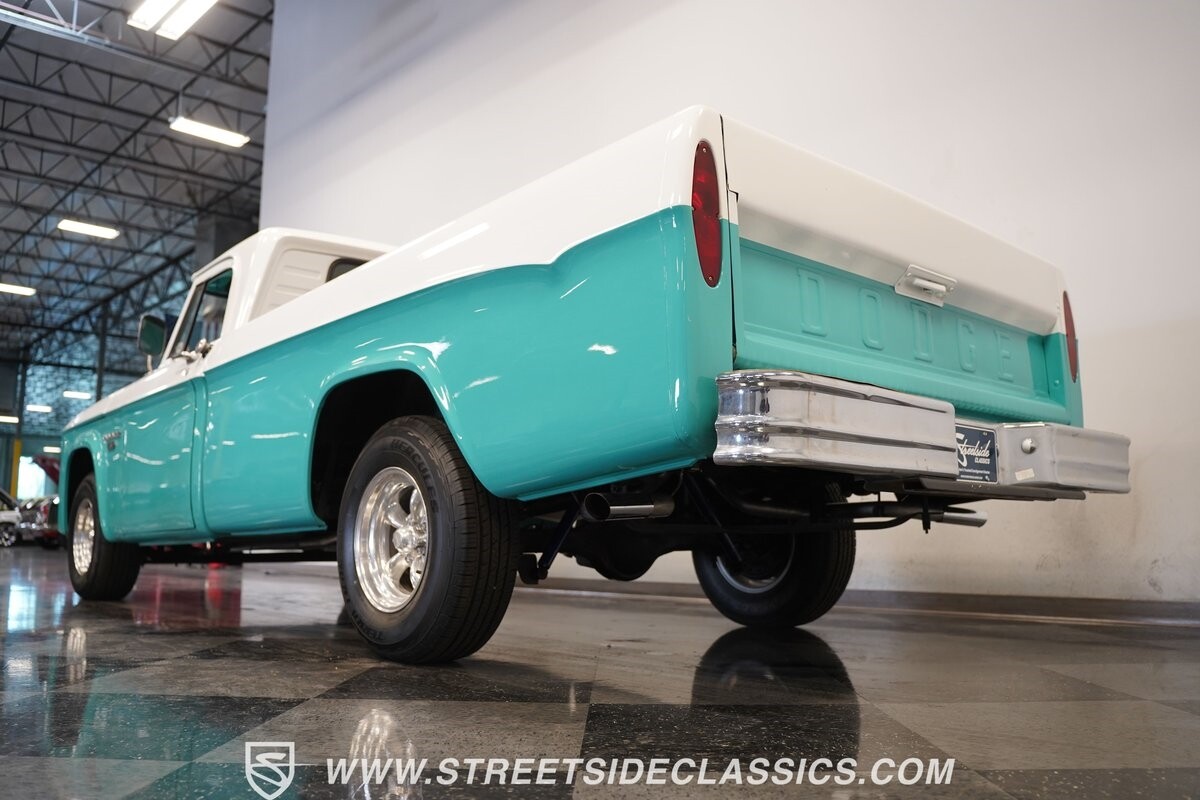 Radiating a retro vibe that's hard to overlook, this 1966 Dodge D100 pickup dazzles with its vibrant two-tone teal and white paint job, perfectly encapsulating the spirit of the era. Not just a feast for the eyes, the truck features a side-exit exhaust that hints at its rugged capabilities and a diamond plate rear bumper that matches its sturdy front counterpart. The truck bed, lined with a tough material, is ready for any challenge, while the 15" American Racing wheels, wrapped in 235/75R15 tires, solidify its robust stance.