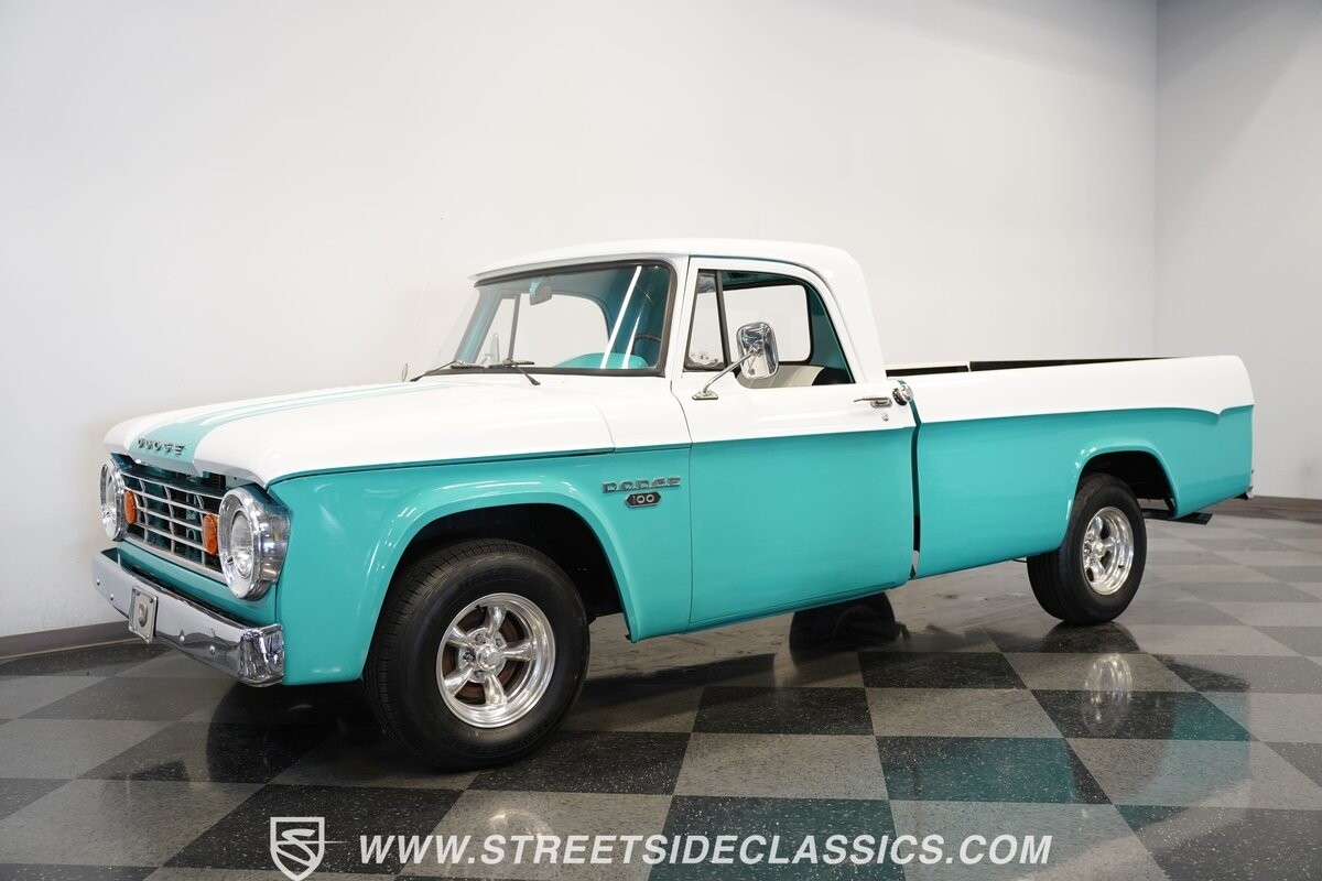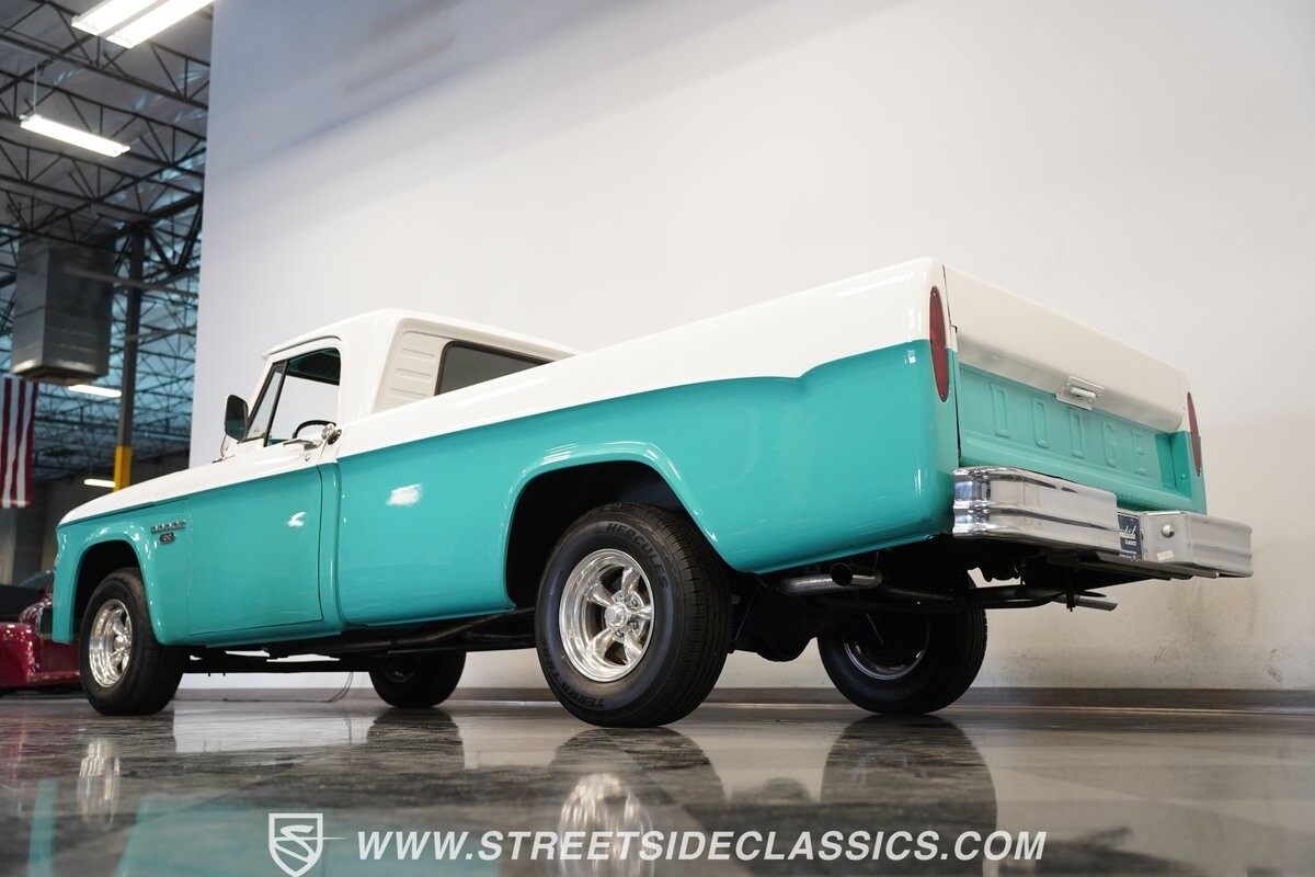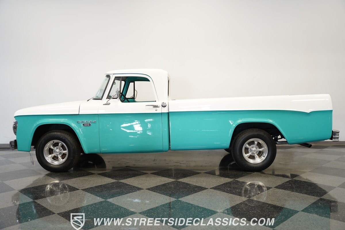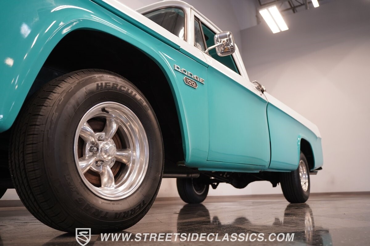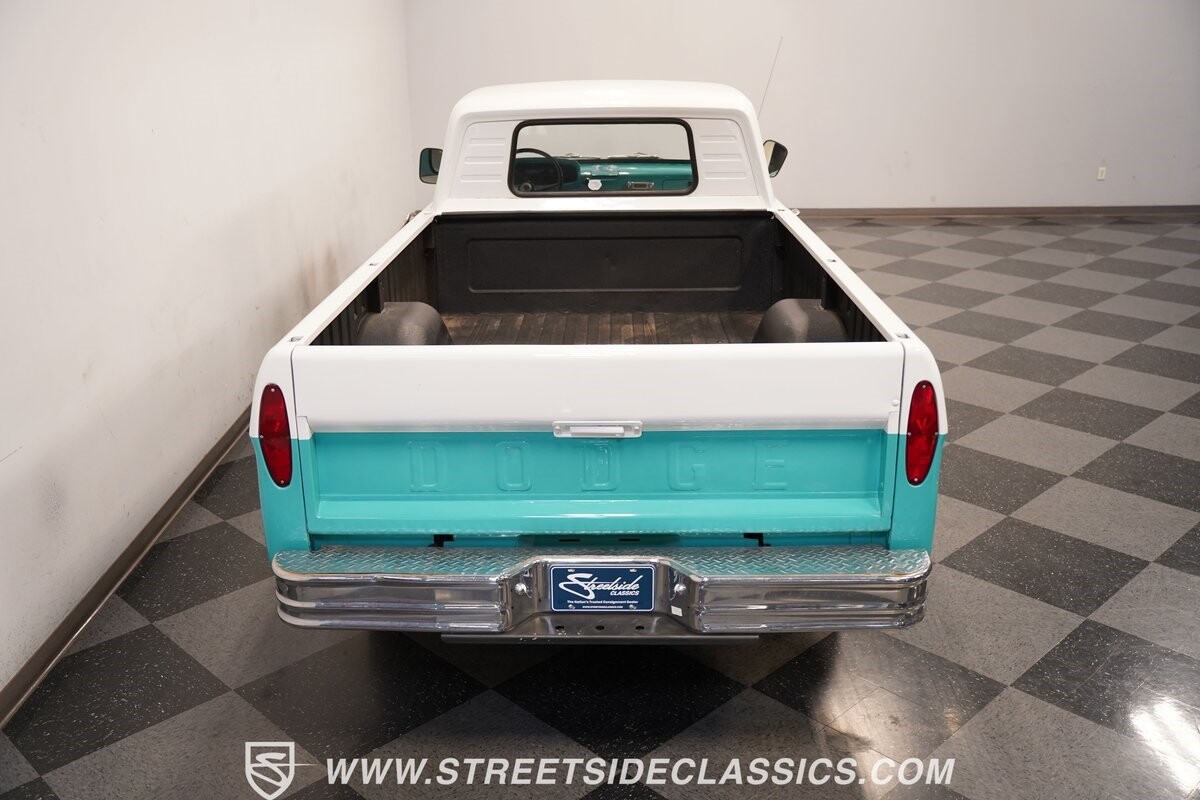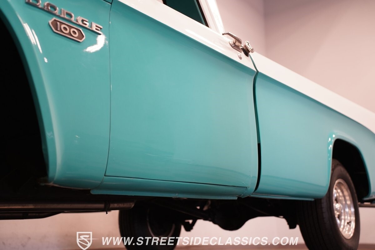 Radiating a retro vibe that's hard to overlook, this 1966 Dodge D100 pickup dazzles with its vibrant two-tone teal and white paint job, perfectly encapsulating the spirit of the era. Not just a feast for the eyes, the truck features a side-exit exhaust that hints at its rugged capabilities and a diamond plate rear bumper that matches its sturdy front counterpart. The truck bed, lined with a tough material, is ready for any challenge, while the 15" American Racing wheels, wrapped in 235/75R15 tires, solidify its robust stance.