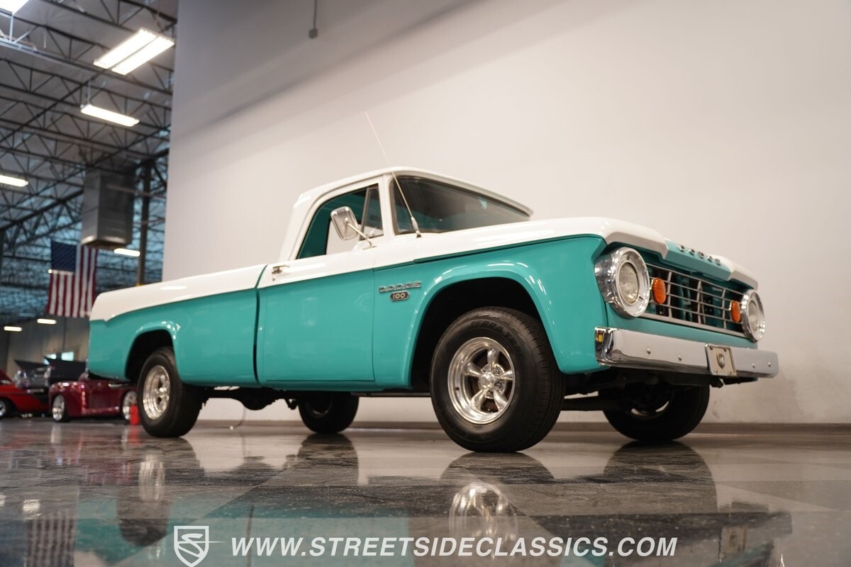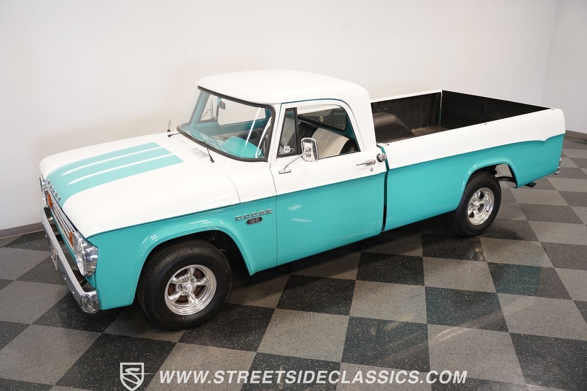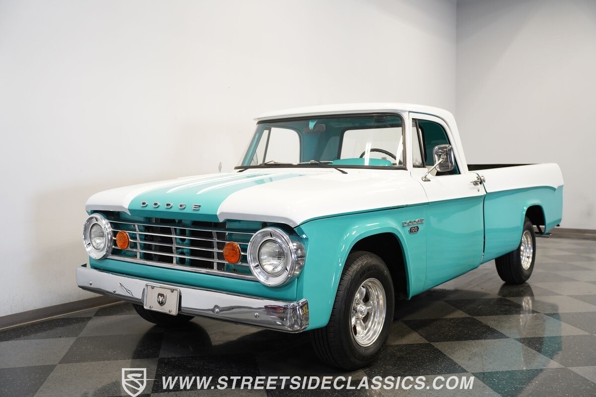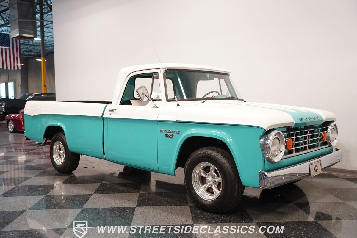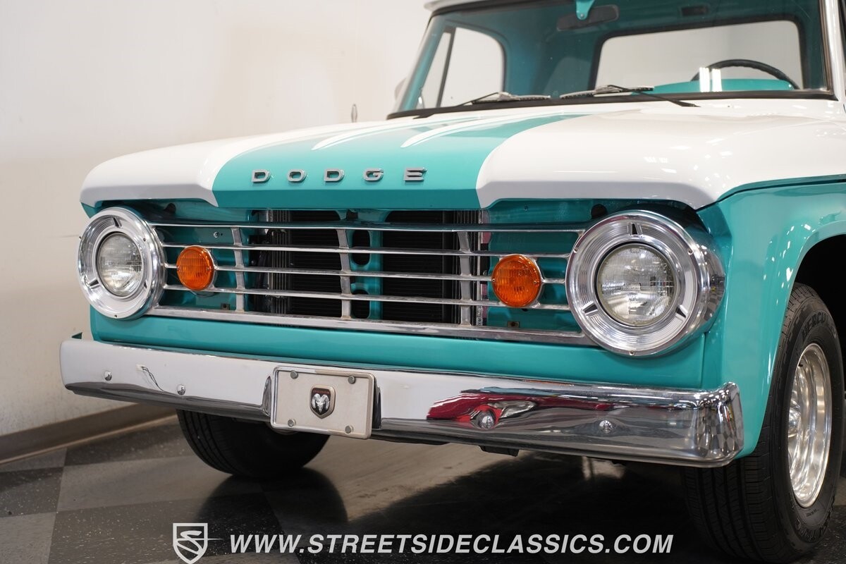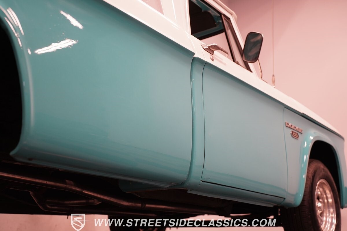 Radiating a retro vibe that's hard to overlook, this 1966 Dodge D100 pickup dazzles with its vibrant two-tone teal and white paint job, perfectly encapsulating the spirit of the era. Not just a feast for the eyes, the truck features a side-exit exhaust that hints at its rugged capabilities and a diamond plate rear bumper that matches its sturdy front counterpart. The truck bed, lined with a tough material, is ready for any challenge, while the 15" American Racing wheels, wrapped in 235/75R15 tires, solidify its robust stance.