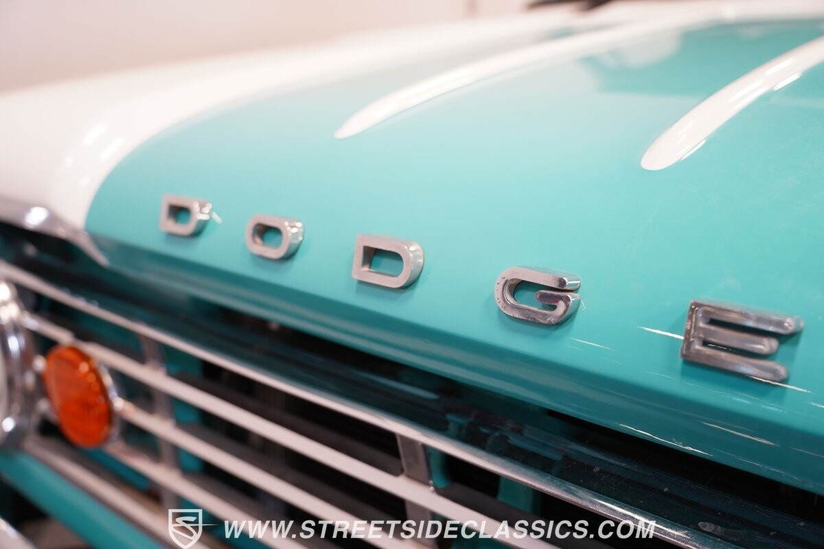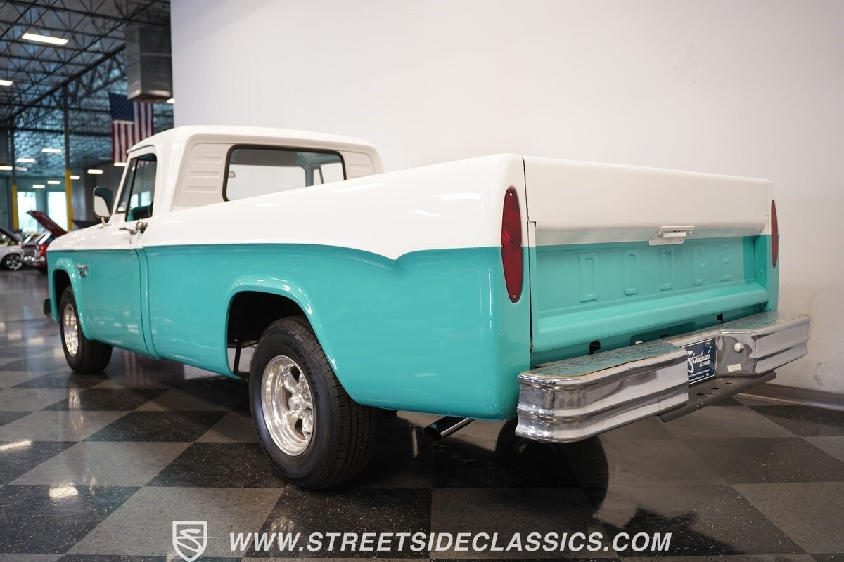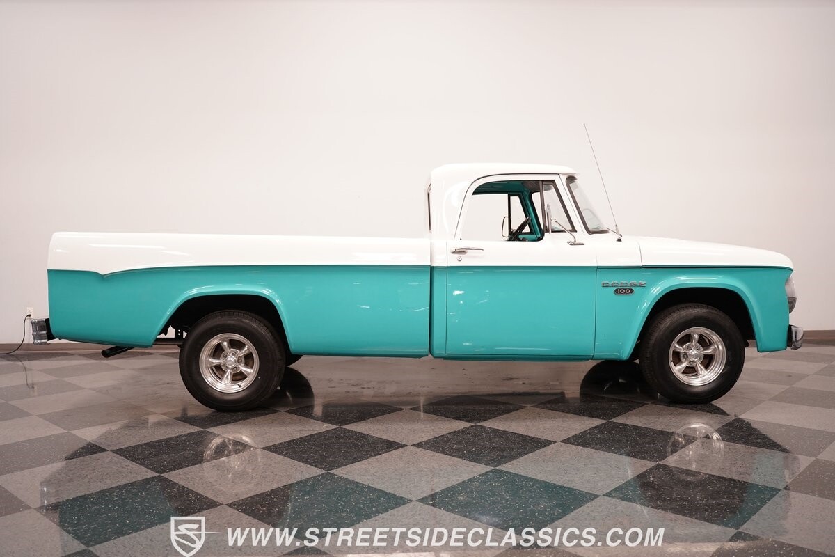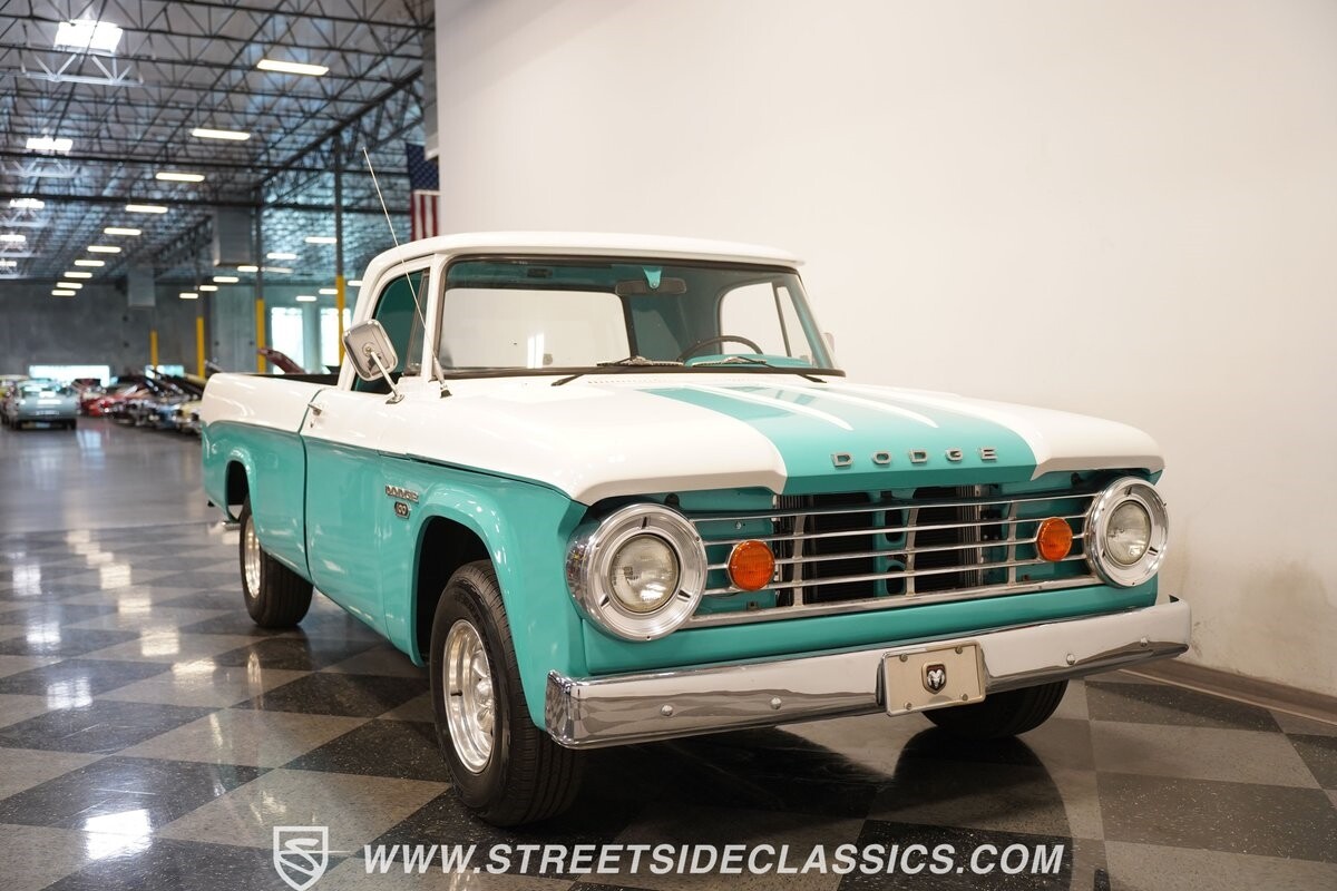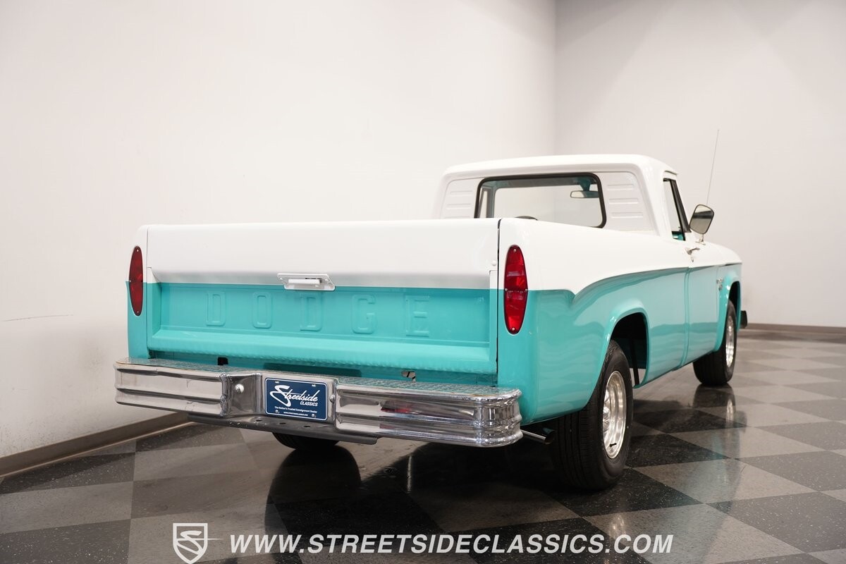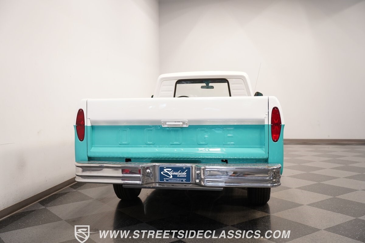 Radiating a retro vibe that's hard to overlook, this 1966 Dodge D100 pickup dazzles with its vibrant two-tone teal and white paint job, perfectly encapsulating the spirit of the era. Not just a feast for the eyes, the truck features a side-exit exhaust that hints at its rugged capabilities and a diamond plate rear bumper that matches its sturdy front counterpart. The truck bed, lined with a tough material, is ready for any challenge, while the 15" American Racing wheels, wrapped in 235/75R15 tires, solidify its robust stance.
