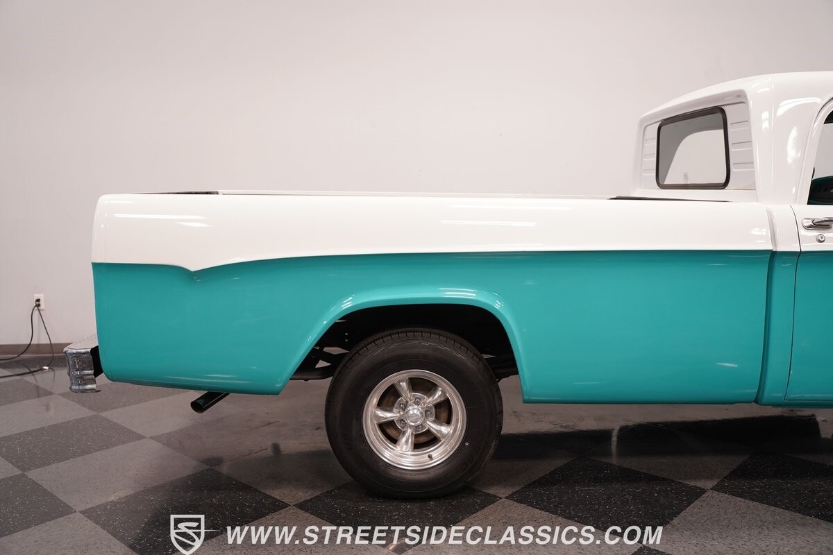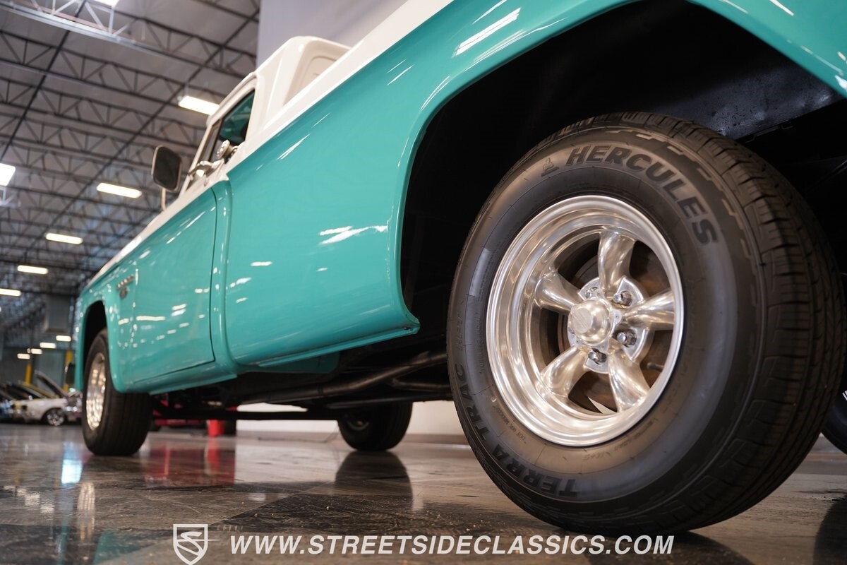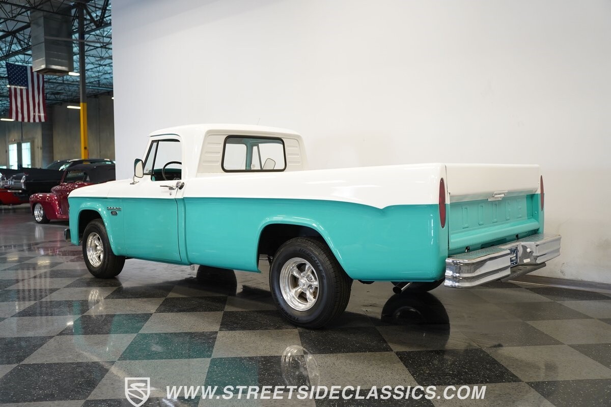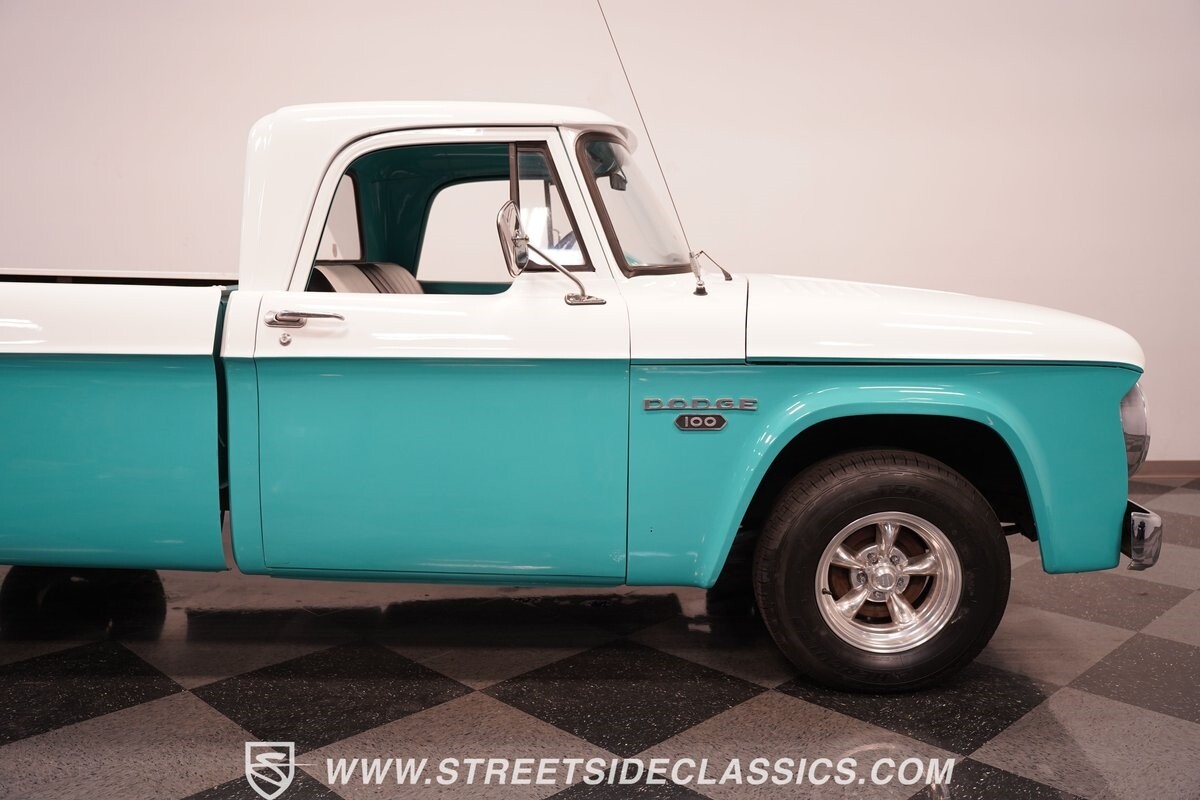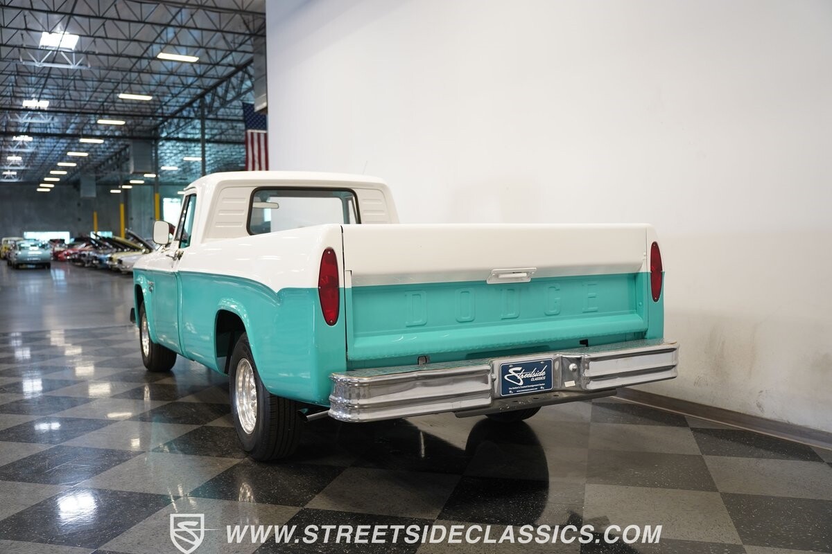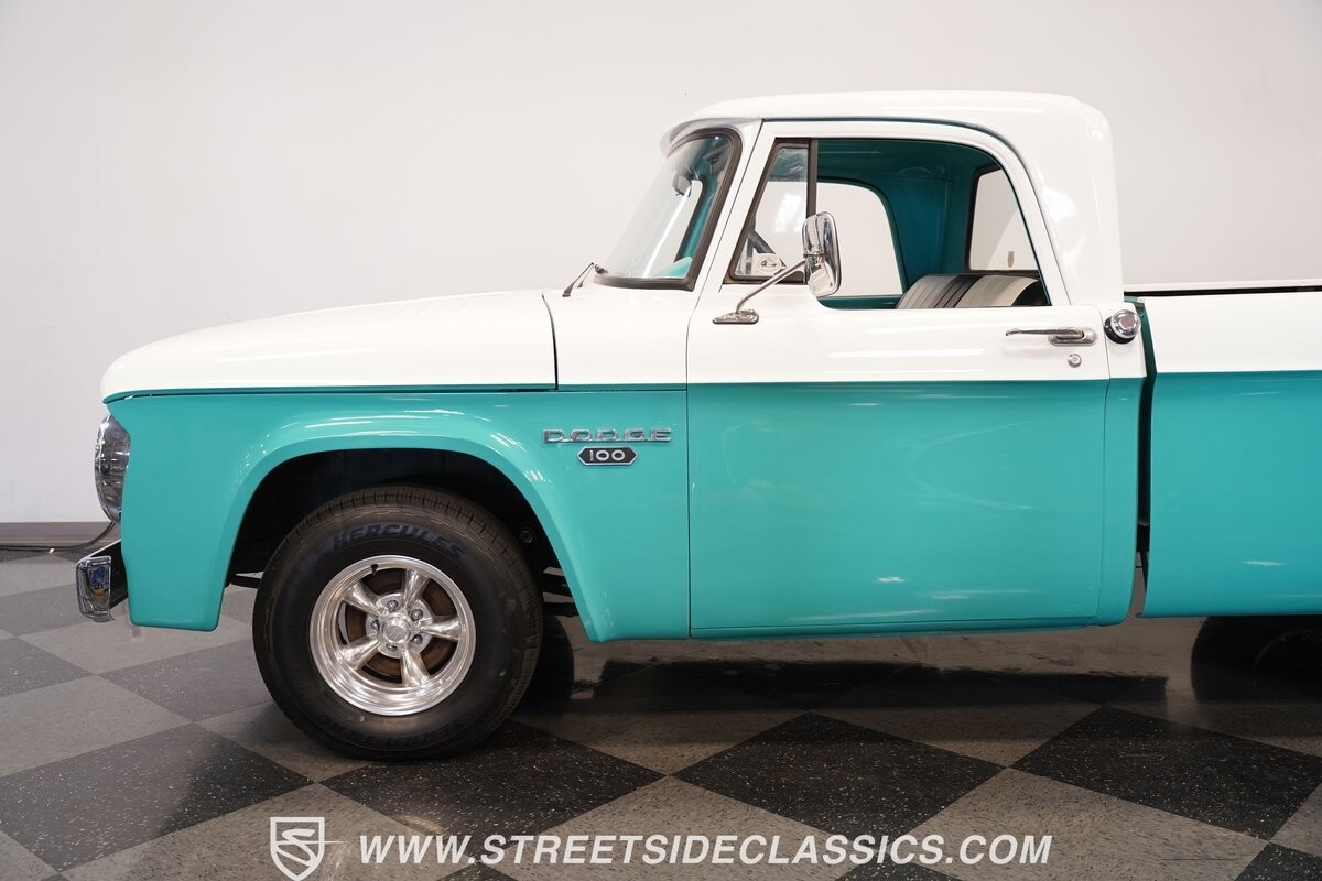 Radiating a retro vibe that's hard to overlook, this 1966 Dodge D100 pickup dazzles with its vibrant two-tone teal and white paint job, perfectly encapsulating the spirit of the era. Not just a feast for the eyes, the truck features a side-exit exhaust that hints at its rugged capabilities and a diamond plate rear bumper that matches its sturdy front counterpart. The truck bed, lined with a tough material, is ready for any challenge, while the 15" American Racing wheels, wrapped in 235/75R15 tires, solidify its robust stance.