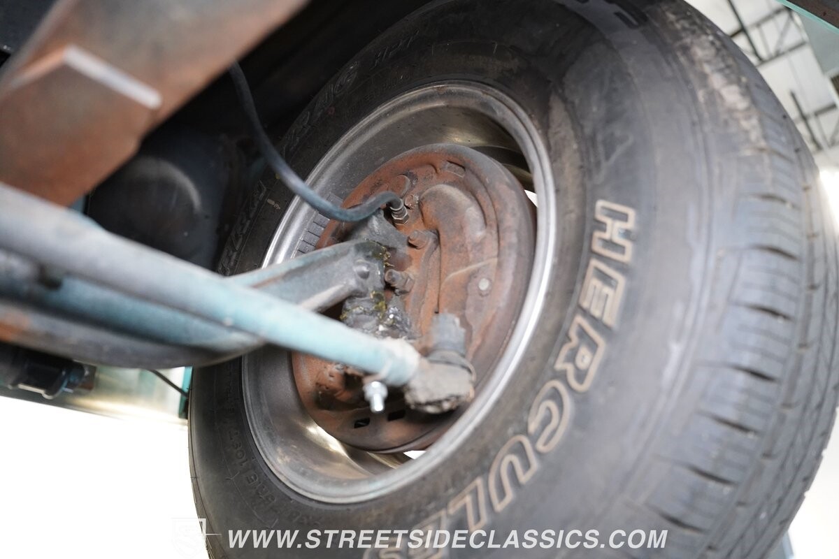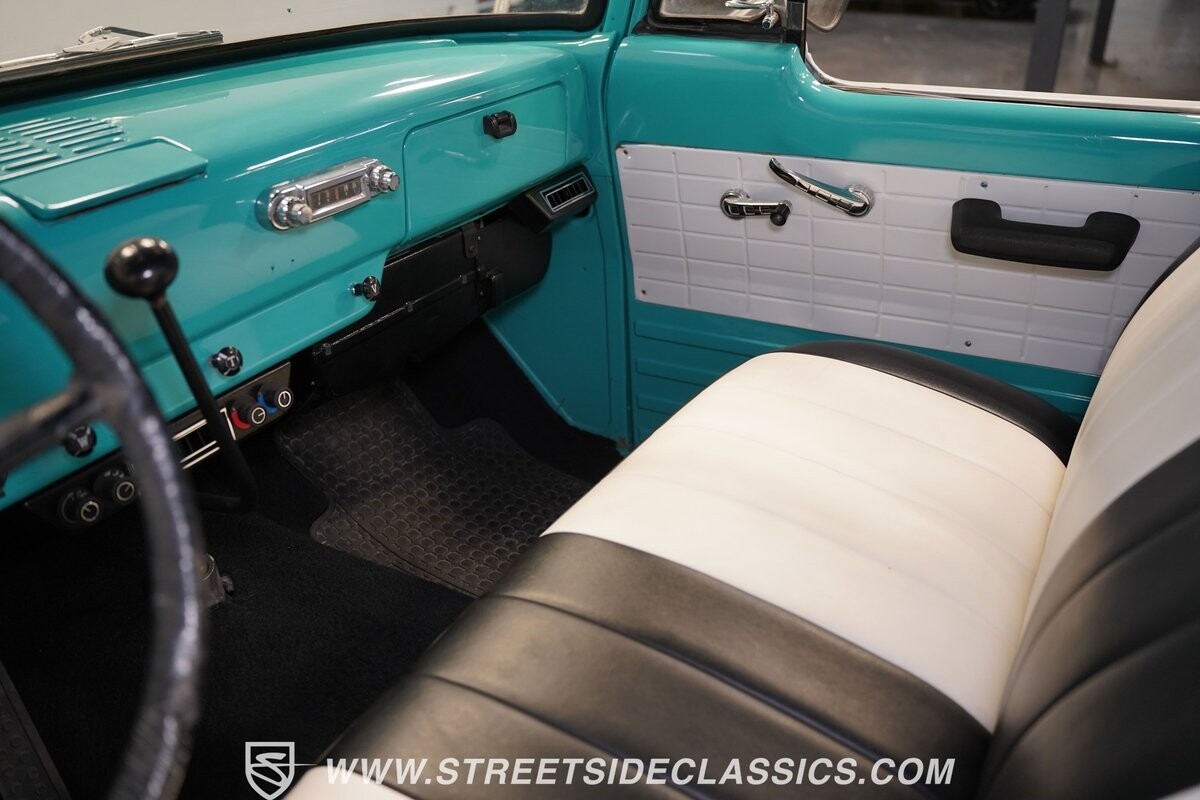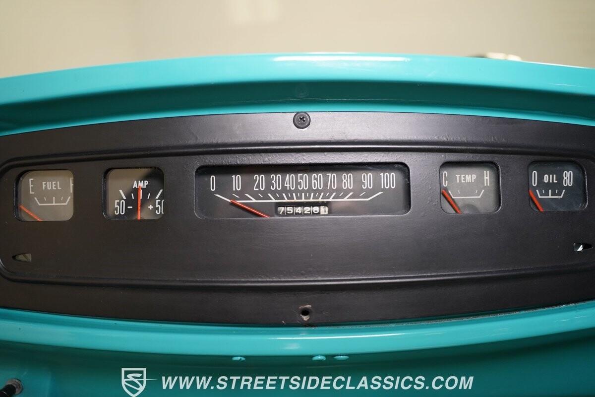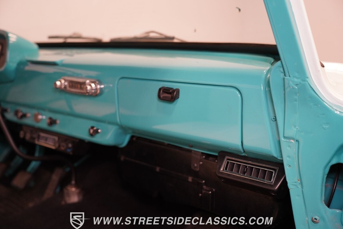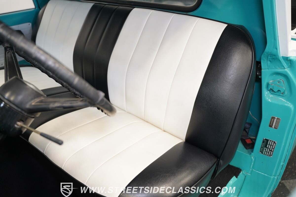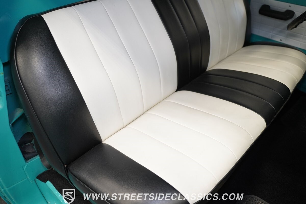 Step inside to a world where vintage charm meets modern convenience. The interior echoes the exterior with a matching teal and white palette, and the original dash, steering wheel, and shifter invite a nostalgic journey. Comfort isn't spared with additions like air conditioning, freshly installed carpet, and a suede headliner. The seating-a striking black and white vinyl bench-promises comfort for the long haul. The blend of mostly original and some updated components like new armrests ensure functionality and style, with documentation from Rob's Quality Automotive to prove the meticulous care taken during its restoration.
