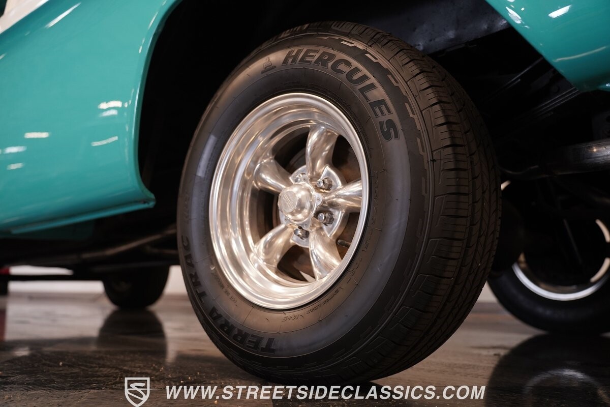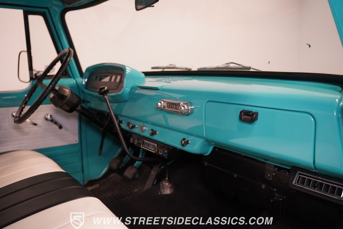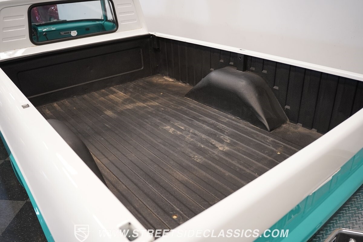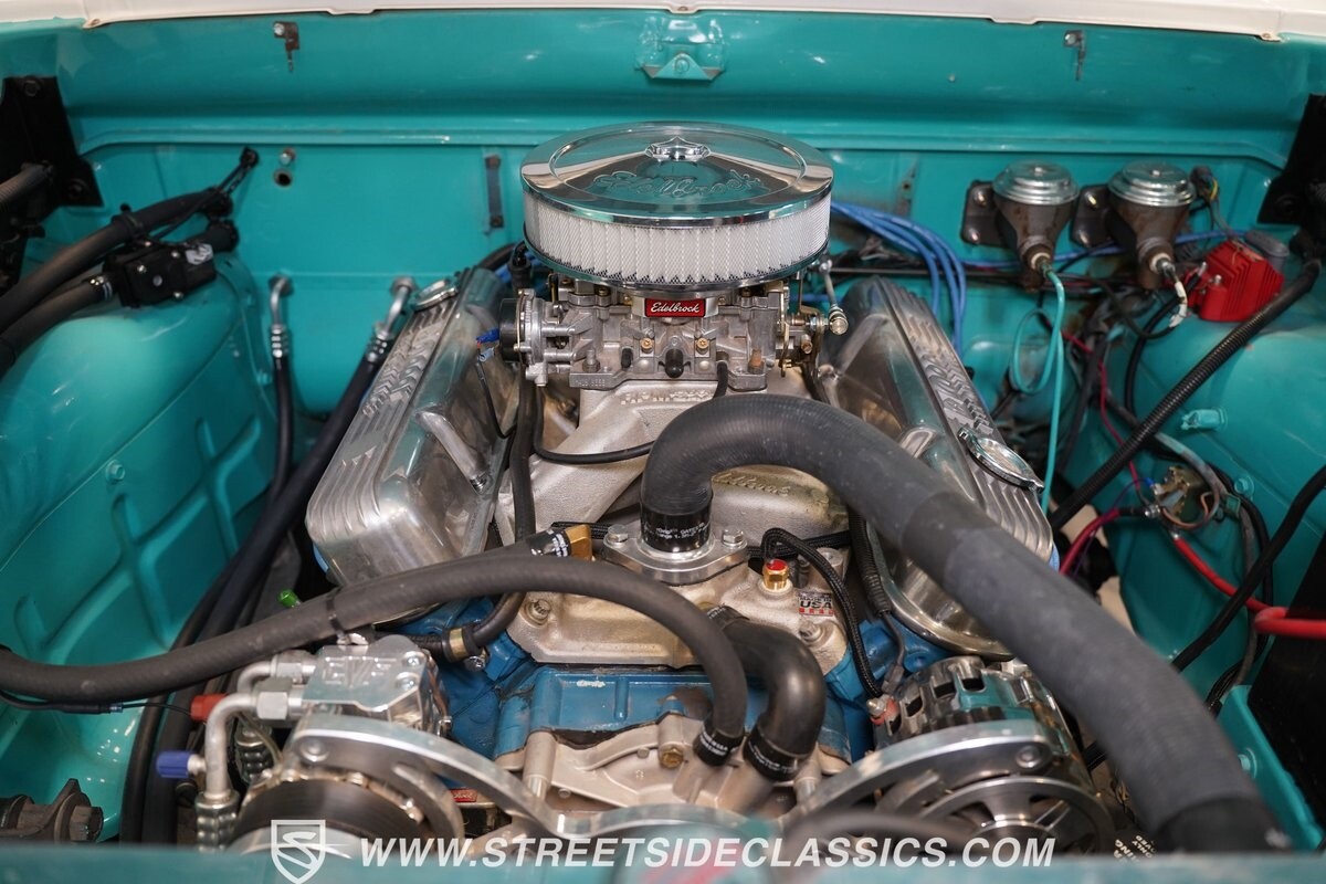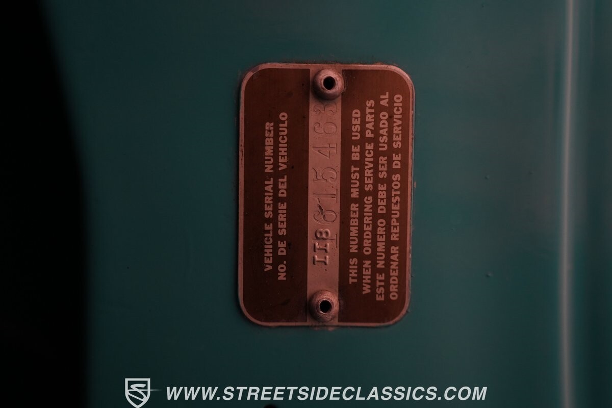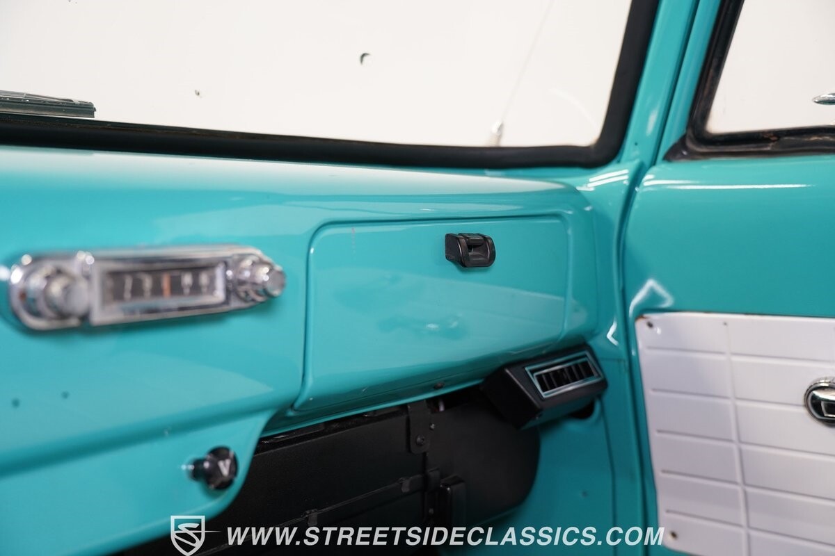 Step inside to a world where vintage charm meets modern convenience. The interior echoes the exterior with a matching teal and white palette, and the original dash, steering wheel, and shifter invite a nostalgic journey. Comfort isn't spared with additions like air conditioning, freshly installed carpet, and a suede headliner. The seating-a striking black and white vinyl bench-promises comfort for the long haul. The blend of mostly original and some updated components like new armrests ensure functionality and style, with documentation from Rob's Quality Automotive to prove the meticulous care taken during its restoration.