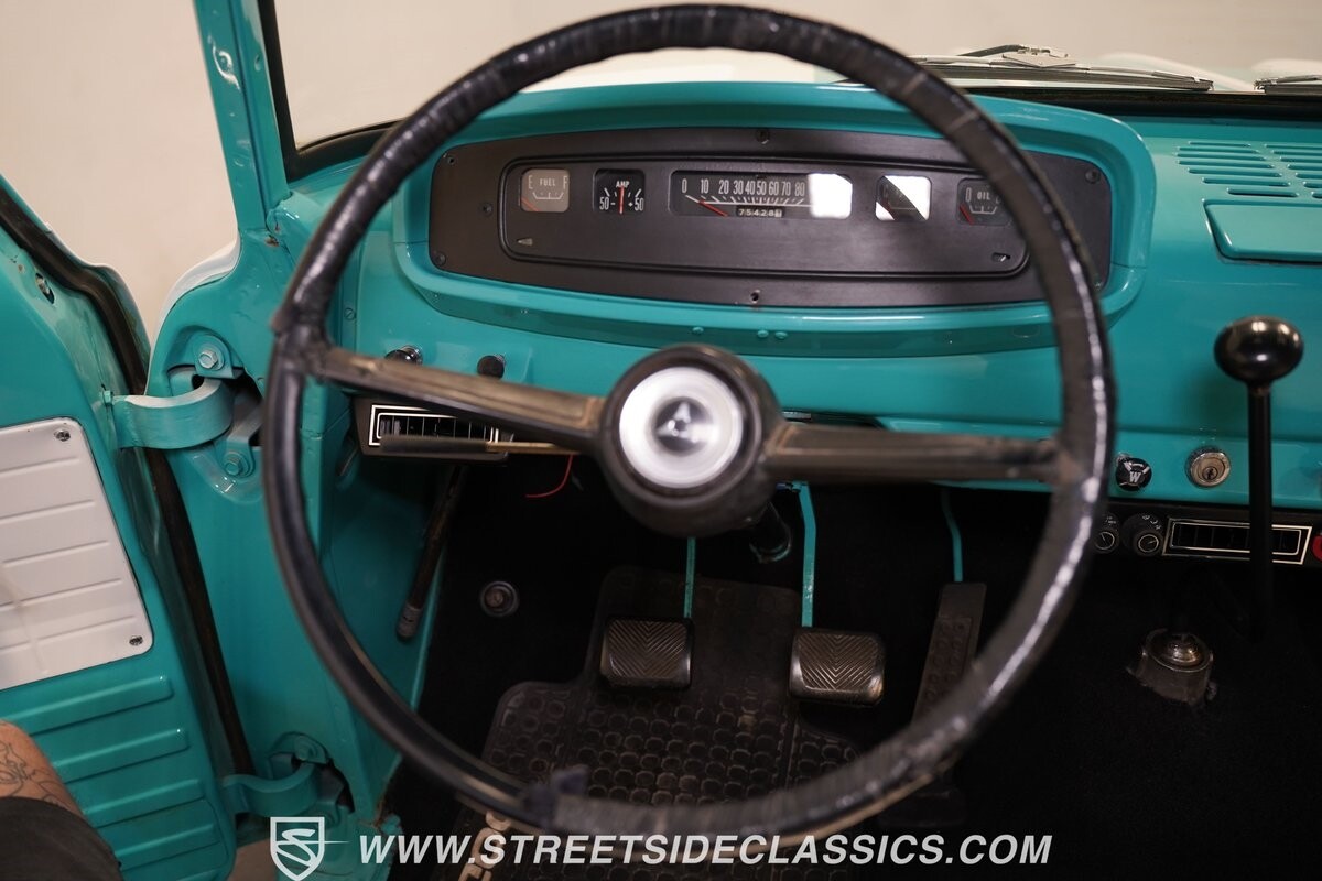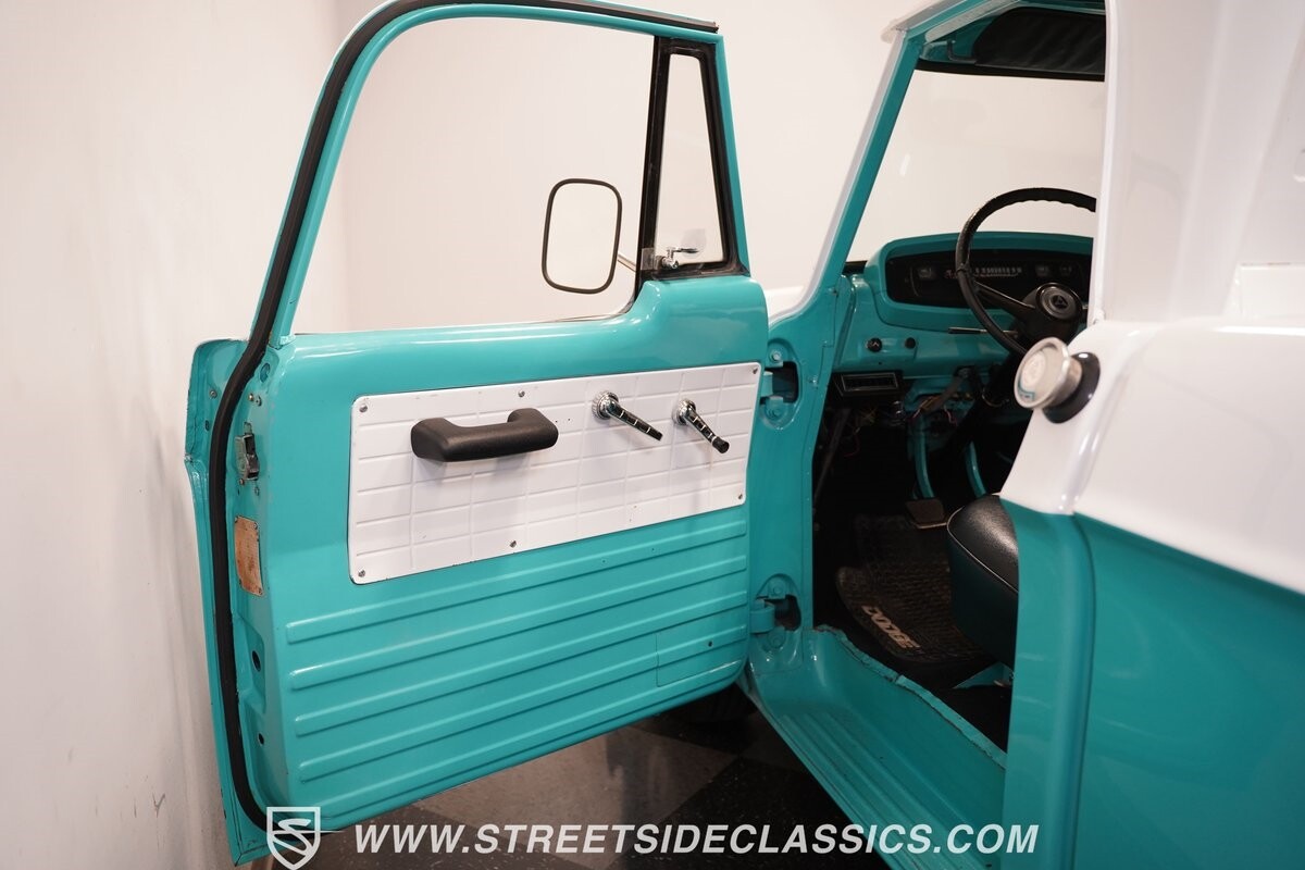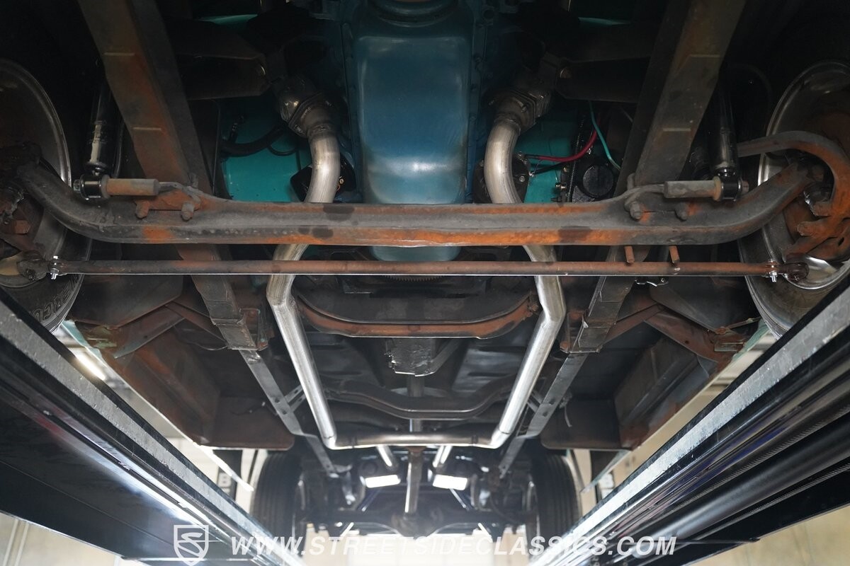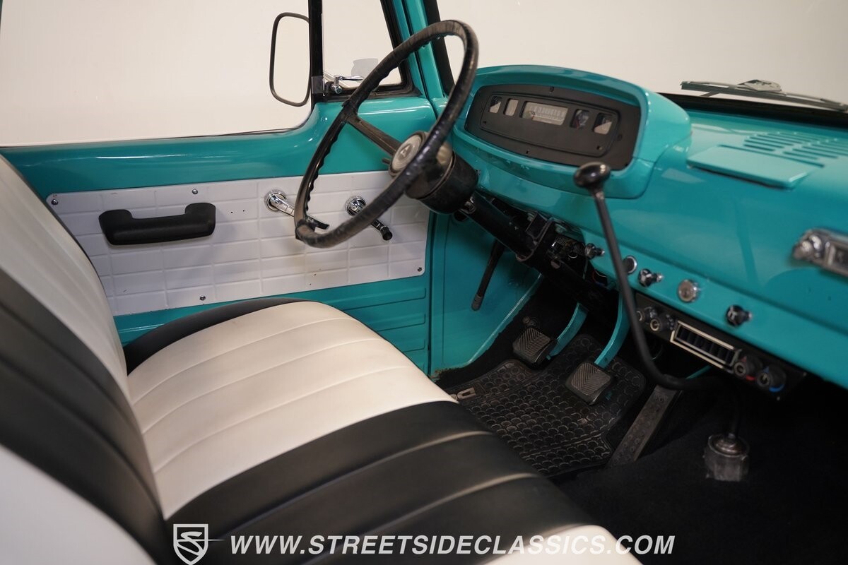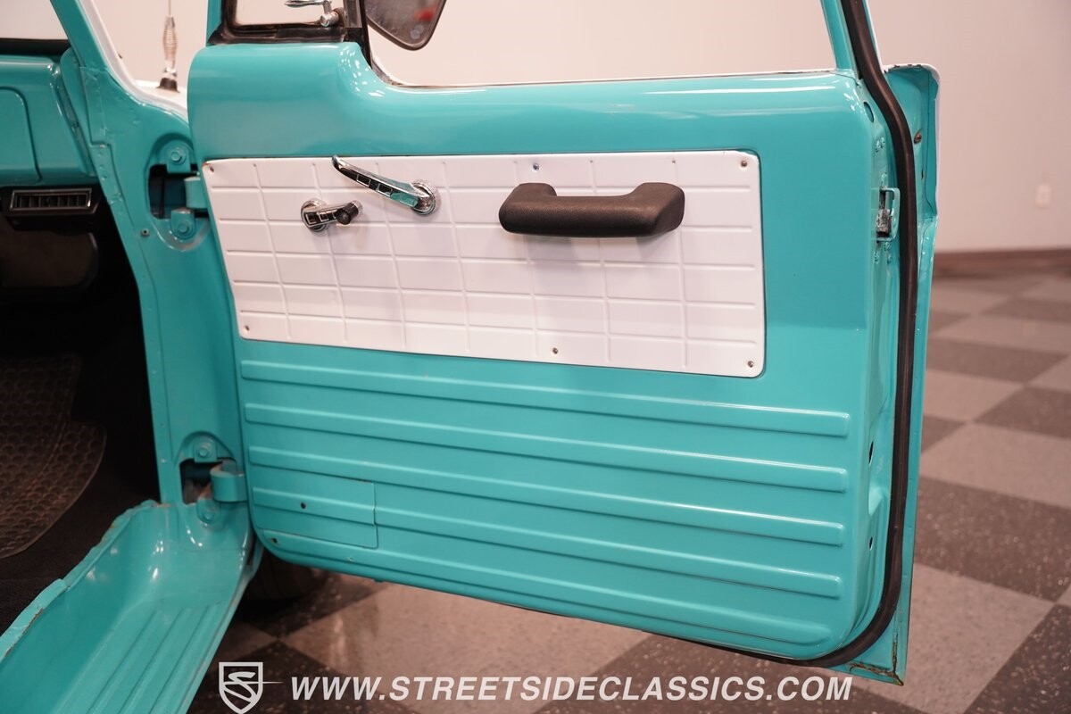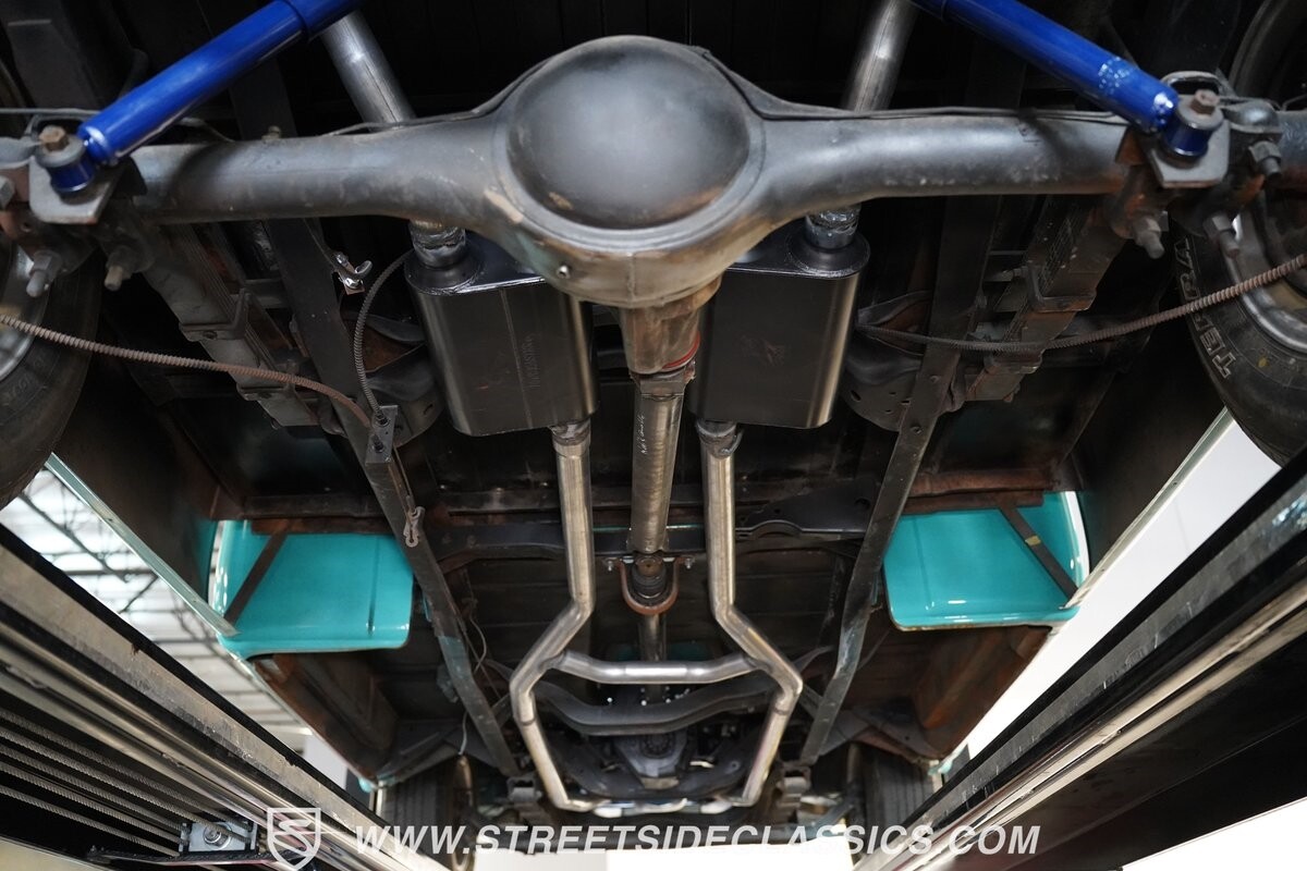 Step inside to a world where vintage charm meets modern convenience. The interior echoes the exterior with a matching teal and white palette, and the original dash, steering wheel, and shifter invite a nostalgic journey. Comfort isn't spared with additions like air conditioning, freshly installed carpet, and a suede headliner. The seating-a striking black and white vinyl bench-promises comfort for the long haul. The blend of mostly original and some updated components like new armrests ensure functionality and style, with documentation from Rob's Quality Automotive to prove the meticulous care taken during its restoration.