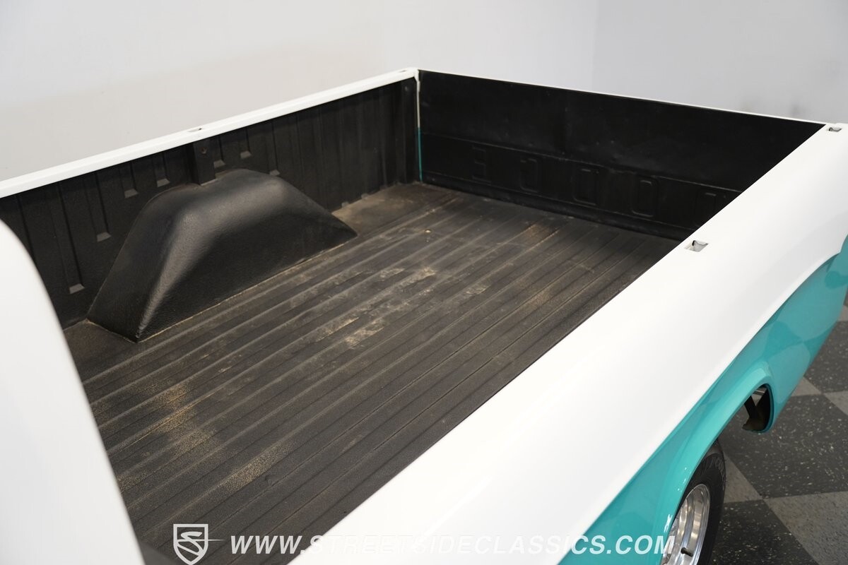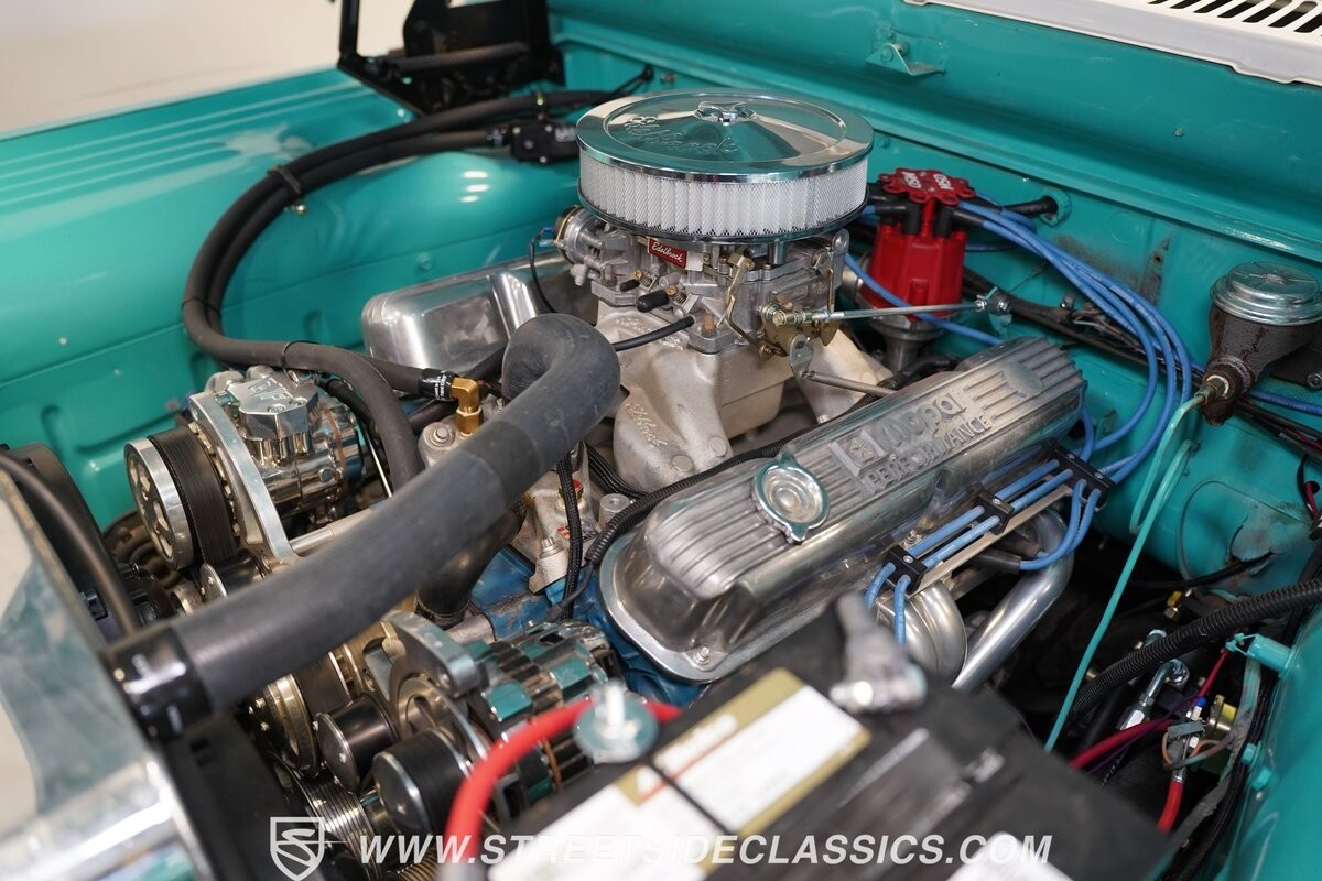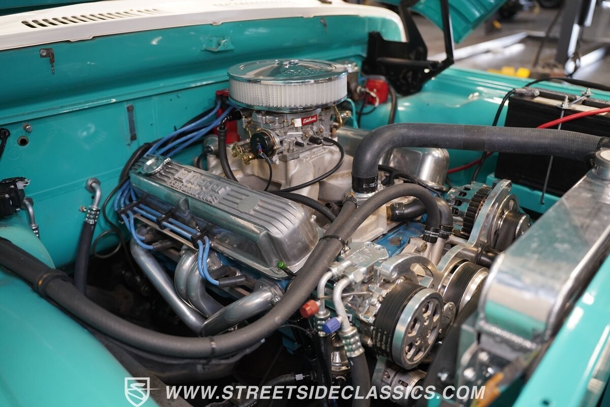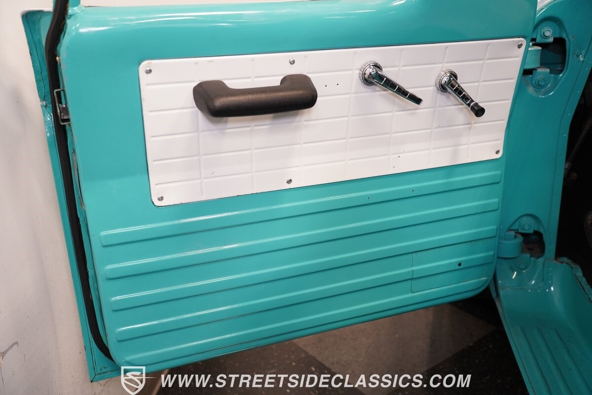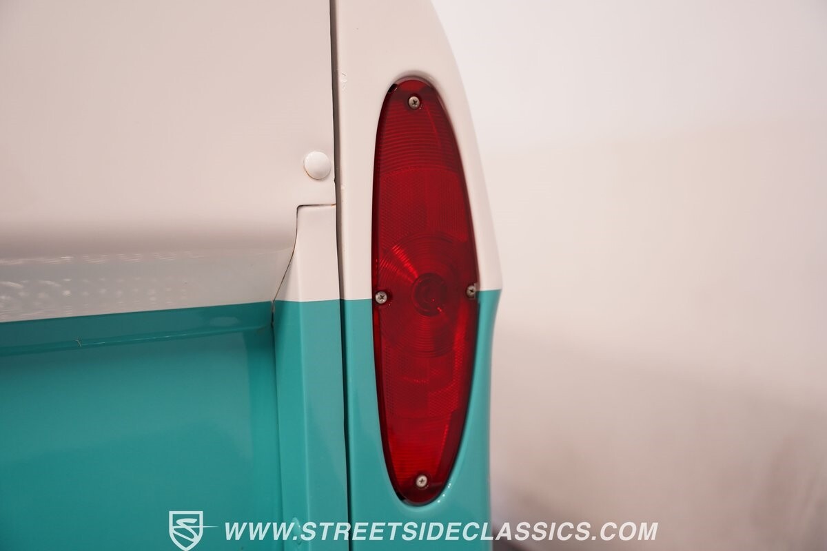 Step inside to a world where vintage charm meets modern convenience. The interior echoes the exterior with a matching teal and white palette, and the original dash, steering wheel, and shifter invite a nostalgic journey. Comfort isn't spared with additions like air conditioning, freshly installed carpet, and a suede headliner. The seating-a striking black and white vinyl bench-promises comfort for the long haul. The blend of mostly original and some updated components like new armrests ensure functionality and style, with documentation from Rob's Quality Automotive to prove the meticulous care taken during its restoration.