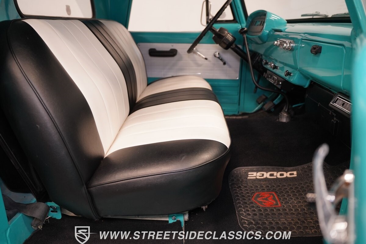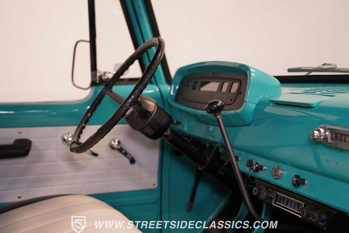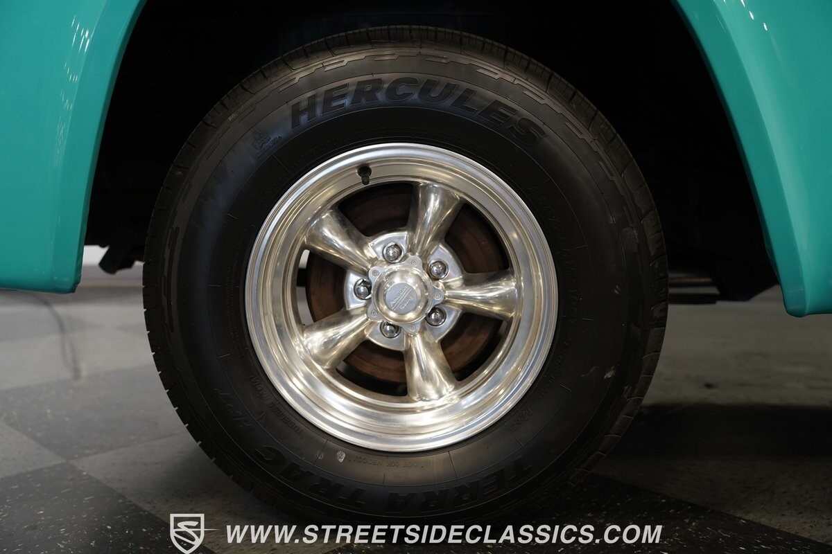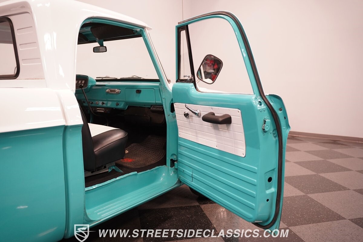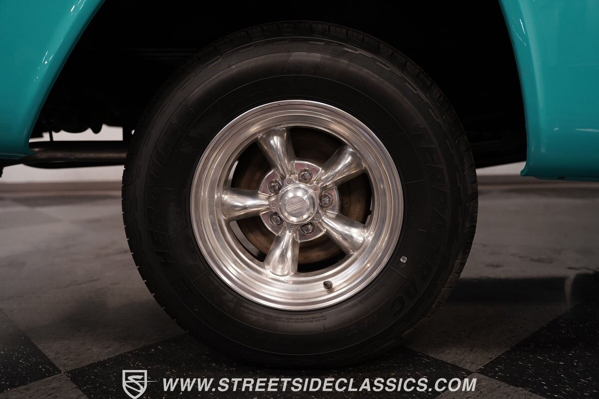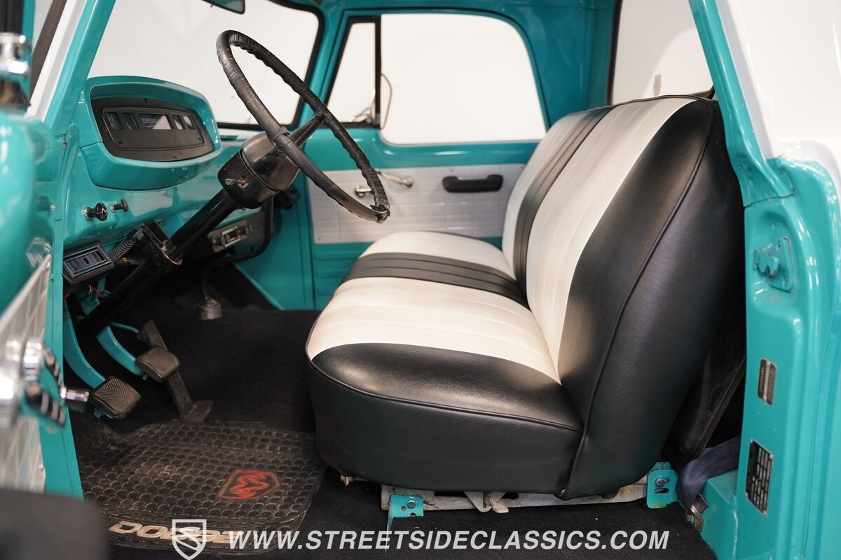 Step inside to a world where vintage charm meets modern convenience. The interior echoes the exterior with a matching teal and white palette, and the original dash, steering wheel, and shifter invite a nostalgic journey. Comfort isn't spared with additions like air conditioning, freshly installed carpet, and a suede headliner. The seating-a striking black and white vinyl bench-promises comfort for the long haul. The blend of mostly original and some updated components like new armrests ensure functionality and style, with documentation from Rob's Quality Automotive to prove the meticulous care taken during its restoration.