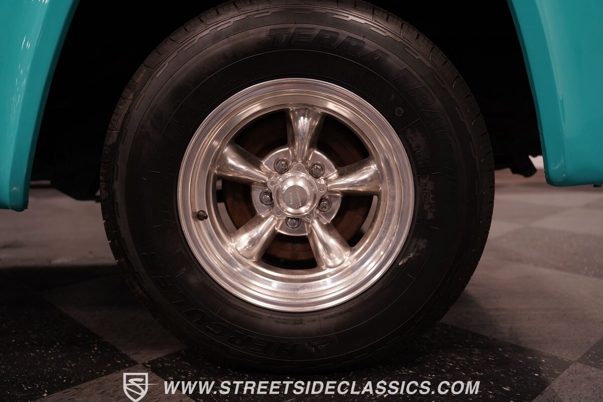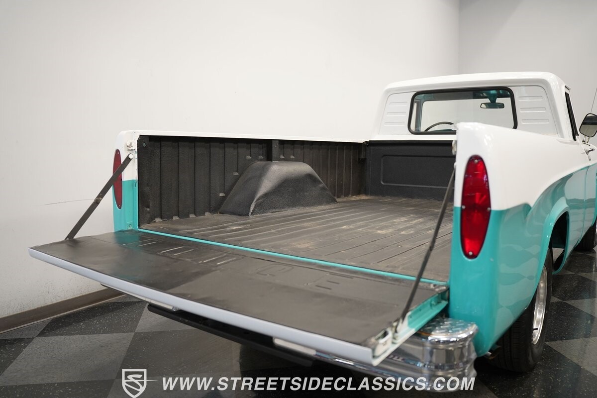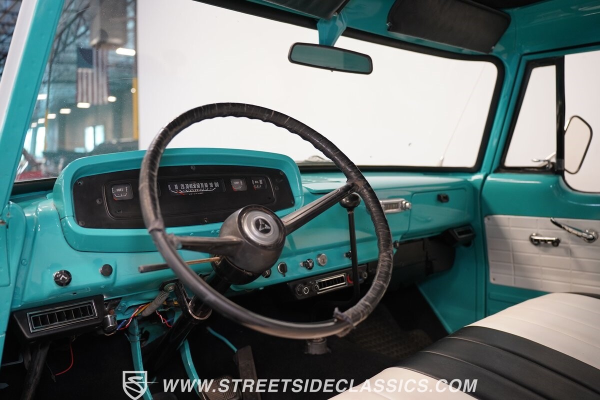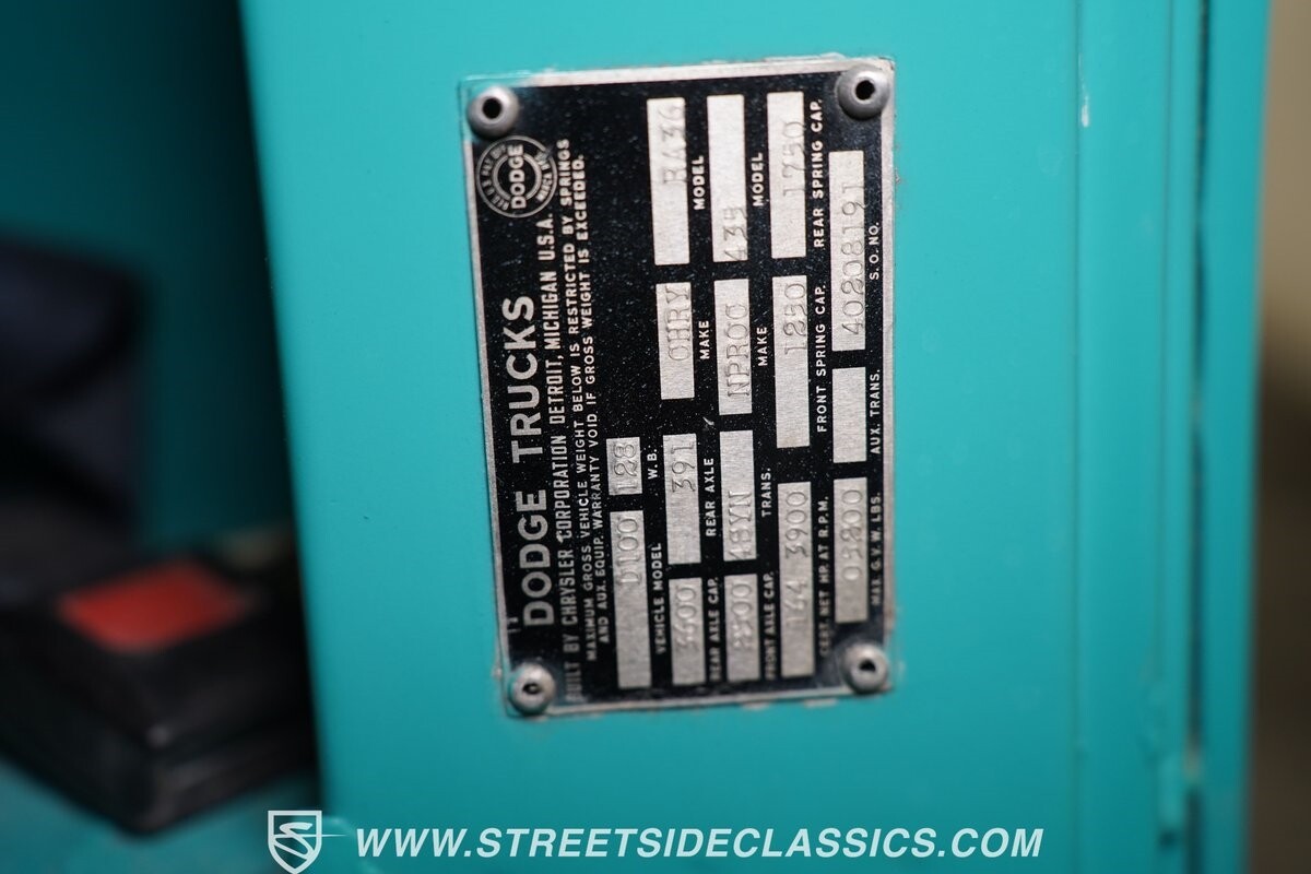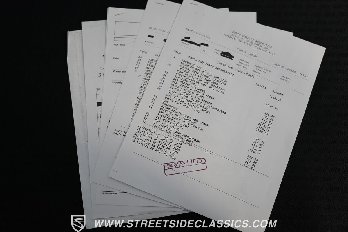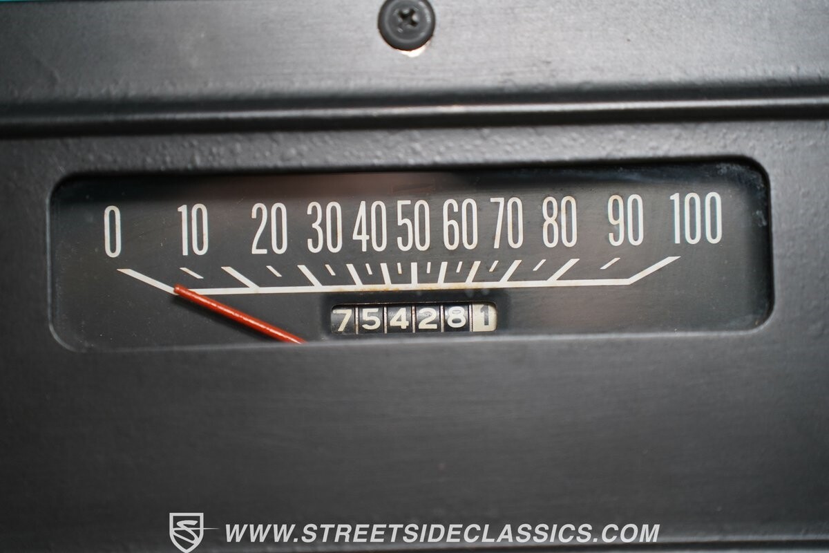 Step inside to a world where vintage charm meets modern convenience. The interior echoes the exterior with a matching teal and white palette, and the original dash, steering wheel, and shifter invite a nostalgic journey. Comfort isn't spared with additions like air conditioning, freshly installed carpet, and a suede headliner. The seating-a striking black and white vinyl bench-promises comfort for the long haul. The blend of mostly original and some updated components like new armrests ensure functionality and style, with documentation from Rob's Quality Automotive to prove the meticulous care taken during its restoration.