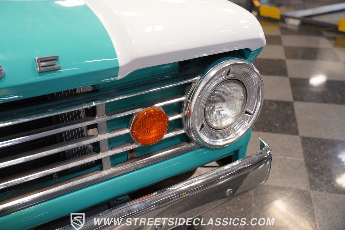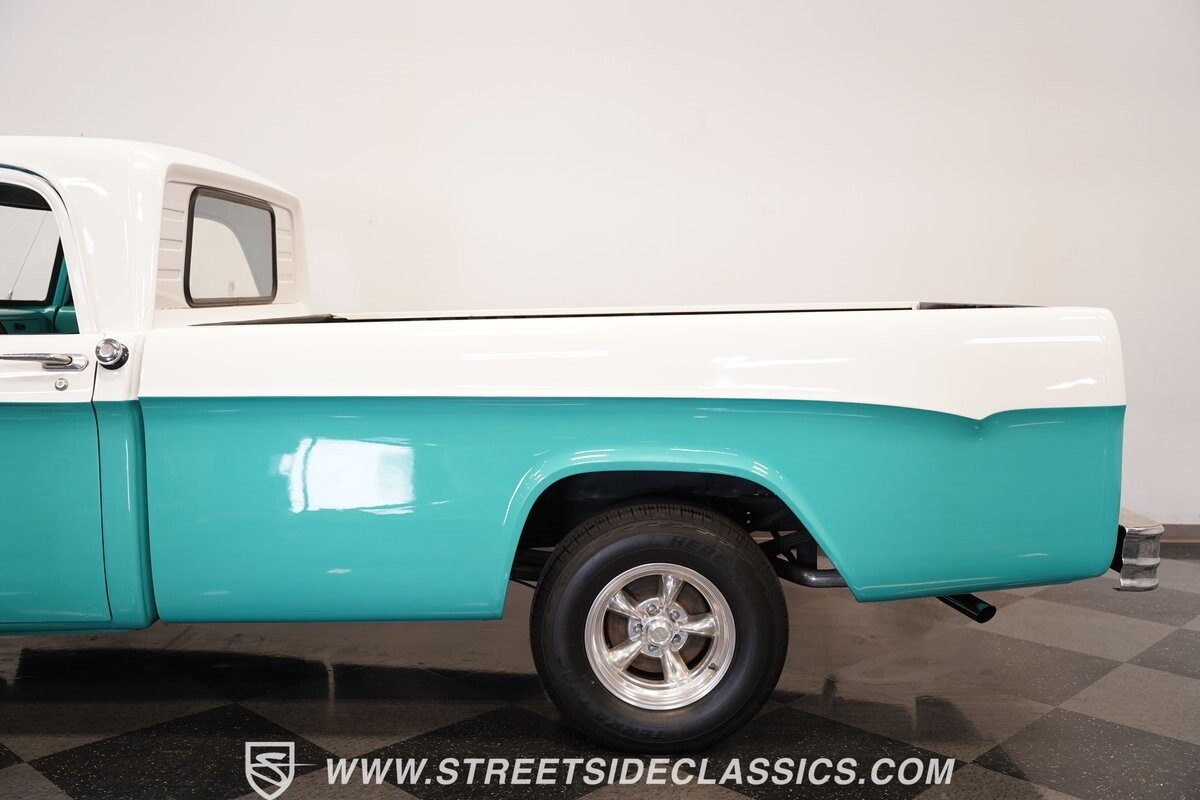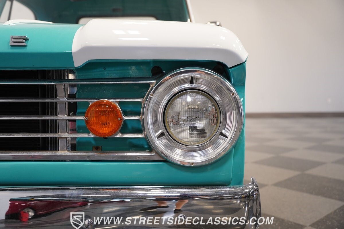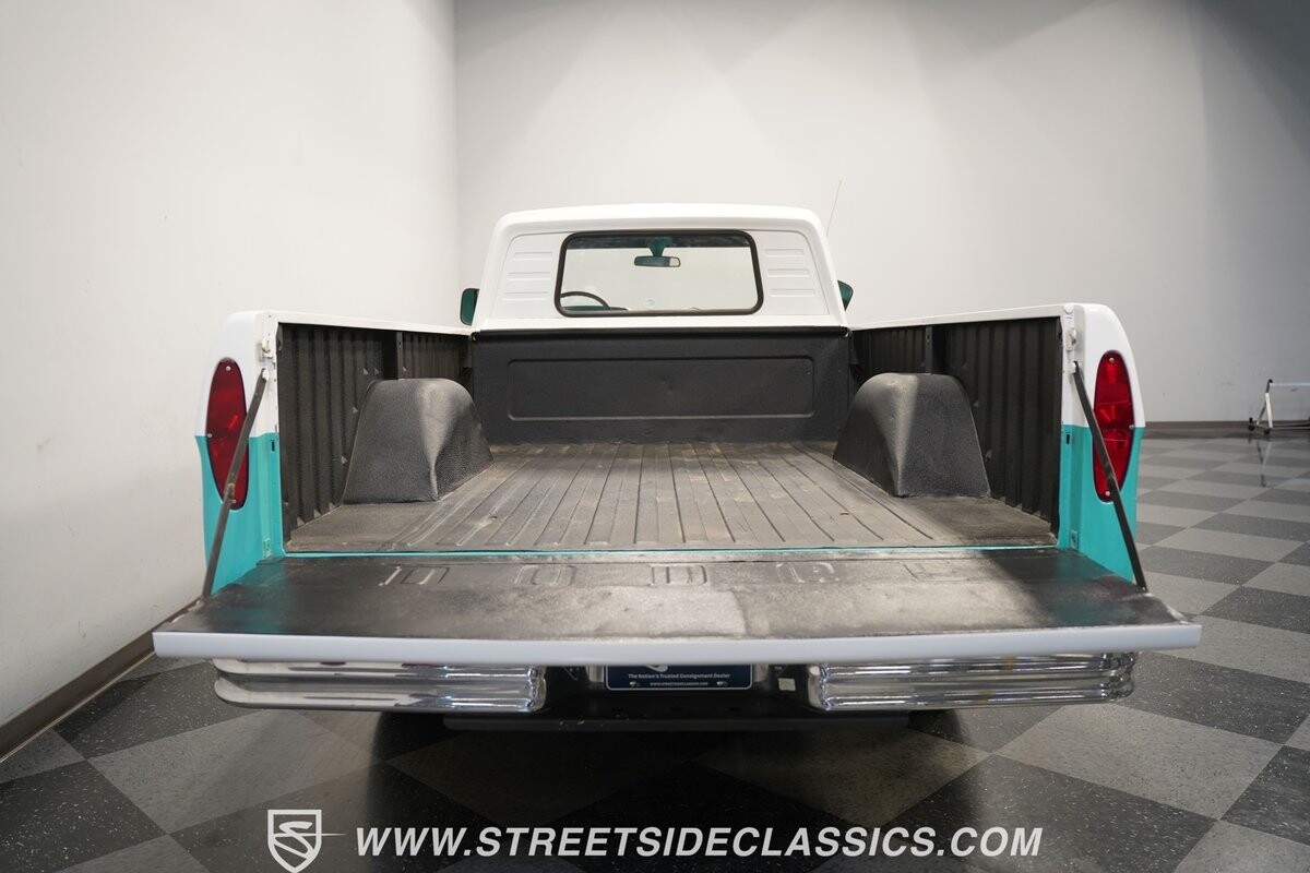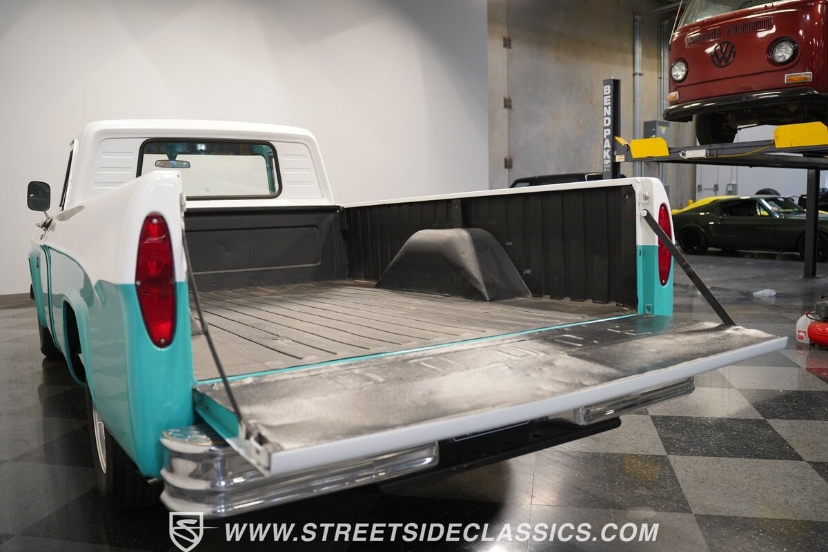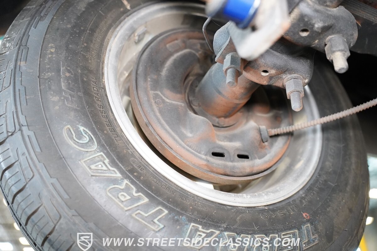 Step inside to a world where vintage charm meets modern convenience. The interior echoes the exterior with a matching teal and white palette, and the original dash, steering wheel, and shifter invite a nostalgic journey. Comfort isn't spared with additions like air conditioning, freshly installed carpet, and a suede headliner. The seating-a striking black and white vinyl bench-promises comfort for the long haul. The blend of mostly original and some updated components like new armrests ensure functionality and style, with documentation from Rob's Quality Automotive to prove the meticulous care taken during its restoration.