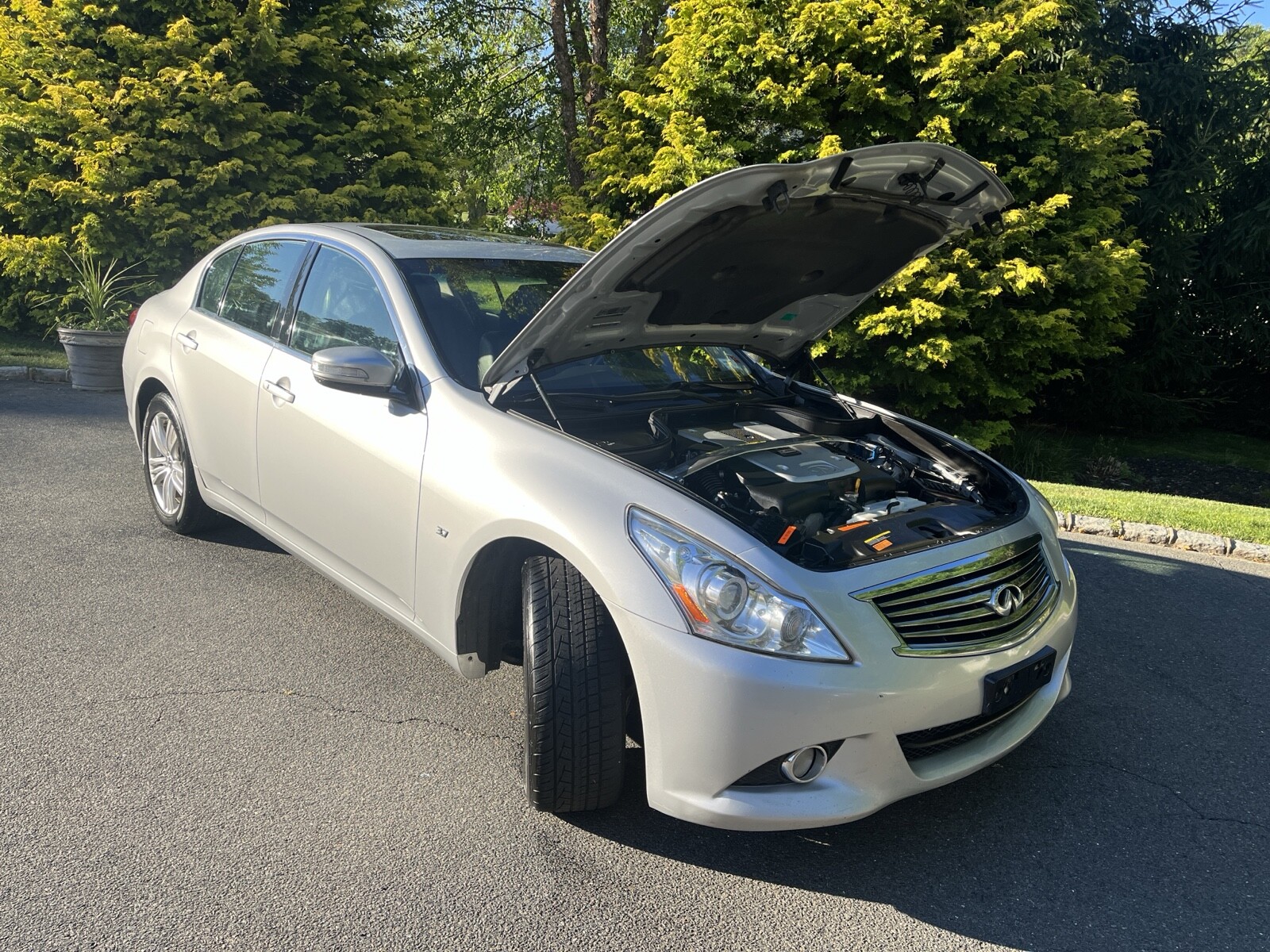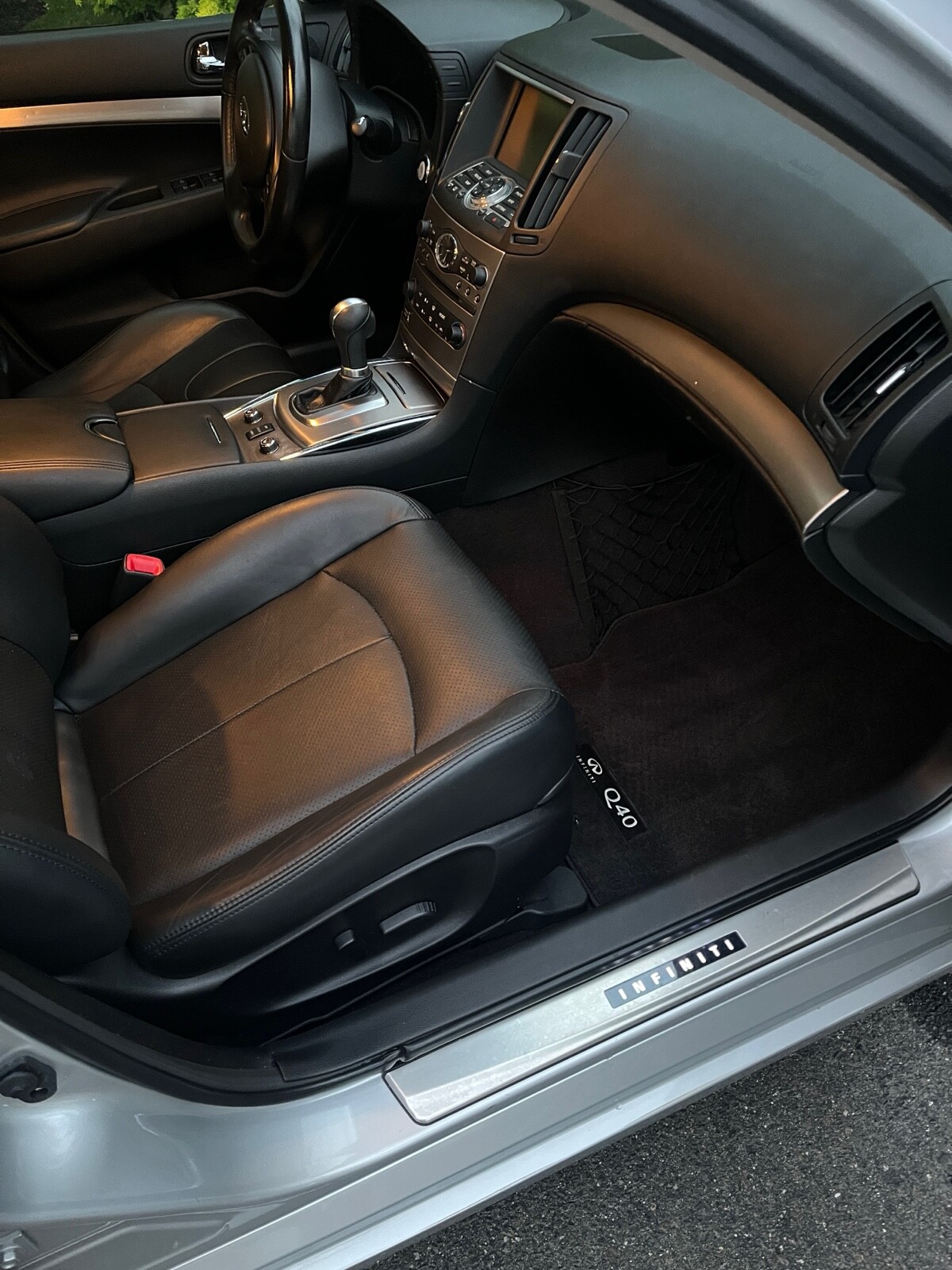 2015 Infiniti Q40. Loaded features. Illuminated door sills, exterior side view mirror turn signal indicators, Hotchkis performance front sway bar, Cusco strut bar, trunk net, footwell net, Infiniti logo puddle lights and upgraded led fog lights. Carpets immaculate and always covered with rubber overlays.