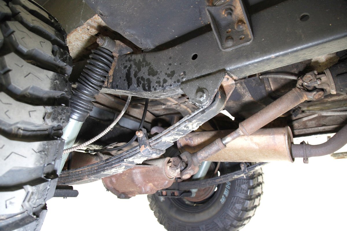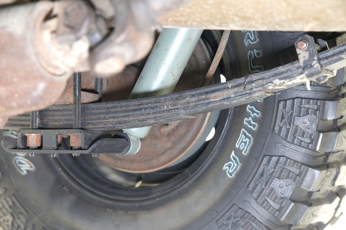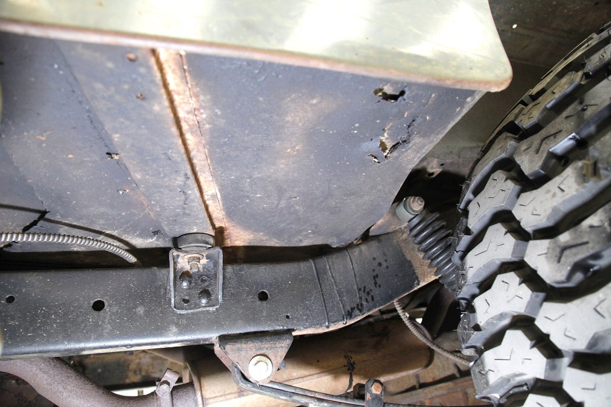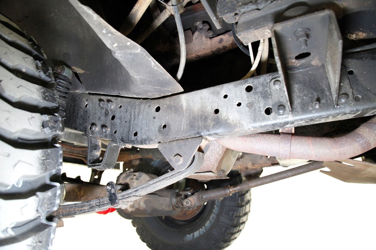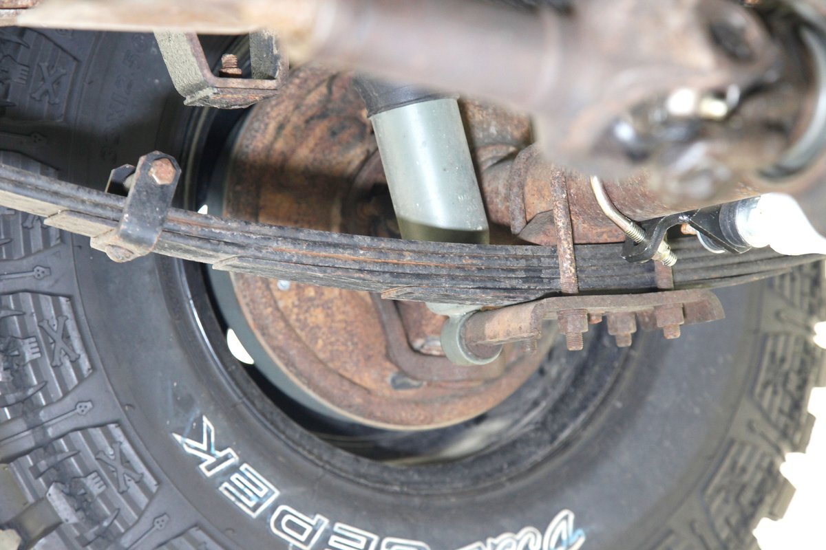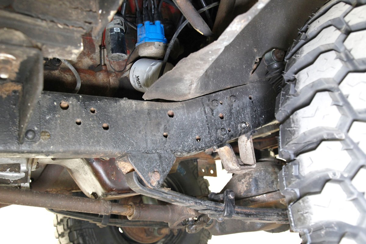 A solid frame with a new suspension in leaf spring setup. 4-wheel drum brakes and fairly clean underneath, with just spotty light surface rust.