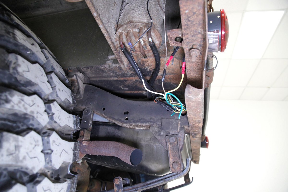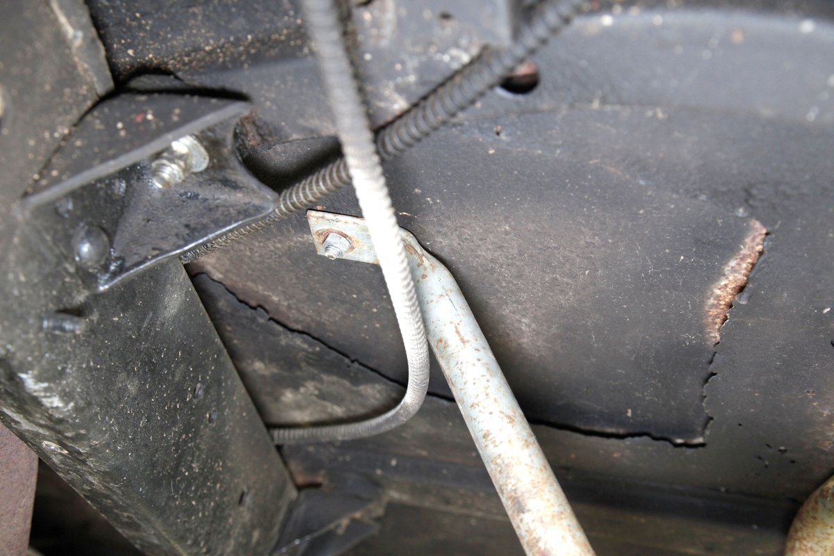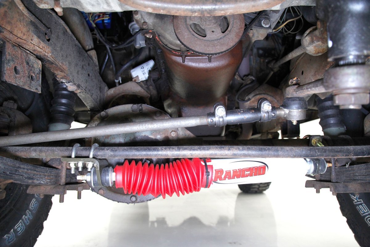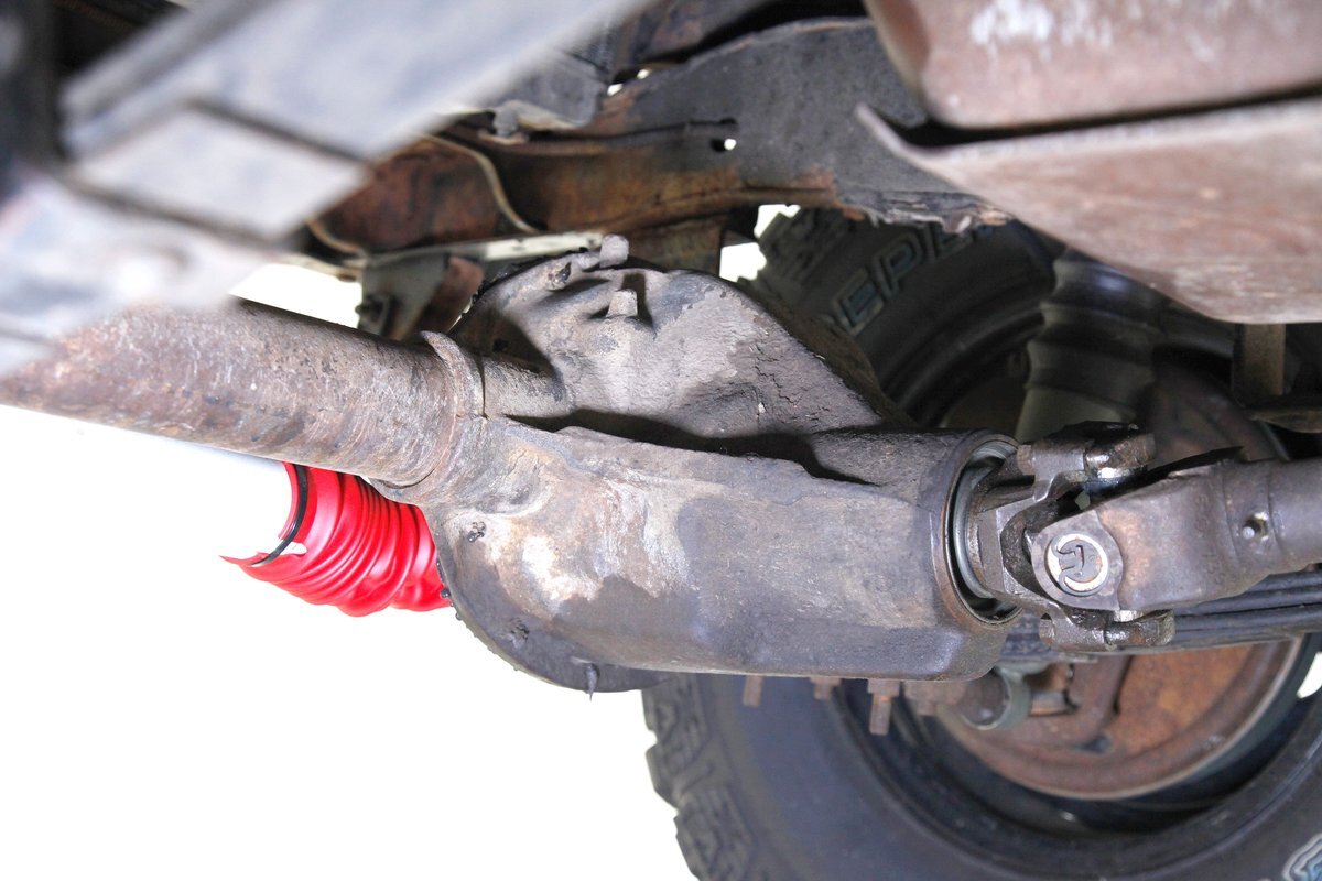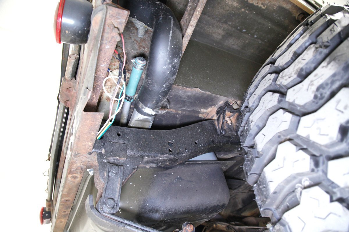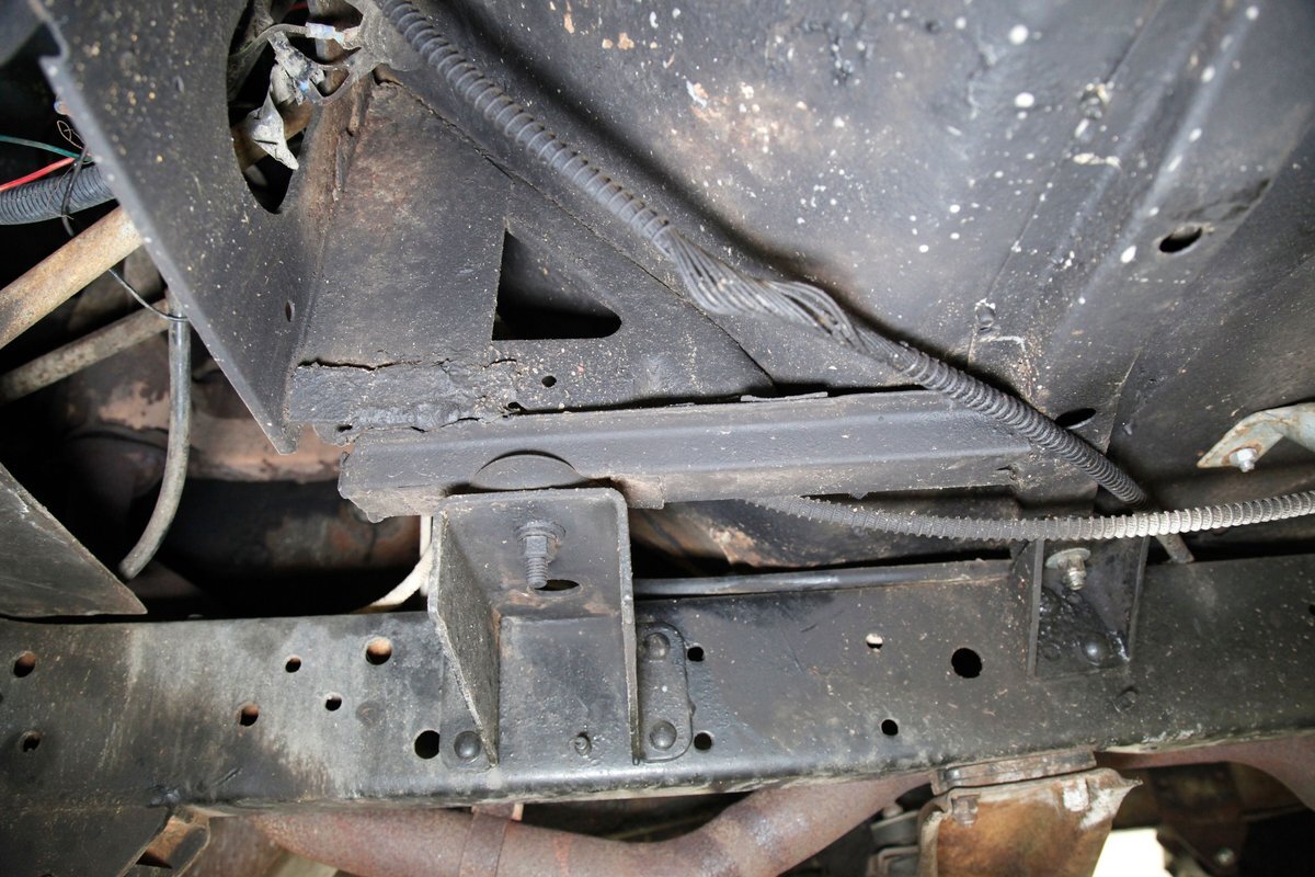 A solid frame with a new suspension in leaf spring setup. 4-wheel drum brakes and fairly clean underneath, with just spotty light surface rust.