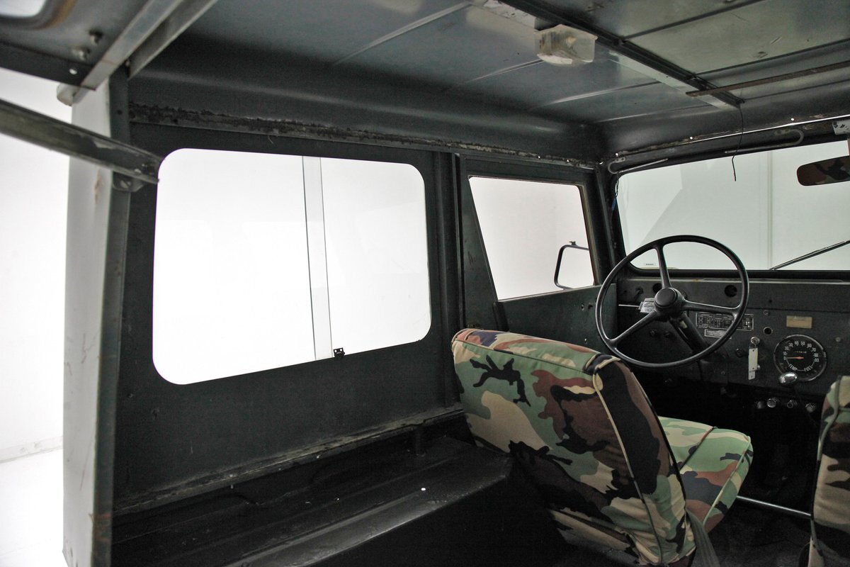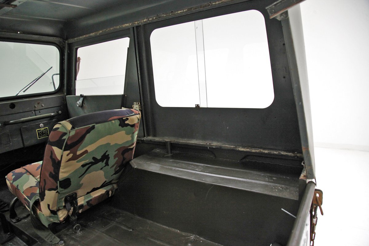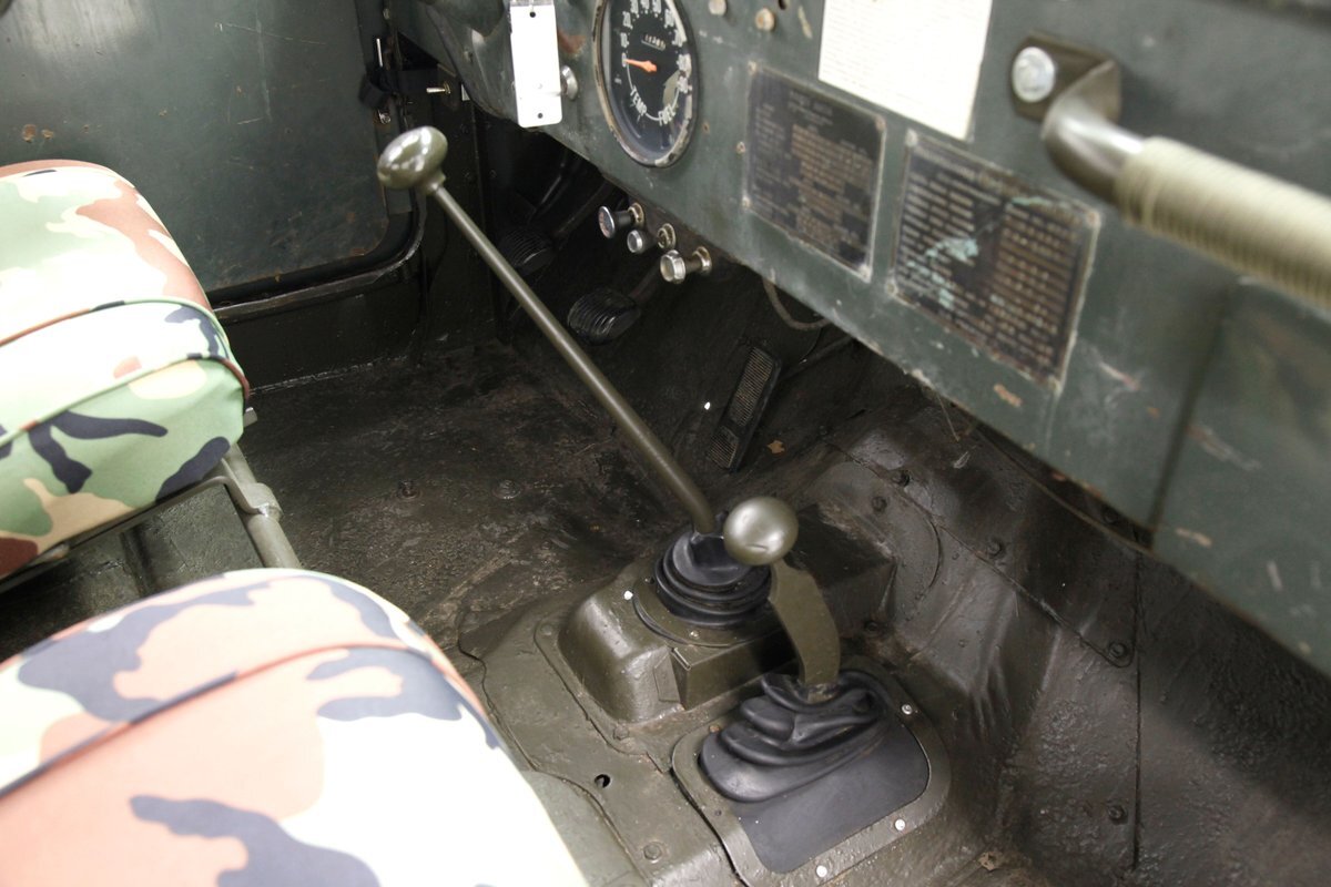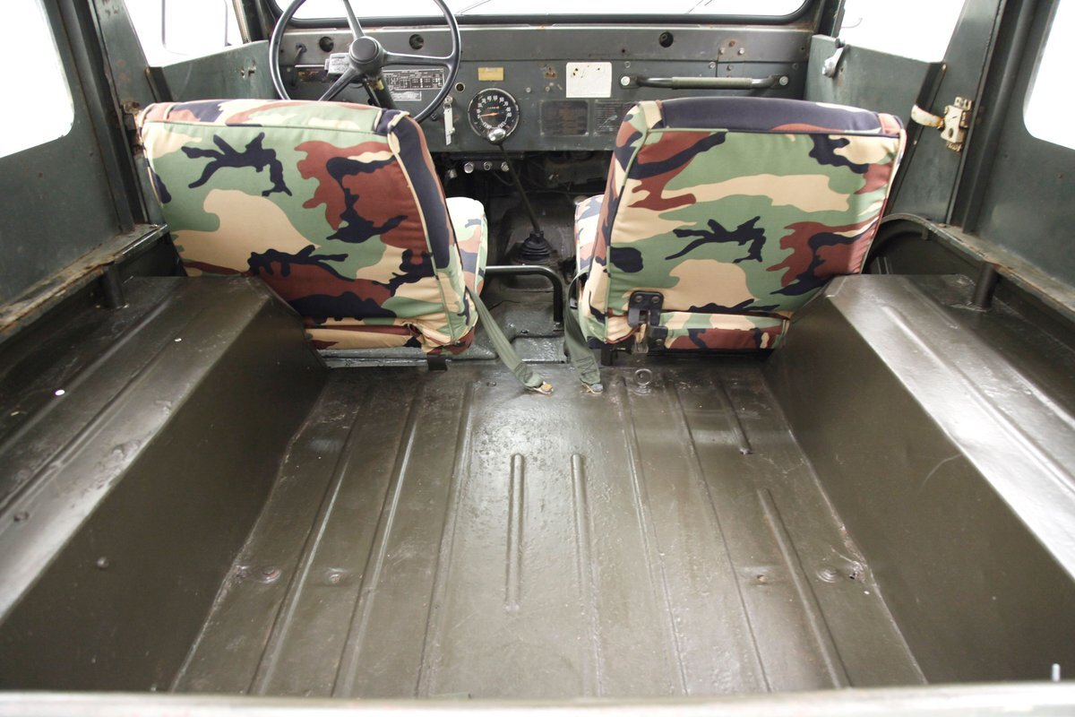 I don't know but I've been told, a frog man's money is as good as gold. Slipping past utilitarian metal doors in...olive drab! We see 2 low back buckets covered in camo seat coverings. In fact, it took me a while to find them they are so well camouflaged! Upfront is a simple metal dash with a large circular gauge cluster, knobs and buttons. Floors are black rubber, and in back is a fabricated metal bed with metal bench seats on opposing sides running the length of the bed. All metal insides, even the headliner is metal, and all surfaces showing some wear and scratches, with dents and dings, mostly normal use. Sound off..1..2, Sound off..3...4 Sound off 1...2...3...4!