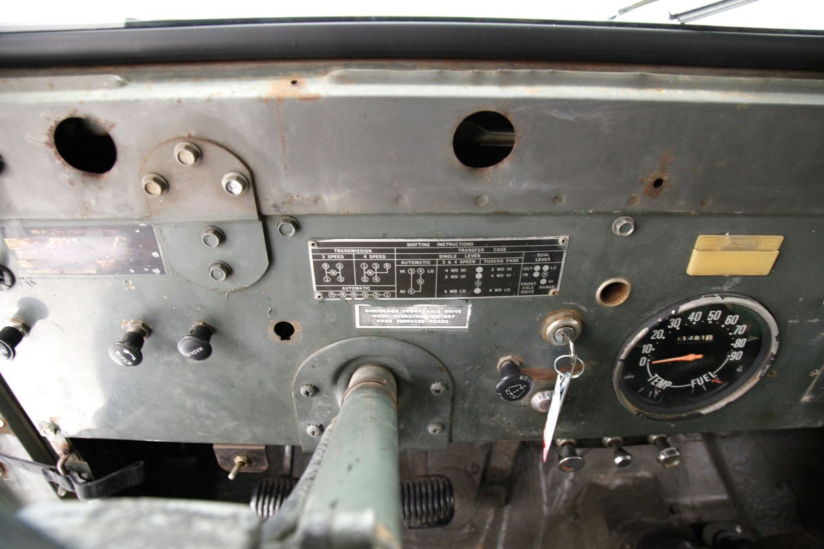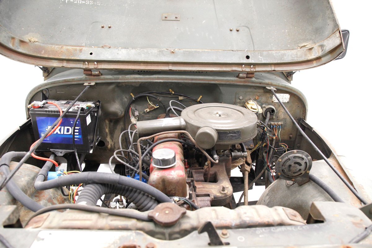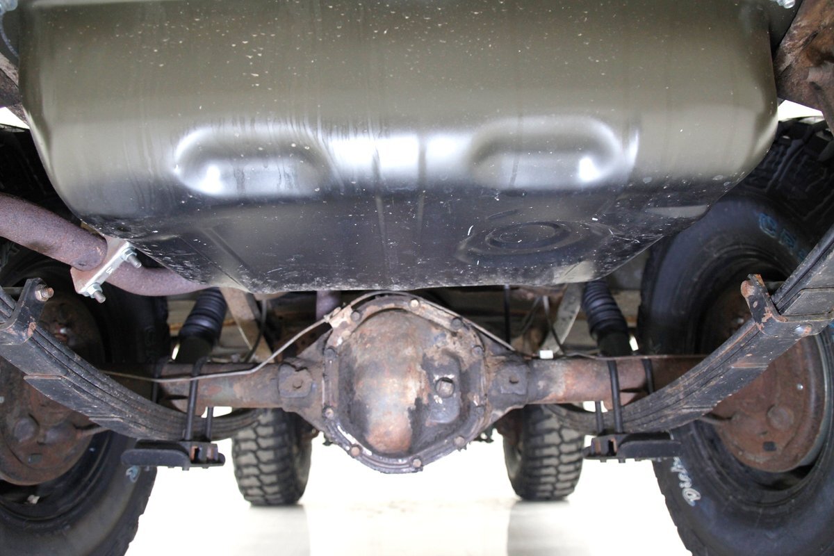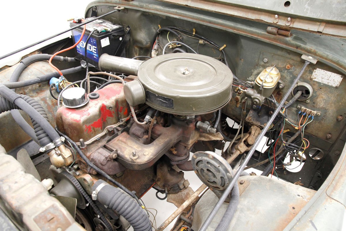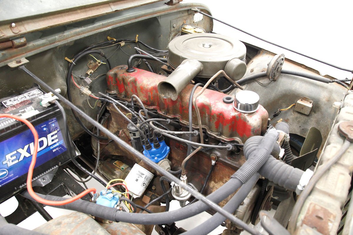 Lifting that white star to the windshield, reveals an unrestored engine bay. Within its confines is a 232ci inline 6 cylinder with a 1-barrel carburetor. Borg Warner is providing the transmission in the form of a 3-speed manual on back. A Dana 30 front axle and a Dana 40 rear axle completes the 4-wheel drive. What you lookin' at May-o-naise??