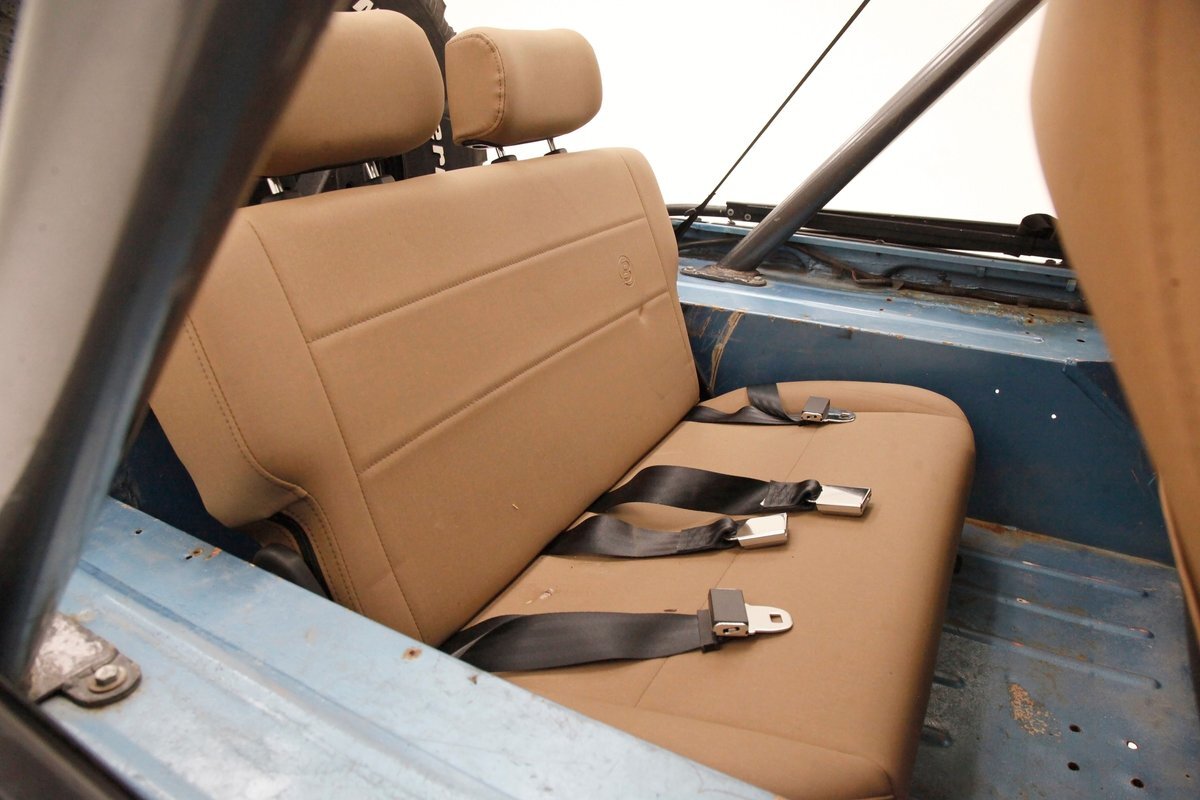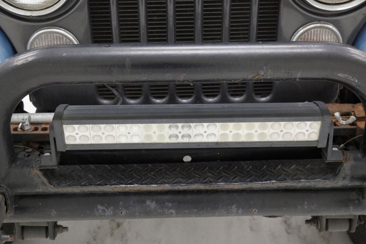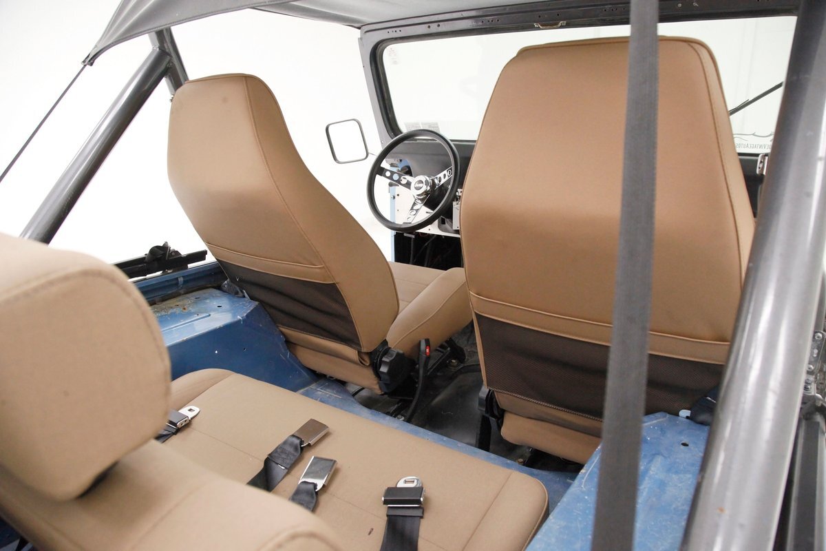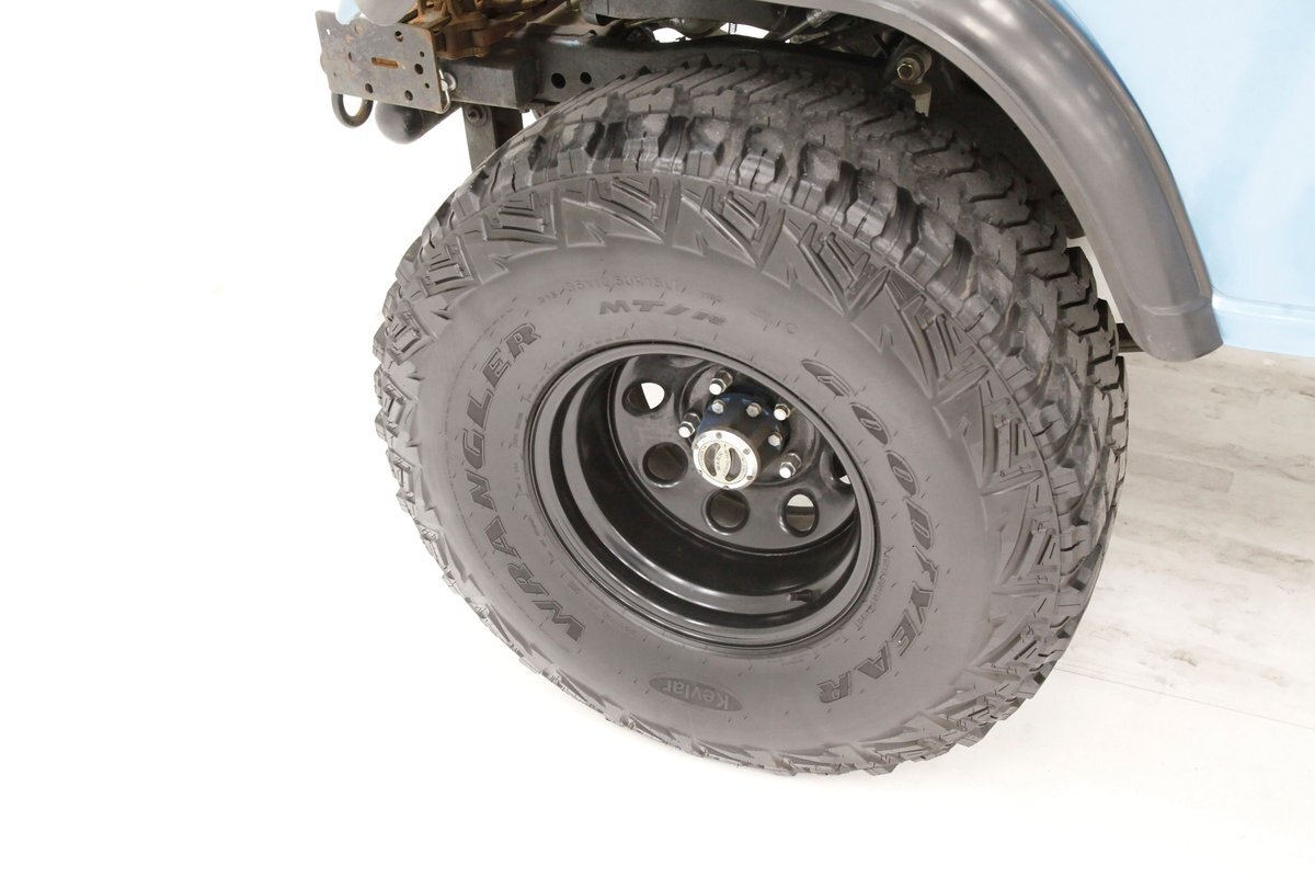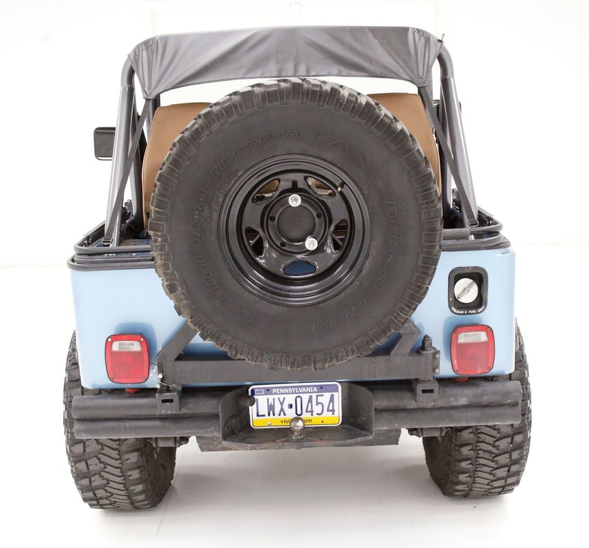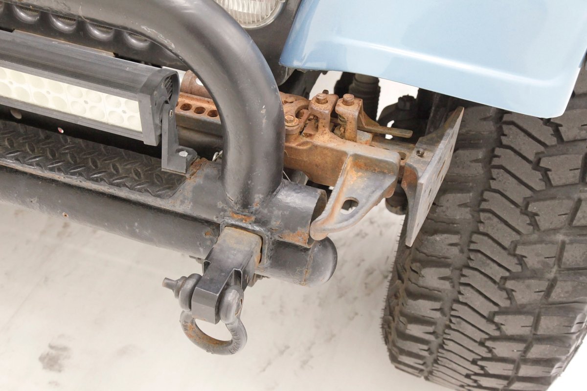 All straight and turn, all tricked out with extra LED lighting, a tubular off road front bumper, a newer Bikini top, 15-inch glossy black wheels and Goodyear tires in the form of 35x12.5R15LT mudders including the BF Goodrich spare. The light blue painted steel is all good with just a few areas of bubbling, prior body repairs, and just a few war scars, but they are minor. A black bikini top is on to protect you and your passengers from the elements, although without doors you may get a little wet or even sunburnt. Black lightweight plastic fenders are bolted onto the blue body and keep the mudslinging to a minimum and in back, a hitch mount is on the tubular bumper with the full size spare mounted above on a swing out mount allowing access to the small rear storage area. We are hearing the call of the wild! Wahoooo wahoooo.... wahoooo whaooo whaooo! (Think Mandalorian)