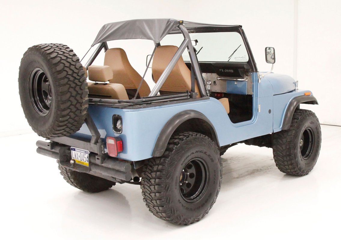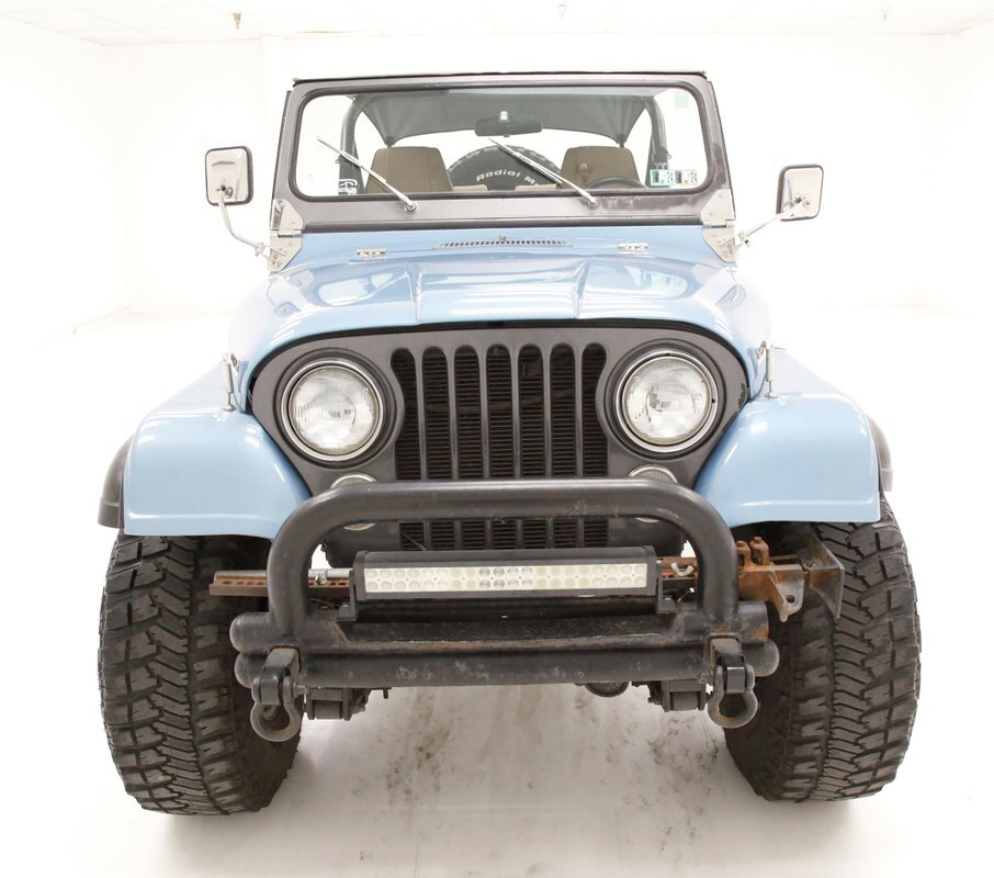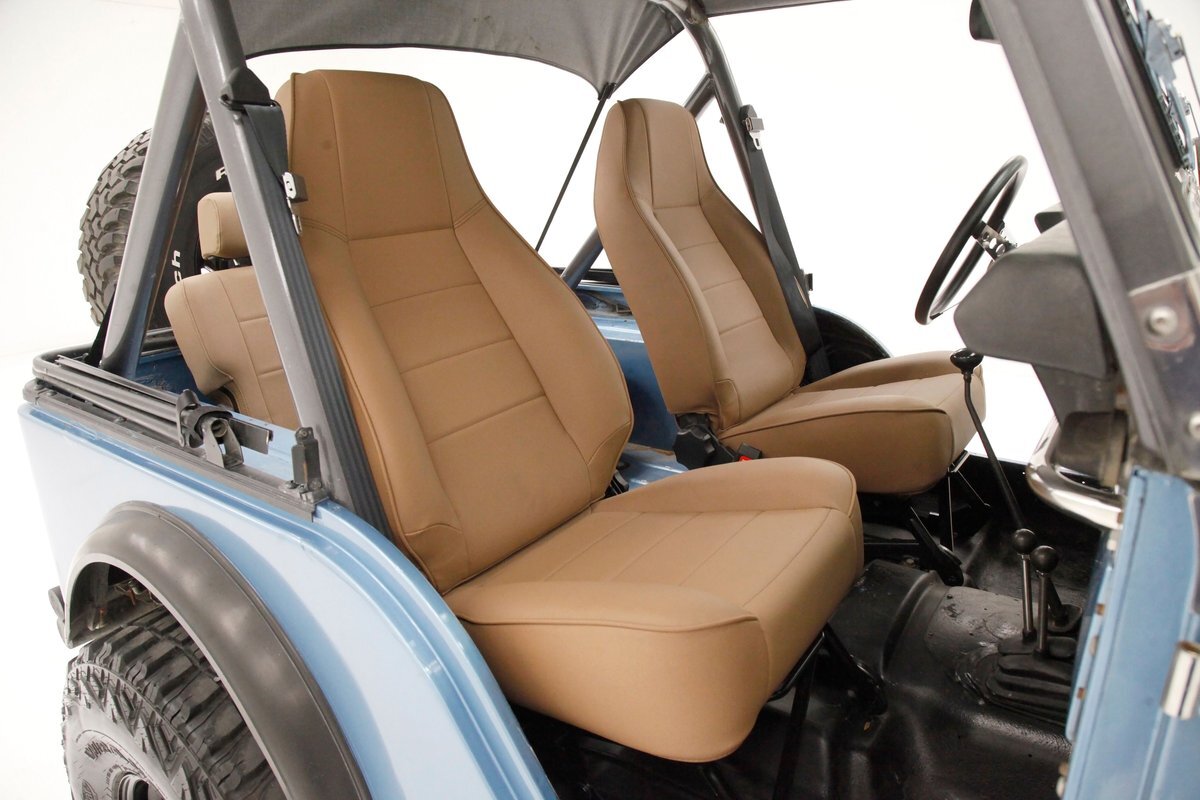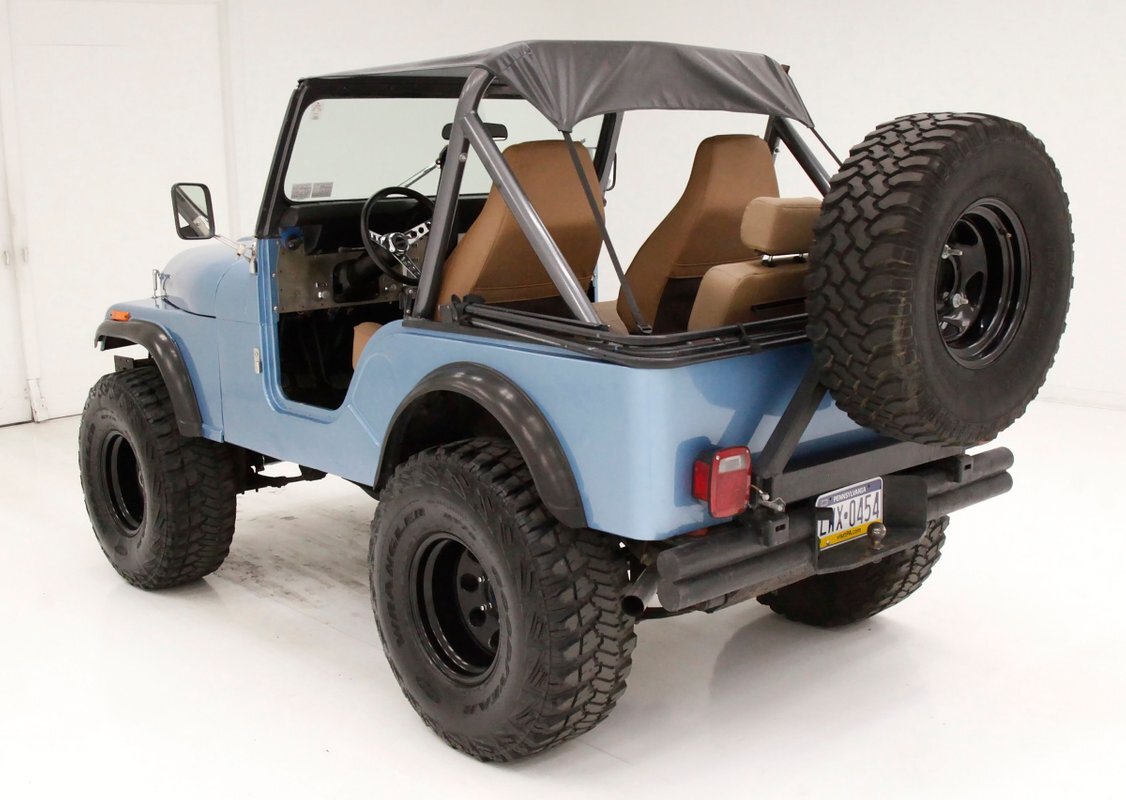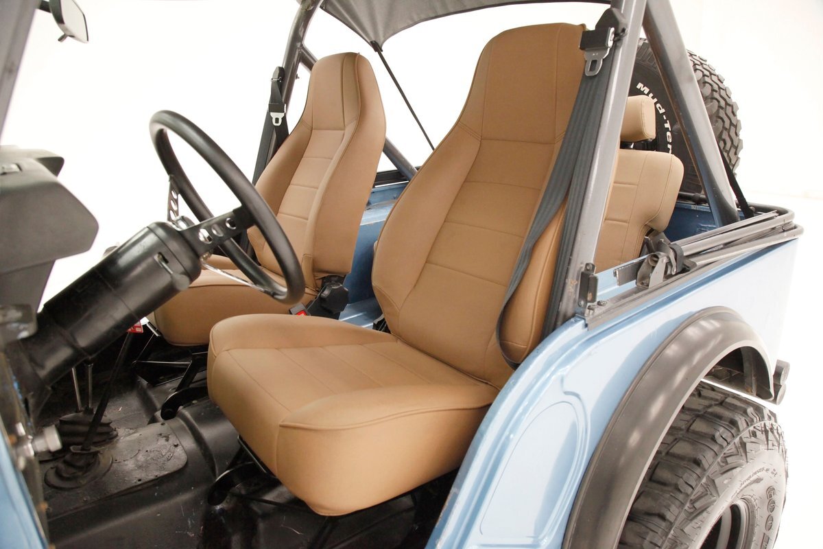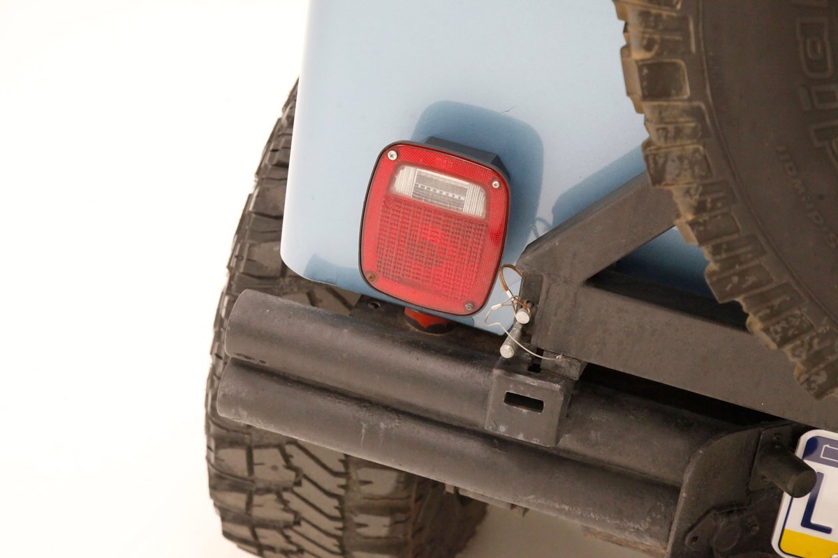 All straight and turn, all tricked out with extra LED lighting, a tubular off road front bumper, a newer Bikini top, 15-inch glossy black wheels and Goodyear tires in the form of 35x12.5R15LT mudders including the BF Goodrich spare. The light blue painted steel is all good with just a few areas of bubbling, prior body repairs, and just a few war scars, but they are minor. A black bikini top is on to protect you and your passengers from the elements, although without doors you may get a little wet or even sunburnt. Black lightweight plastic fenders are bolted onto the blue body and keep the mudslinging to a minimum and in back, a hitch mount is on the tubular bumper with the full size spare mounted above on a swing out mount allowing access to the small rear storage area. We are hearing the call of the wild! Wahoooo wahoooo.... wahoooo whaooo whaooo! (Think Mandalorian)