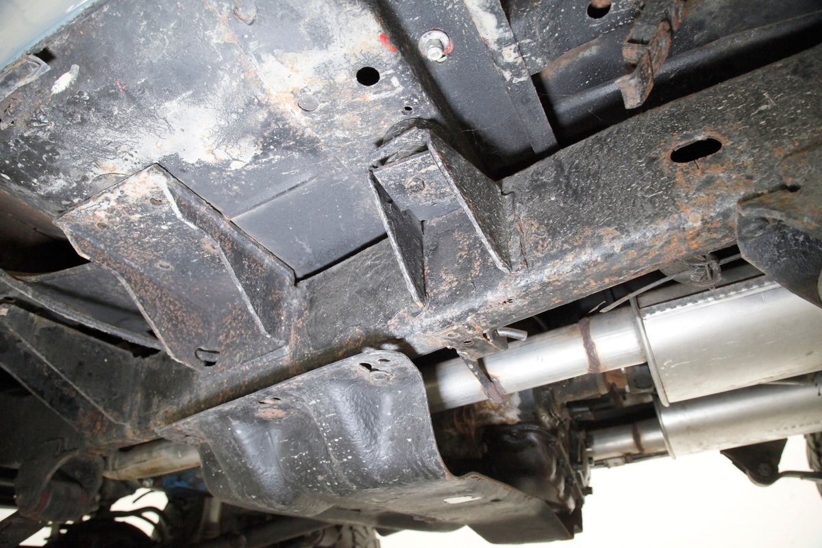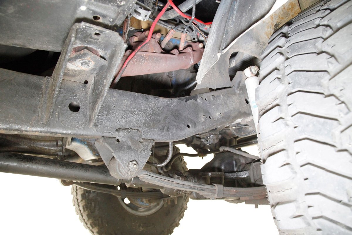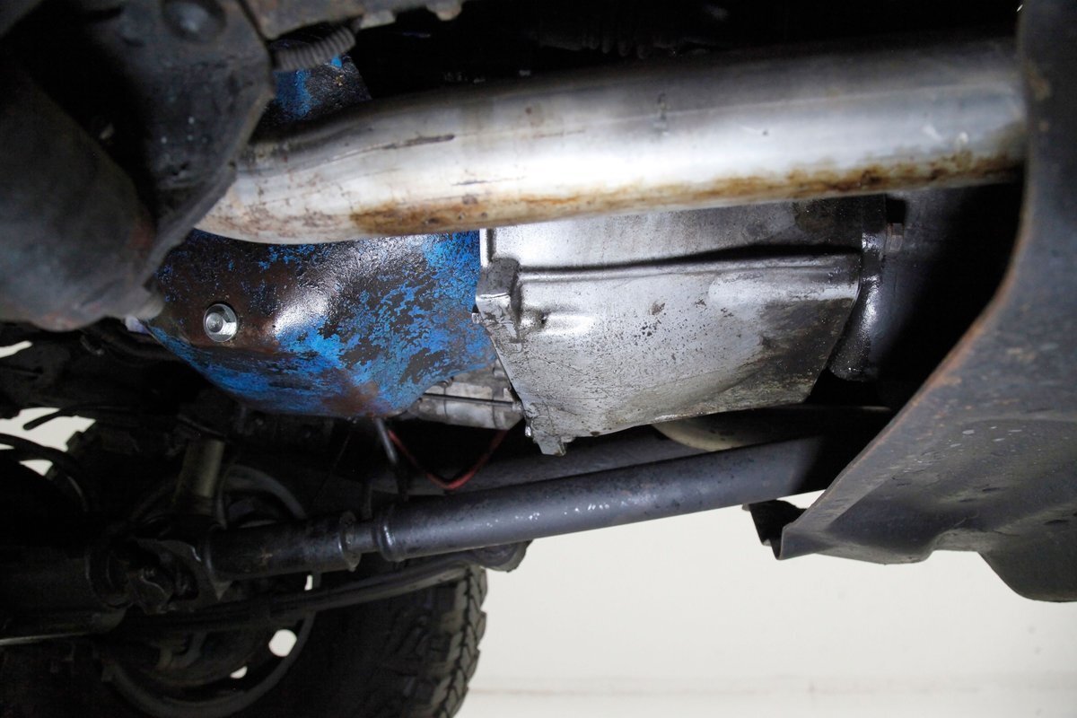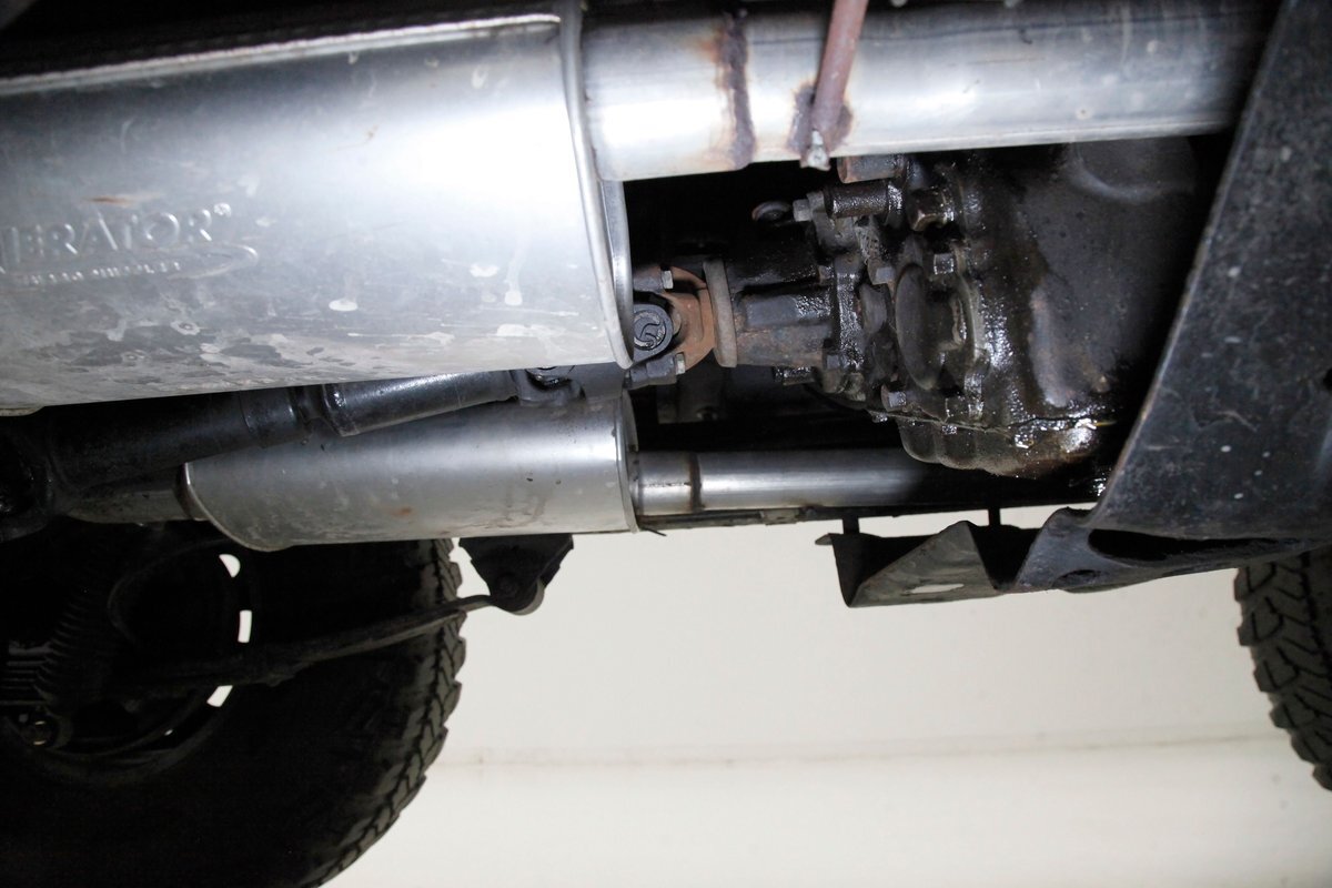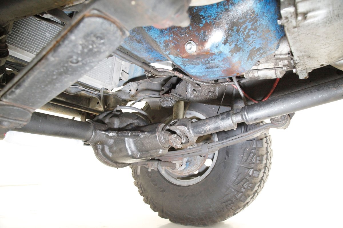 Black paint everywhere for the floor pans with some slight surface rust and some invasive rust to note in the left rear wheelhouse. 4-wheel leaf spring suspension has been treated to new rear springs and shackles with a slight lift installed along with a small body lift provide ample ground clearance for you off road adventures. Disc brakes are reserved for the front and drums are in the rear. Dual exhaust, sans catalytic converters, snakes its way rearward and is equipped with stock replacement style mufflers.
