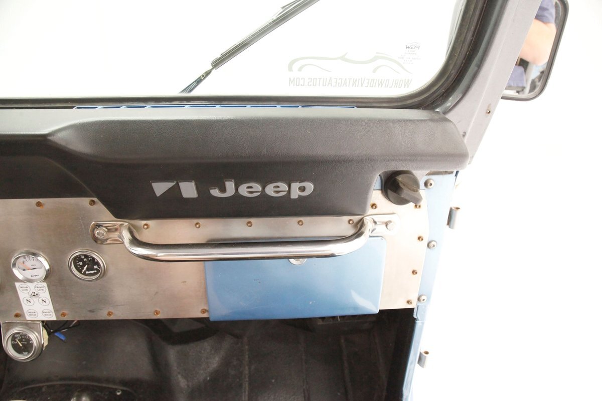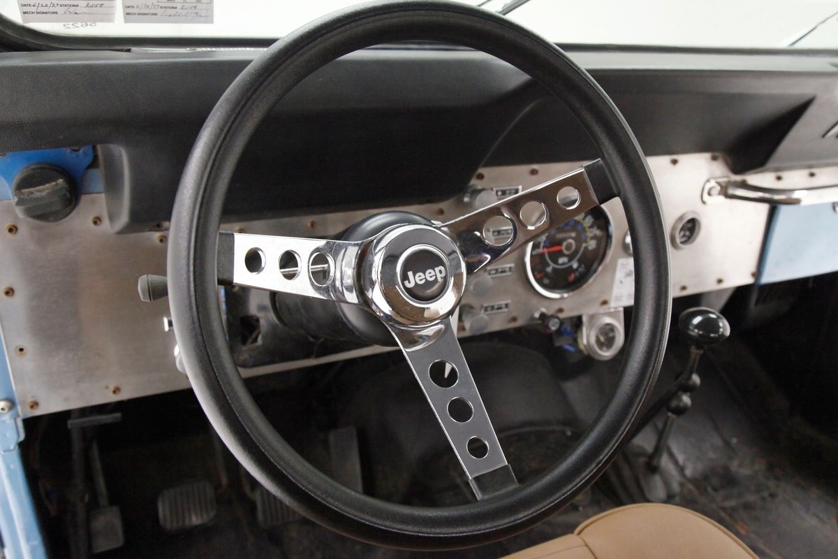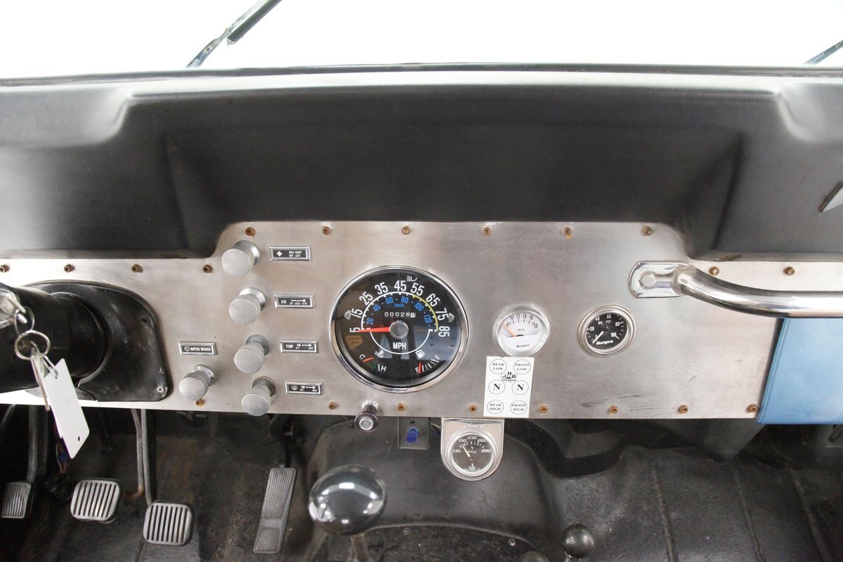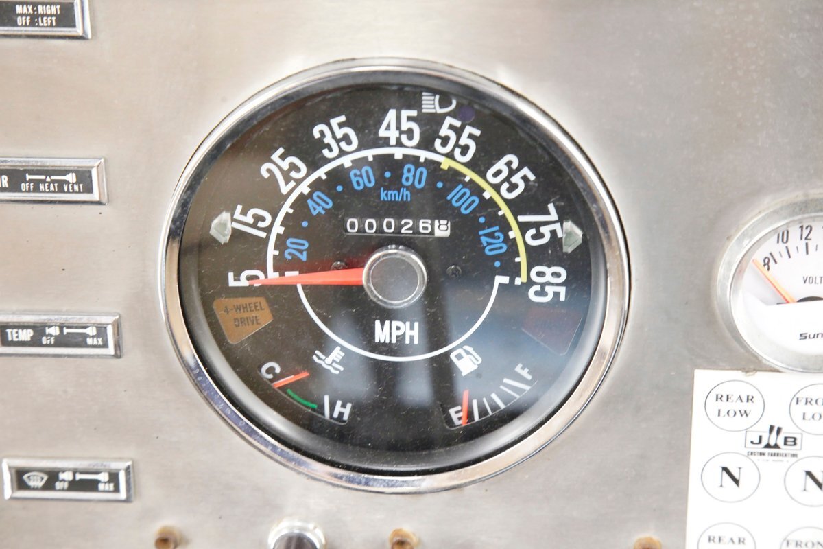 Since I fall into the slightly portly category and also have bad knees, I donned my stepladder for the climb into the interior. Speaking of which, as we slip inside on the new high back vinyl buckets which are in very nice condition and have integrated headrests. All covered in smooth tan vinyl and a new rear bench seat follows the same motif as the buckets. We note new seat belts for all seating positions as well. As we move forward from this box the floors are finished in black and blue and a trio of the factory 4x4 and transmission shifters reside here just prior to the dash. This dash is finished with a custom brushed aluminum panel with a black padded topper and is peppered with all the essential gauges and then some. Toggles and pulls abound as does labeling for all the controls. In front of the passenger is a chromed steel "Jesus" bar and a body matching glove box door. Fronting the dash is a Jeep 3 spoke drilled and polished rally steering wheel. Note the front windshield can be lowered for extra versatility. Also, a roll bar has been added just in case you are a bit too ambitious on the vertical climb.