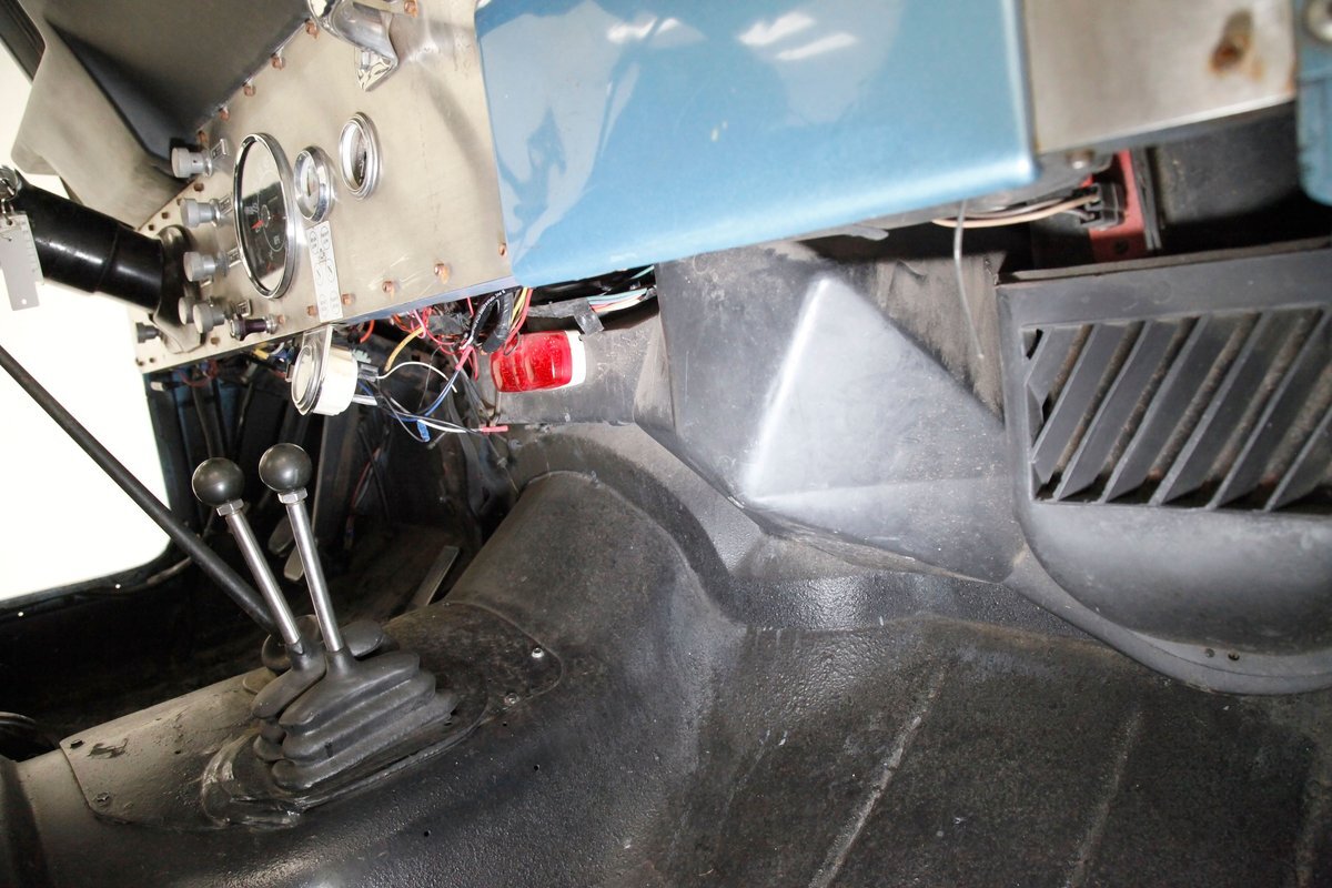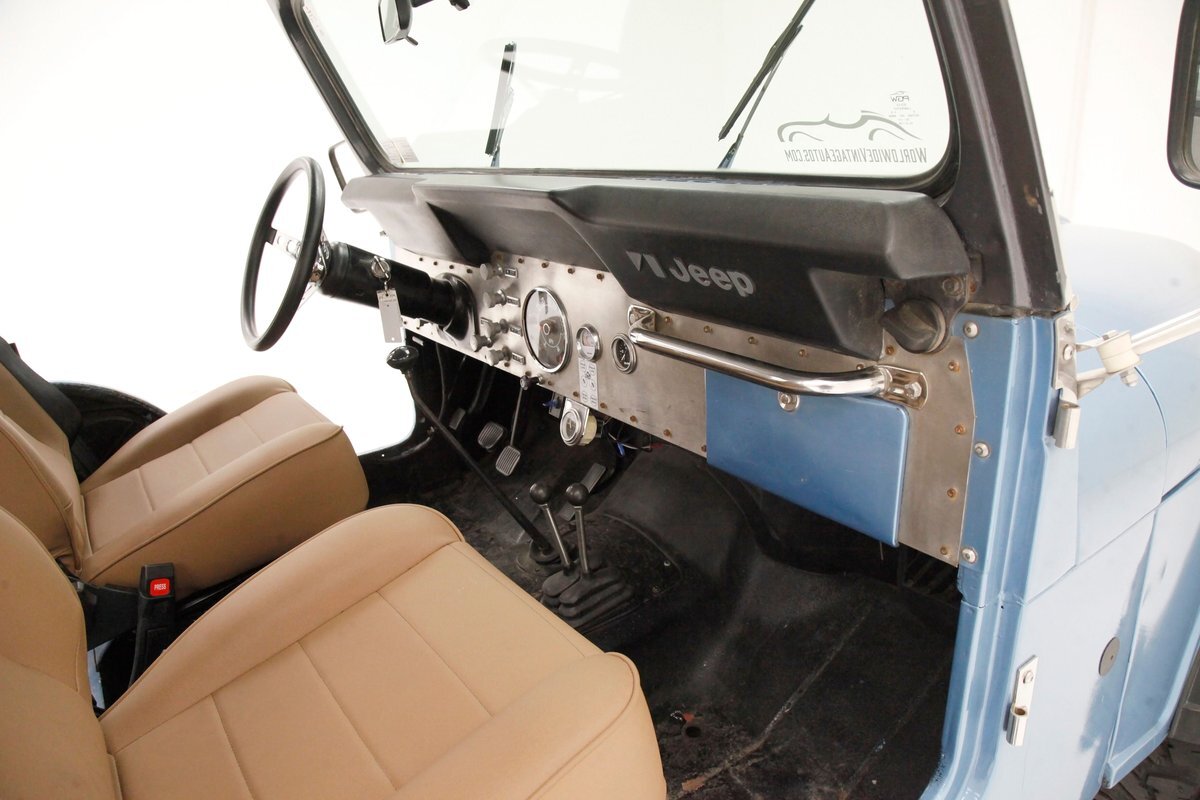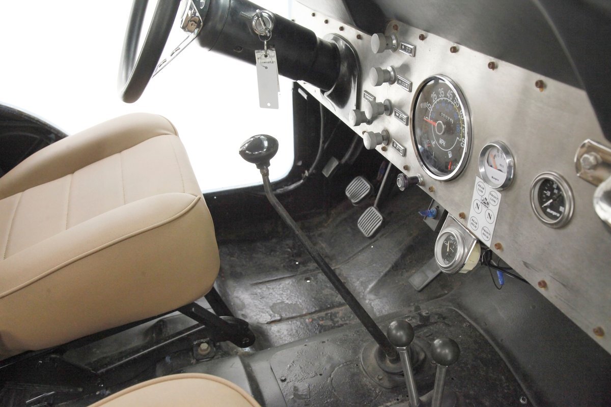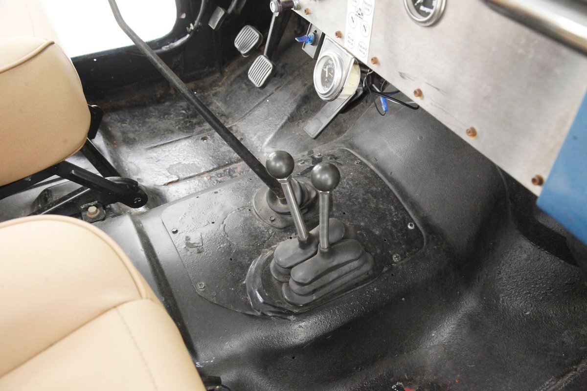 Since I fall into the slightly portly category and also have bad knees, I donned my stepladder for the climb into the interior. Speaking of which, as we slip inside on the new high back vinyl buckets which are in very nice condition and have integrated headrests. All covered in smooth tan vinyl and a new rear bench seat follows the same motif as the buckets. We note new seat belts for all seating positions as well. As we move forward from this box the floors are finished in black and blue and a trio of the factory 4x4 and transmission shifters reside here just prior to the dash. This dash is finished with a custom brushed aluminum panel with a black padded topper and is peppered with all the essential gauges and then some. Toggles and pulls abound as does labeling for all the controls. In front of the passenger is a chromed steel "Jesus" bar and a body matching glove box door. Fronting the dash is a Jeep 3 spoke drilled and polished rally steering wheel. Note the front windshield can be lowered for extra versatility. Also, a roll bar has been added just in case you are a bit too ambitious on the vertical climb.