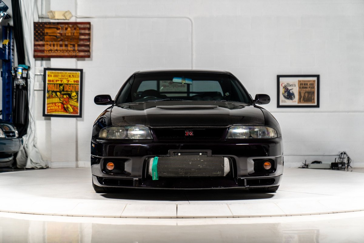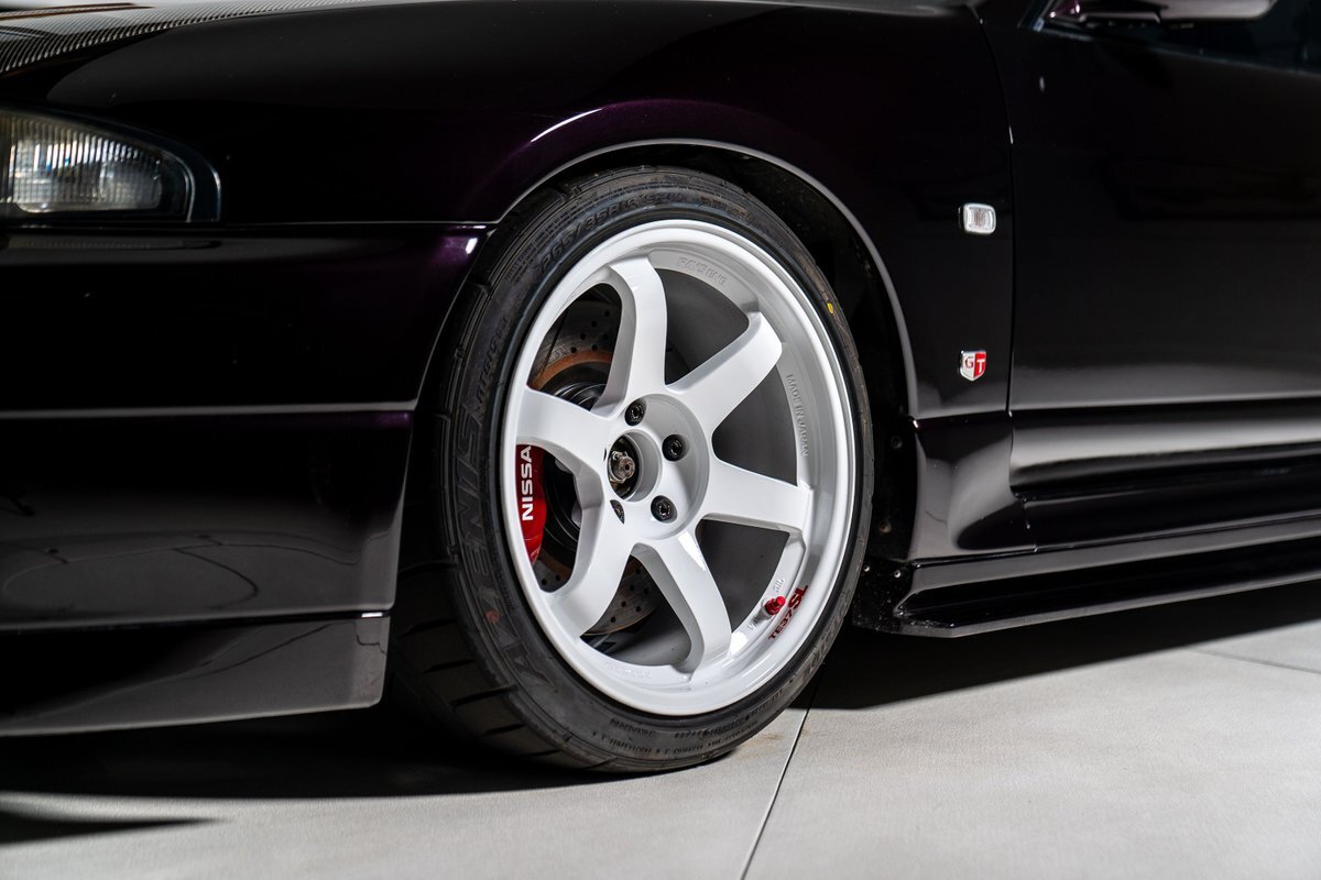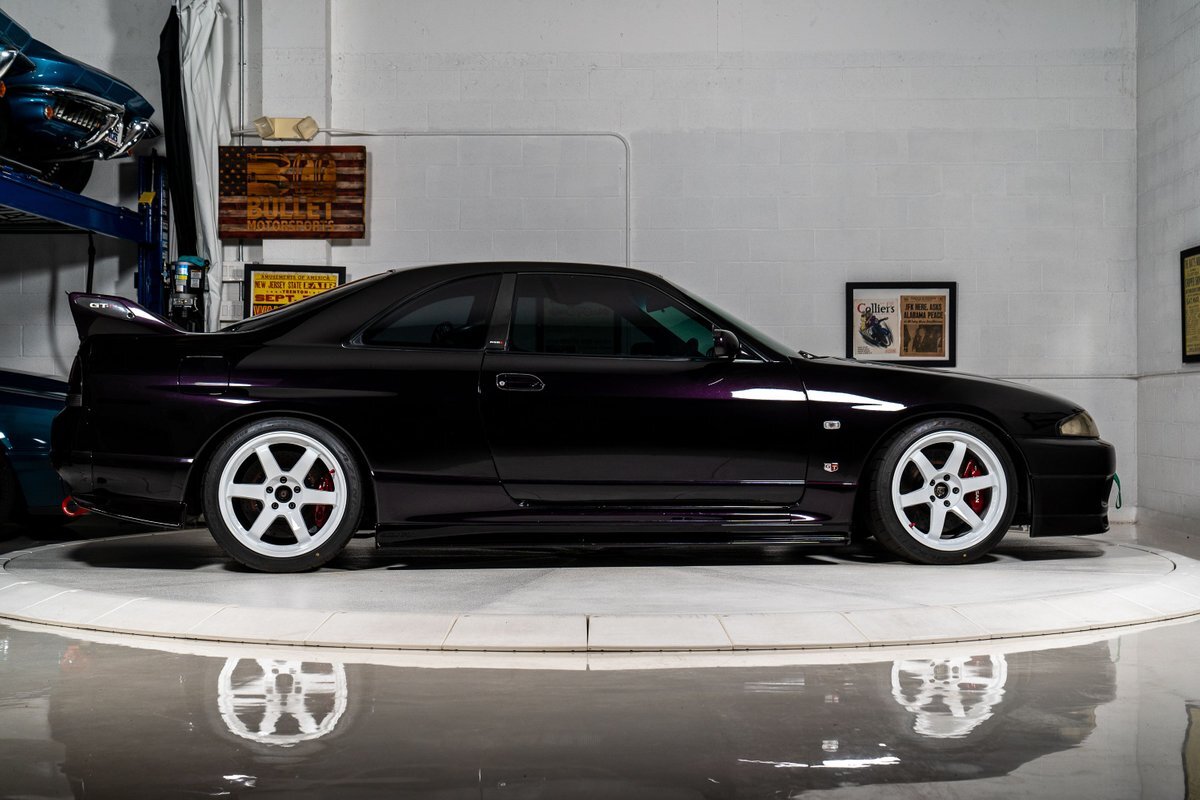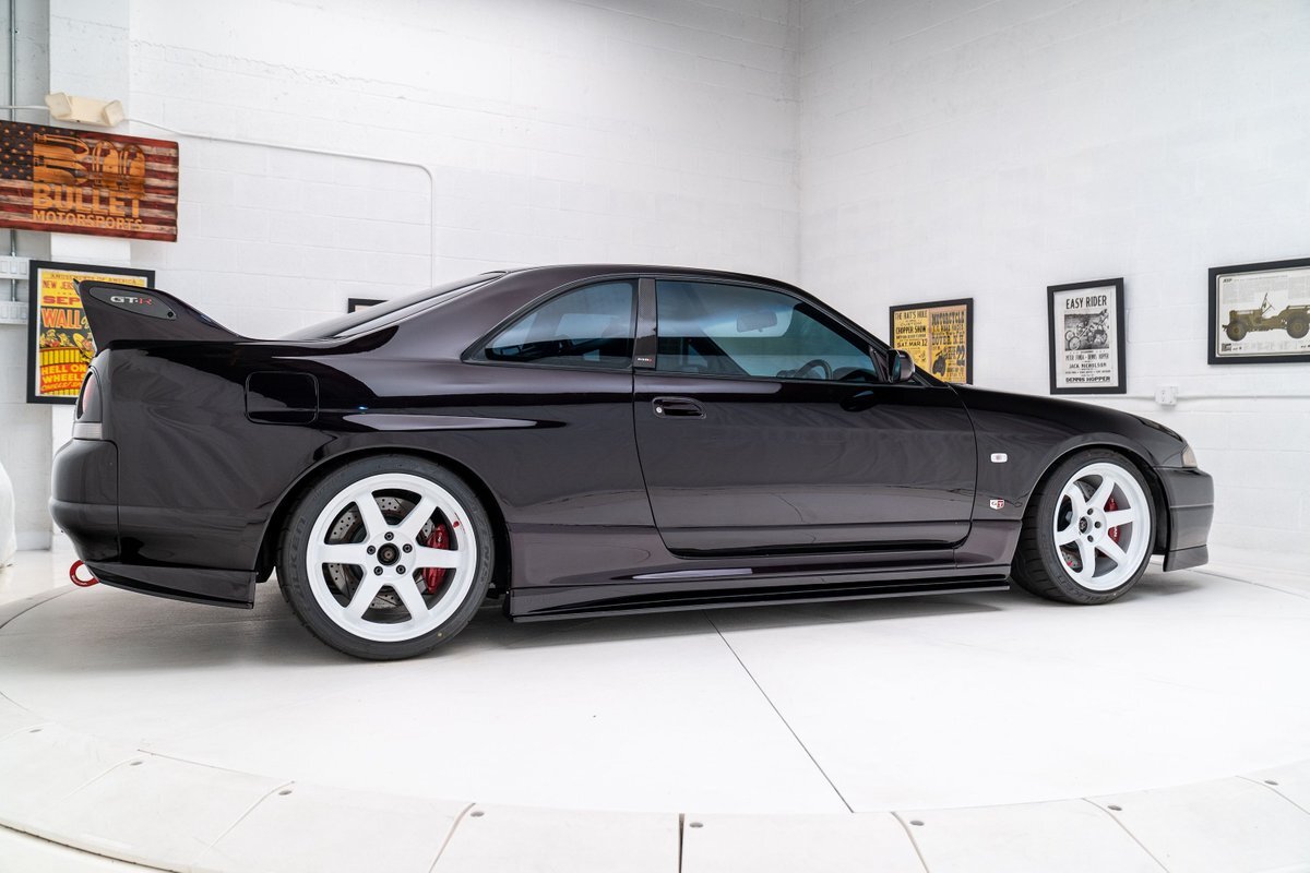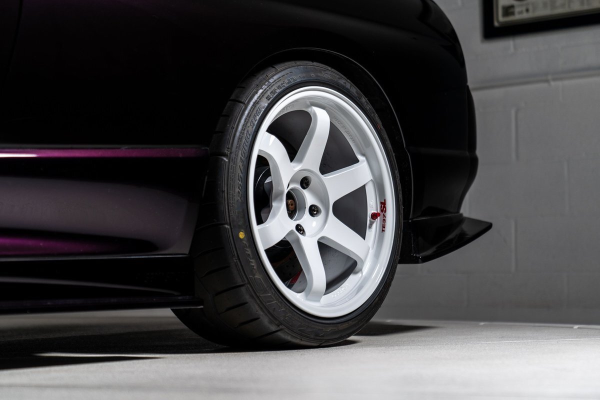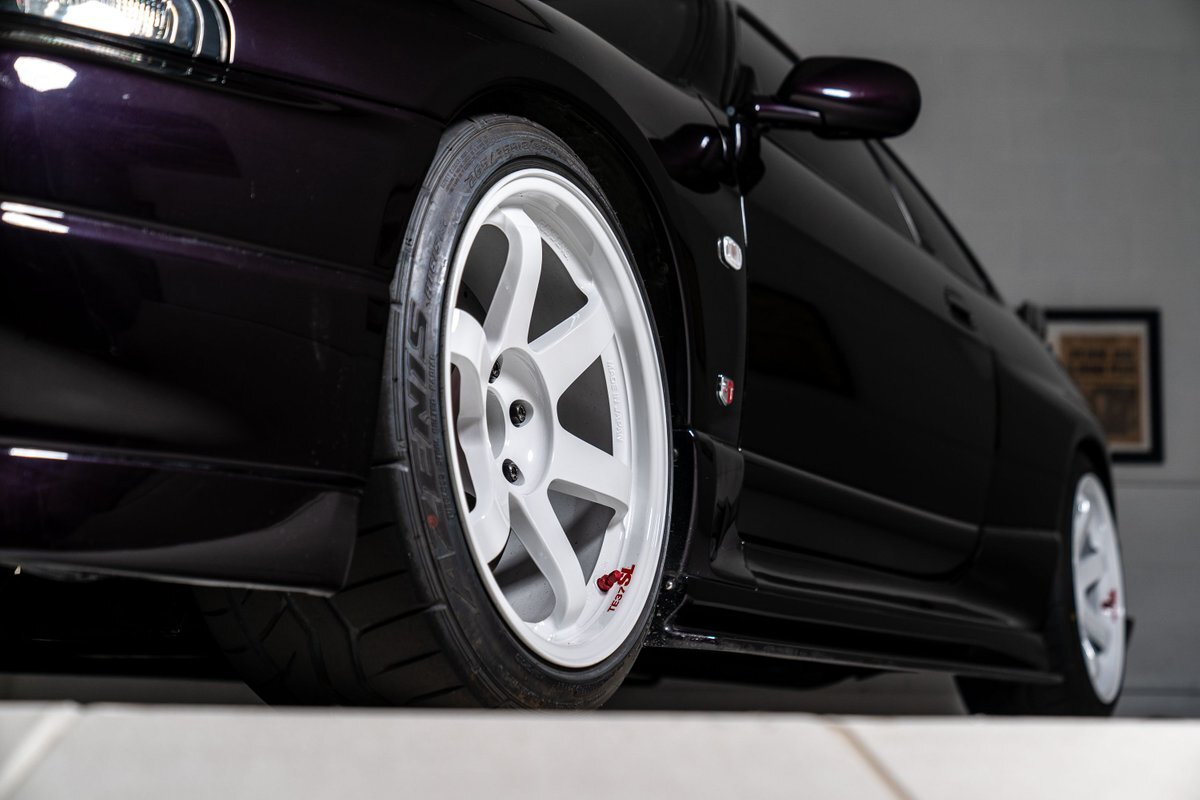 This 1995 Nissan Skyline GT-R is a V-Spec example has been modified with a rebuilt RB26DETT inline-six that was fitted with a Brian Crower 2.85-liter stroker kit and converted to a single turbocharger. A Tomei oil pump, CP pistons, and Supertech valve components were installed at this time, and supporting modifications include a Haltech ECU and a Hypertune intake manifold and fuel rail with 1,300cc injectors. The car is finished in Midnight Purple over black and gray cloth upholstery, and power is sent to all four wheels through a five-speed manual transmission, an ATTESA E-TS all-wheel-drive system, and an active limited-slip rear differential. Additional equipment includes 18" TE37 Wheels in Bright White, a 3" exhaust system, front and rear shock tower braces, a carbon fiber hood, Hasemi Sport body kit, a rear wing, a Bride driver's seat with four-point harnesses, cold air conditioning, and an Alpine CD stereo linked with a subwoofer. Modifications will be listed in gallery and below.
