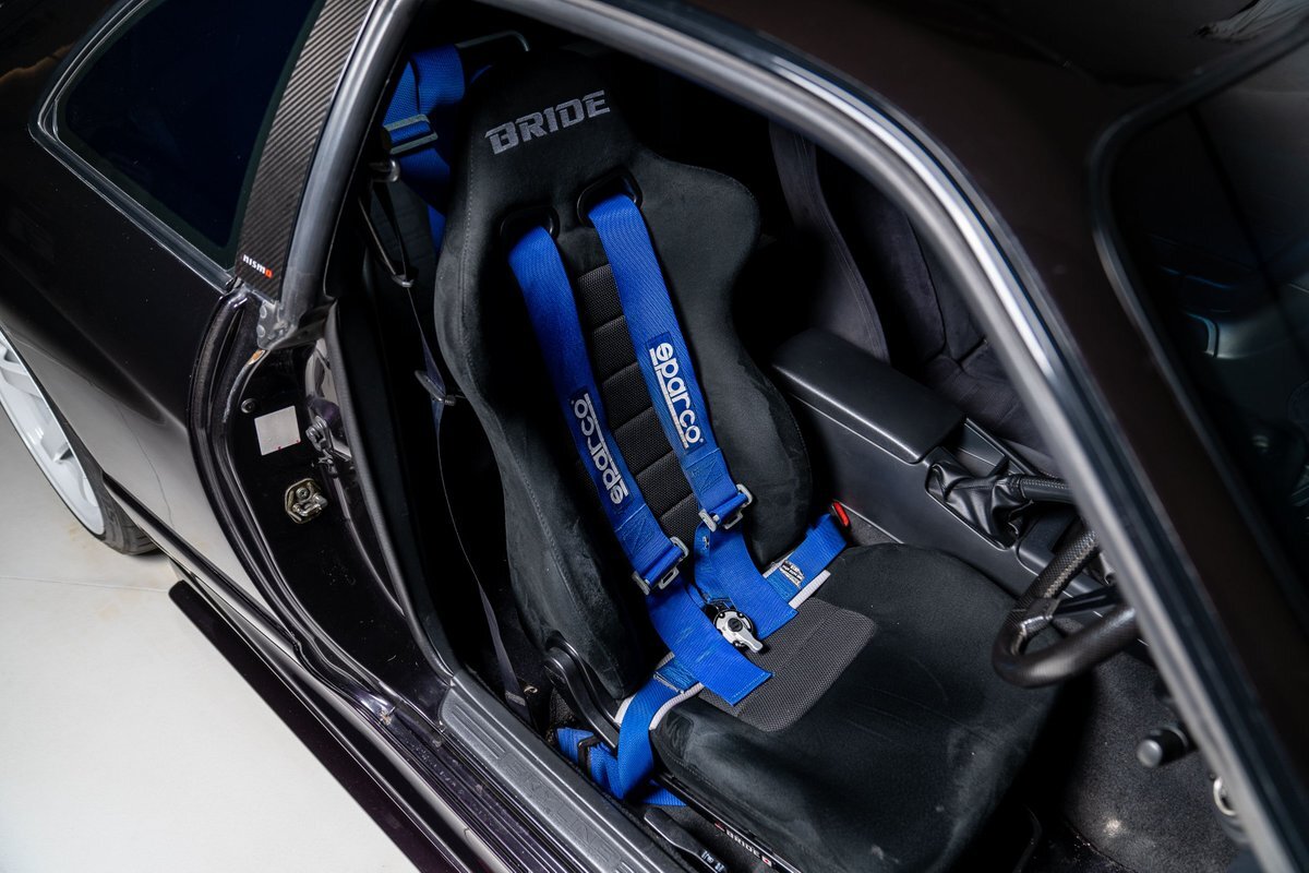 The cabin features black and gray cloth upholstery, and a Bride driver's seat is installed. A harness bar has been mounted between the B-pillars that secures blue Sparco four-point harnesses for the driver. Other interior details include air conditioning, a GT-R-branded shift knob, Nismo-logo carpeted floor mats, and an Alpine AM/FM/CD stereo with an auxiliary input and a trunk-mounted subwoofer. The Nardi steering wheel frames white Nismo gauges including a 320-km/h speedometer, an 11k-rpm tachometer, and gauges for oil pressure, coolant temperature, and fuel level. Additional gauges are mounted in the center stack as well as in an aftermarket pod on top of the dash. The replacement six-digit odometer shows 2,700 kilometers (~1,700 miles).