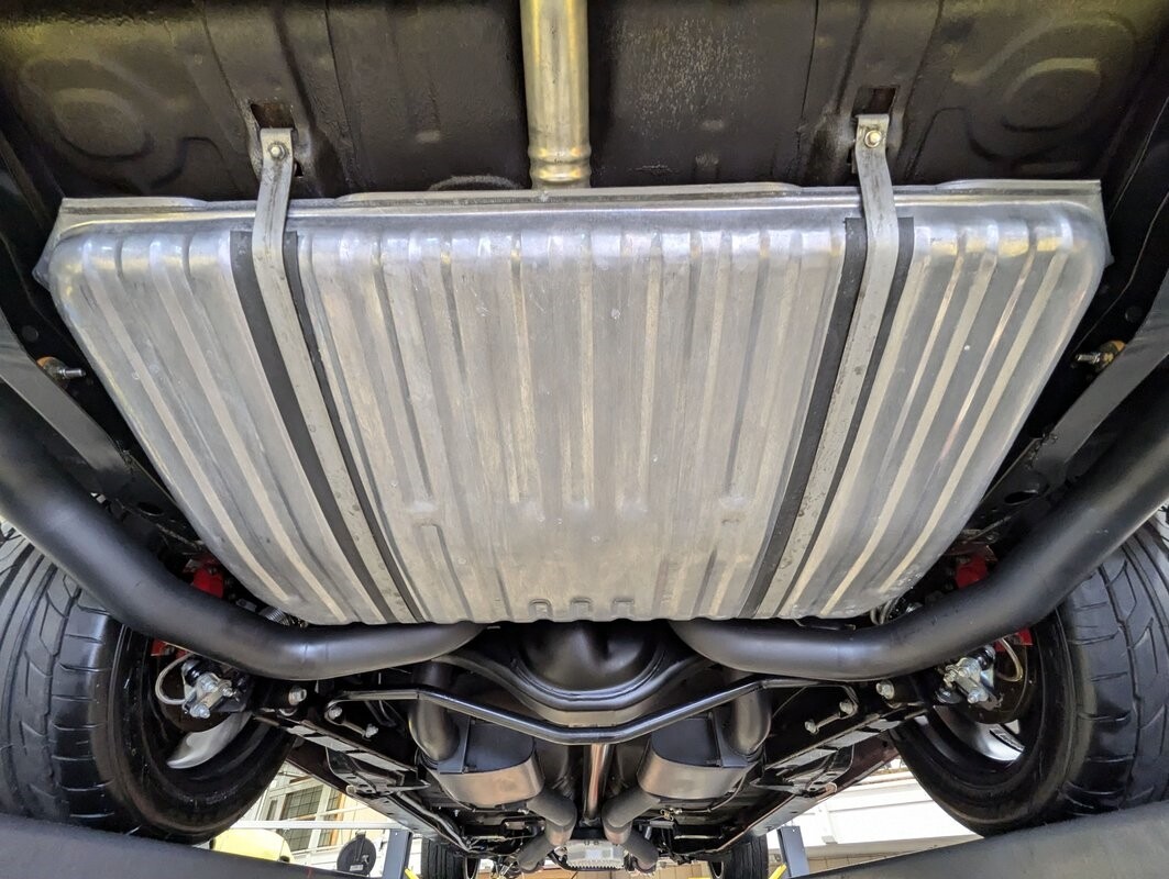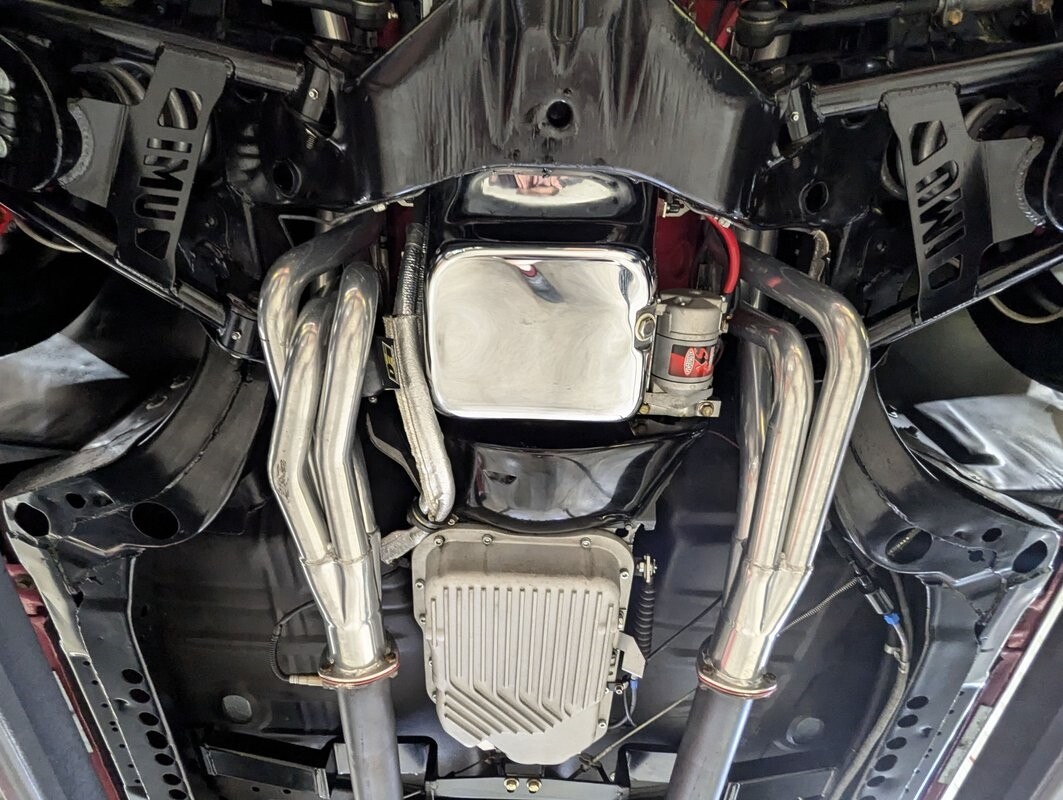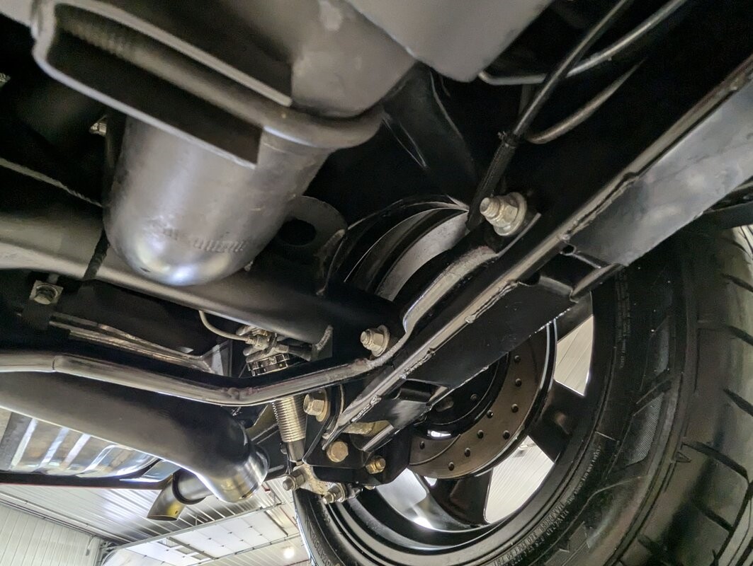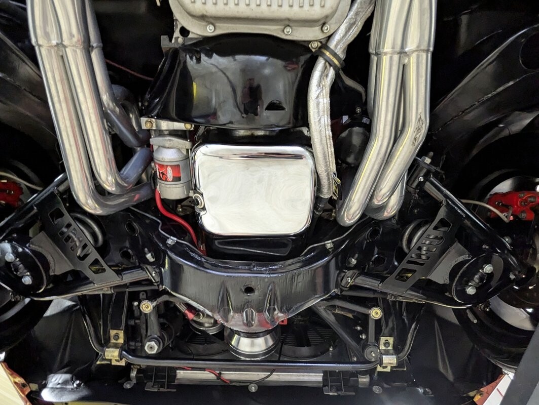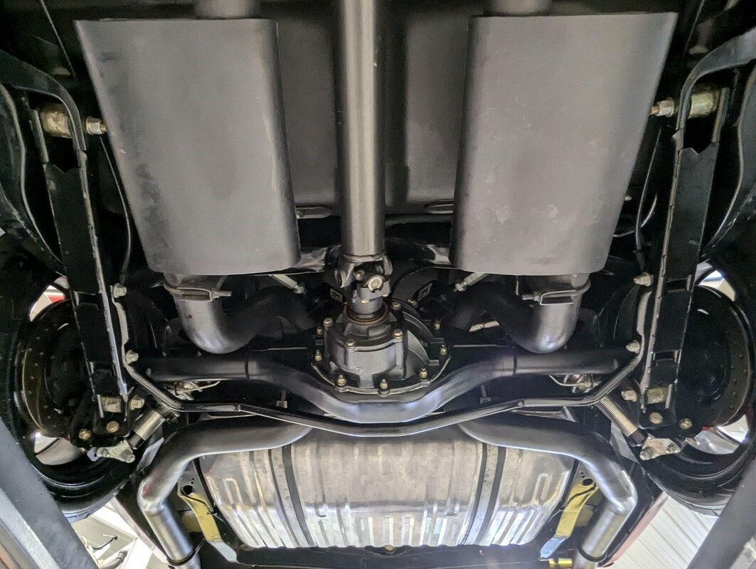 UNDERSIDE: It was body off frame restored, under this car looks new and has many performance upgrades. Upfront is a UMI suspension with tubular control arms, QA1 adjustable coilover adjustable gas shocks and a swaybar. In back it has adjustable upper control arms, boxed lower control arms, a swaybar and coilover adjustable gas shocks. Wilwood brake system with drilled and slotted disc and red calipers at all four wheels. All new lines e-brake assembly. Custom 3 inch exhaust with resonators, mufflers and turn down tips. All new fuel system compatible with the fuel injection. Looking up at the motor it has a chrome oil pan and high torque starter. It has been upgraded with a high-performance Art Carr 200R-4 overdrive automatic trans with an aluminum pan. A rebuilt driveshaft leads back to a Heavy duty 9 inch rear with 3.55 posi gears. The floors are spotless and smooth rust-free metal painted satin black. The chassis is painted semi-gloss.
