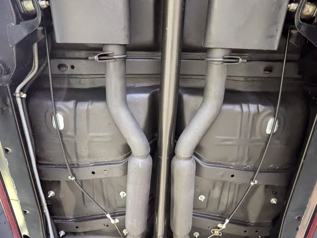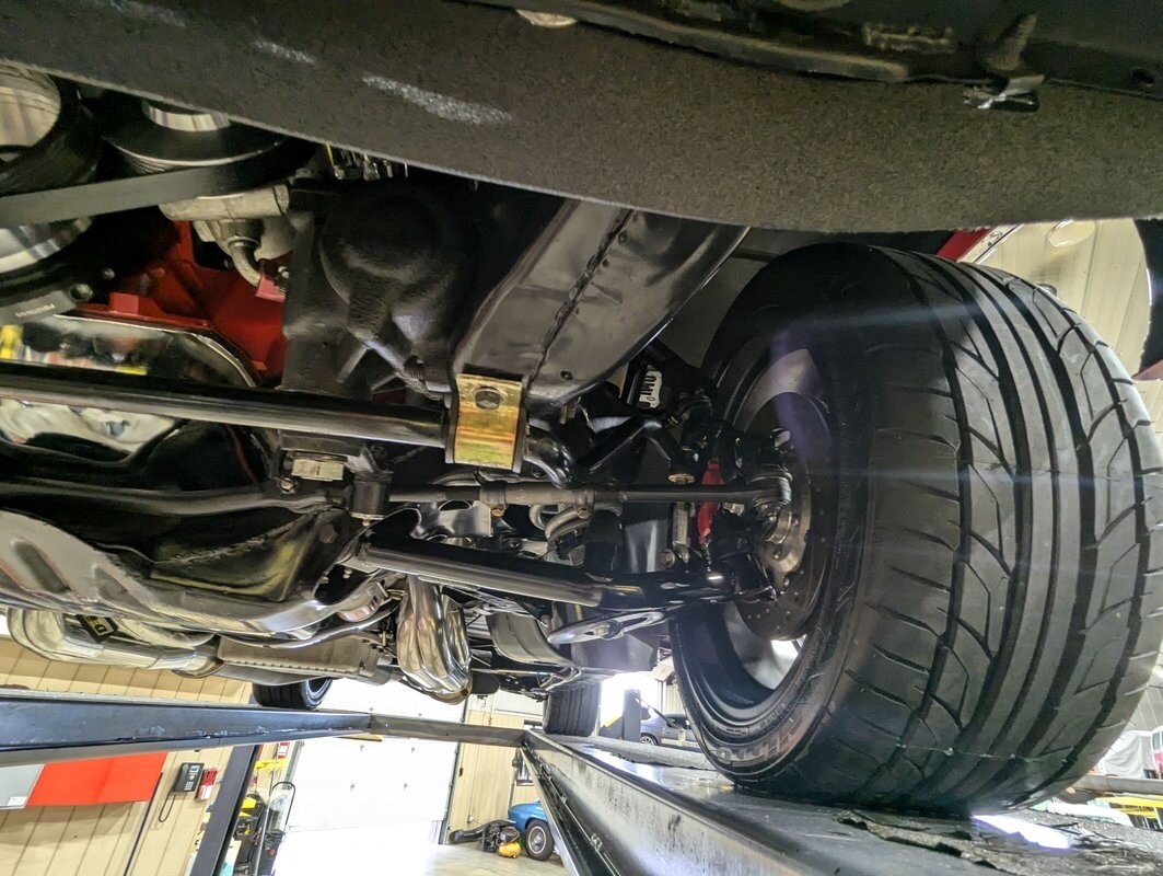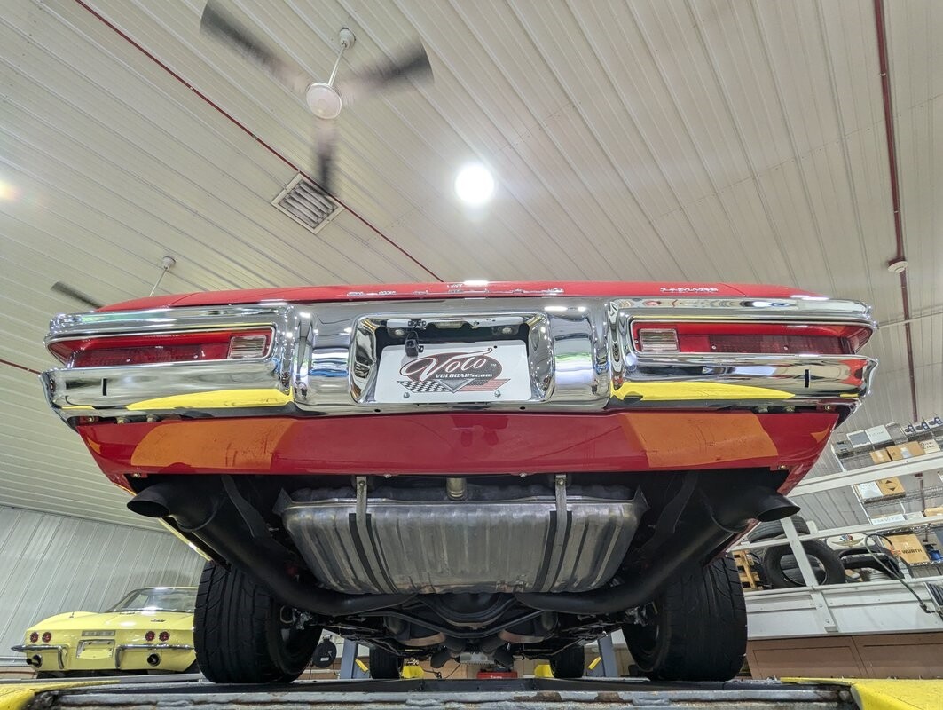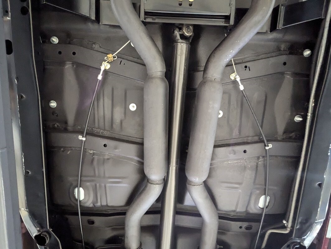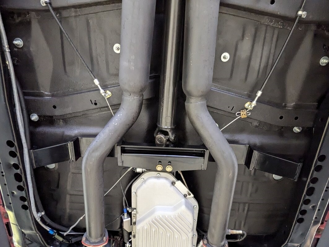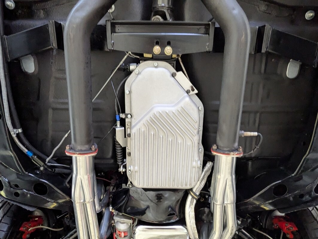 UNDERSIDE: It was body off frame restored, under this car looks new and has many performance upgrades. Upfront is a UMI suspension with tubular control arms, QA1 adjustable coilover adjustable gas shocks and a swaybar. In back it has adjustable upper control arms, boxed lower control arms, a swaybar and coilover adjustable gas shocks. Wilwood brake system with drilled and slotted disc and red calipers at all four wheels. All new lines e-brake assembly. Custom 3 inch exhaust with resonators, mufflers and turn down tips. All new fuel system compatible with the fuel injection. Looking up at the motor it has a chrome oil pan and high torque starter. It has been upgraded with a high-performance Art Carr 200R-4 overdrive automatic trans with an aluminum pan. A rebuilt driveshaft leads back to a Heavy duty 9 inch rear with 3.55 posi gears. The floors are spotless and smooth rust-free metal painted satin black. The chassis is painted semi-gloss.