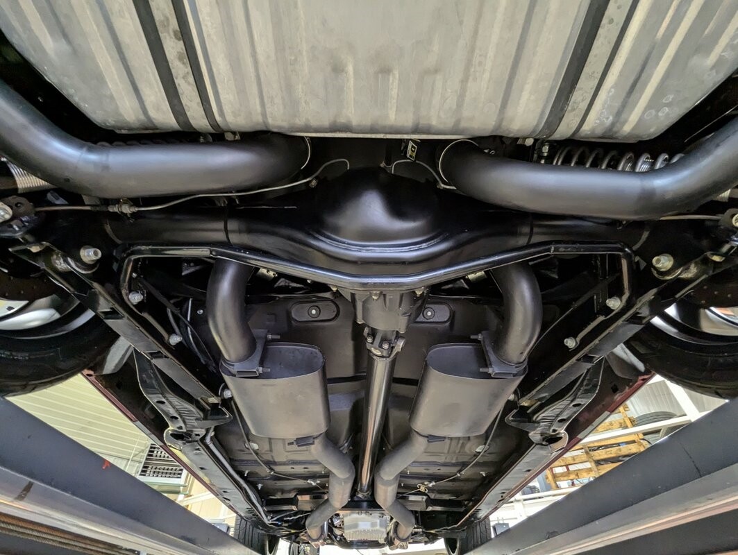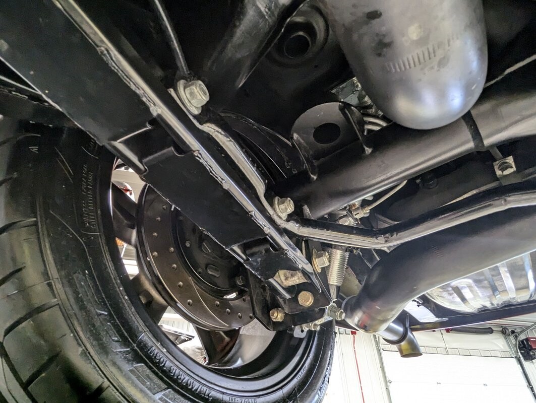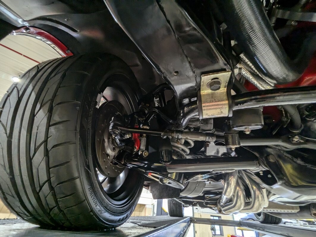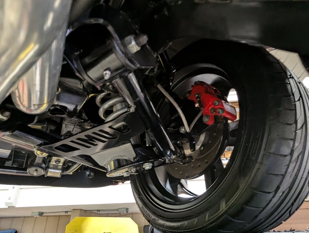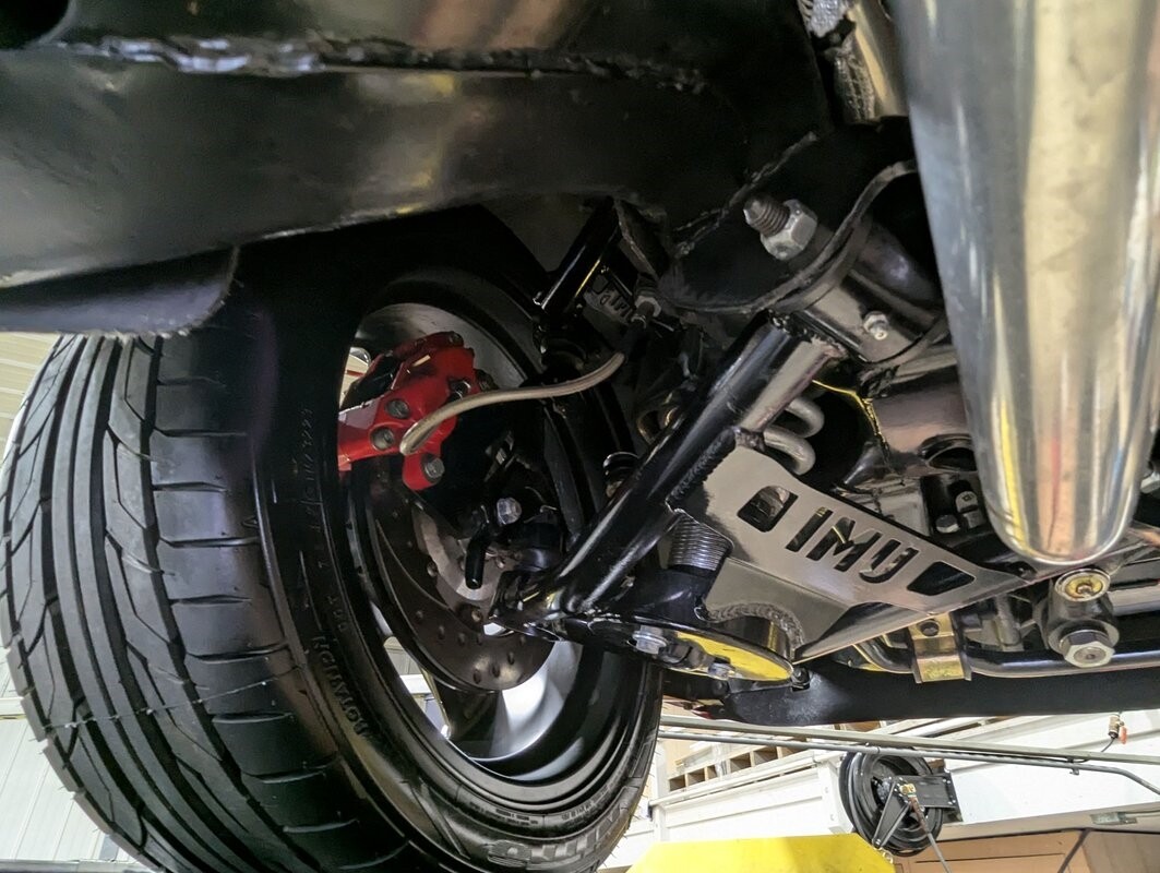 UNDERSIDE: It was body off frame restored, under this car looks new and has many performance upgrades. Upfront is a UMI suspension with tubular control arms, QA1 adjustable coilover adjustable gas shocks and a swaybar. In back it has adjustable upper control arms, boxed lower control arms, a swaybar and coilover adjustable gas shocks. Wilwood brake system with drilled and slotted disc and red calipers at all four wheels. All new lines e-brake assembly. Custom 3 inch exhaust with resonators, mufflers and turn down tips. All new fuel system compatible with the fuel injection. Looking up at the motor it has a chrome oil pan and high torque starter. It has been upgraded with a high-performance Art Carr 200R-4 overdrive automatic trans with an aluminum pan. A rebuilt driveshaft leads back to a Heavy duty 9 inch rear with 3.55 posi gears. The floors are spotless and smooth rust-free metal painted satin black. The chassis is painted semi-gloss.