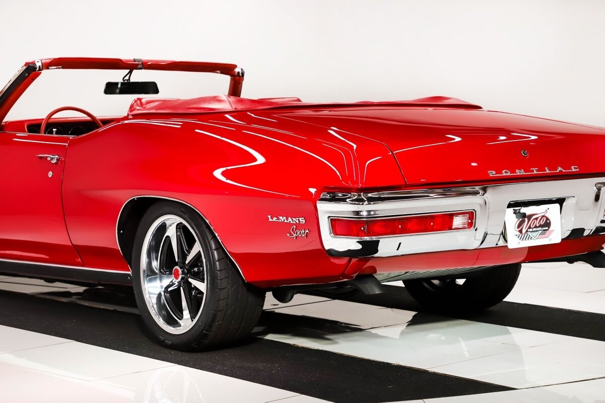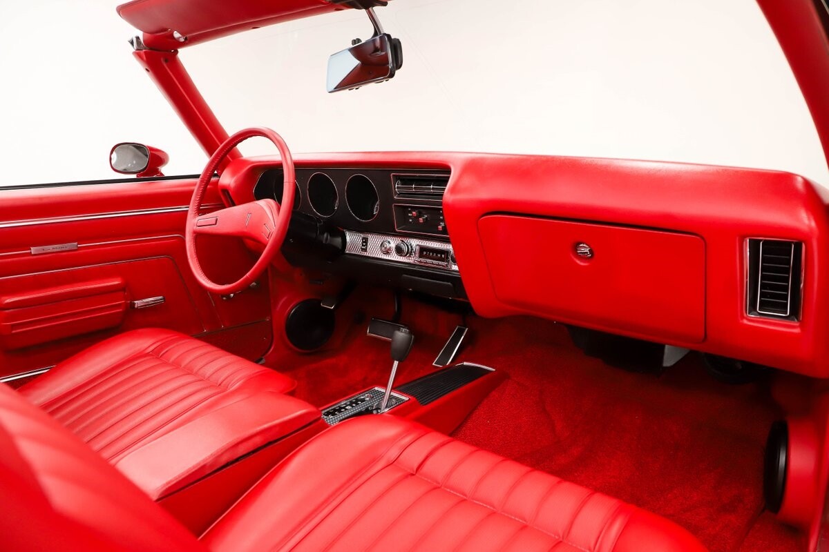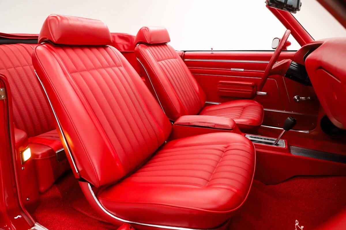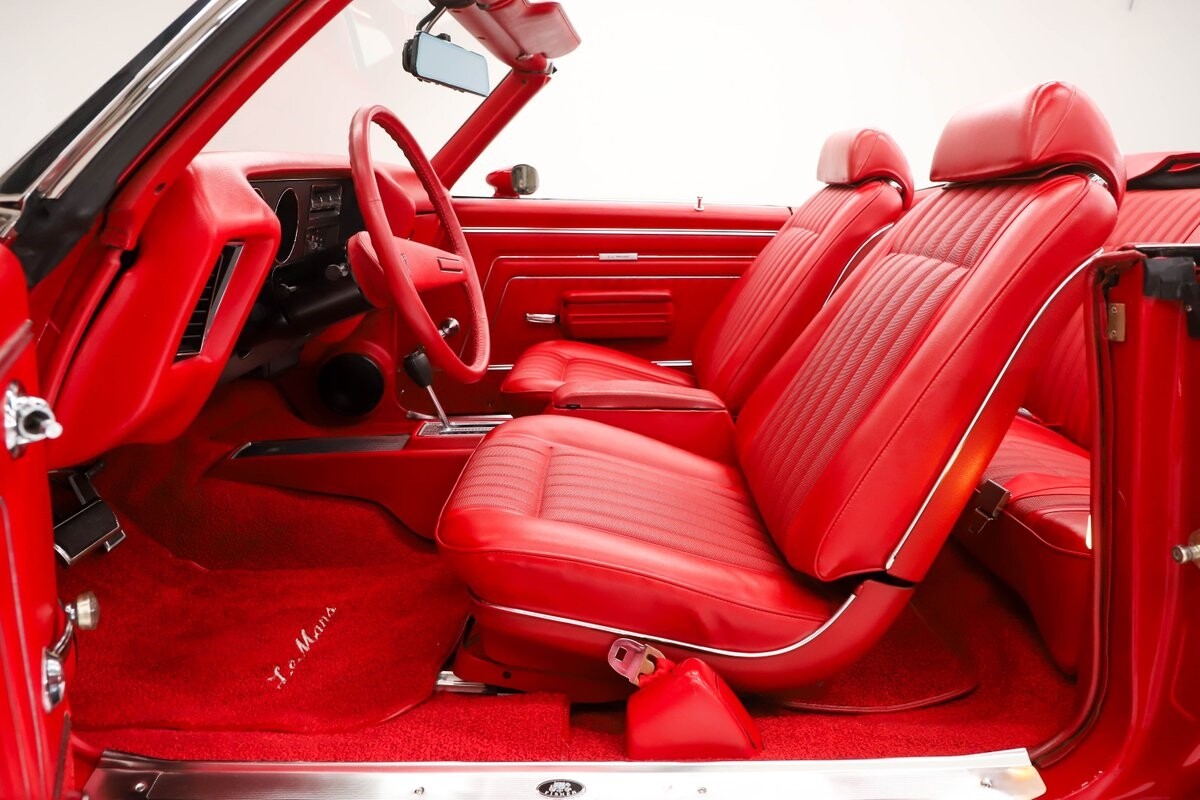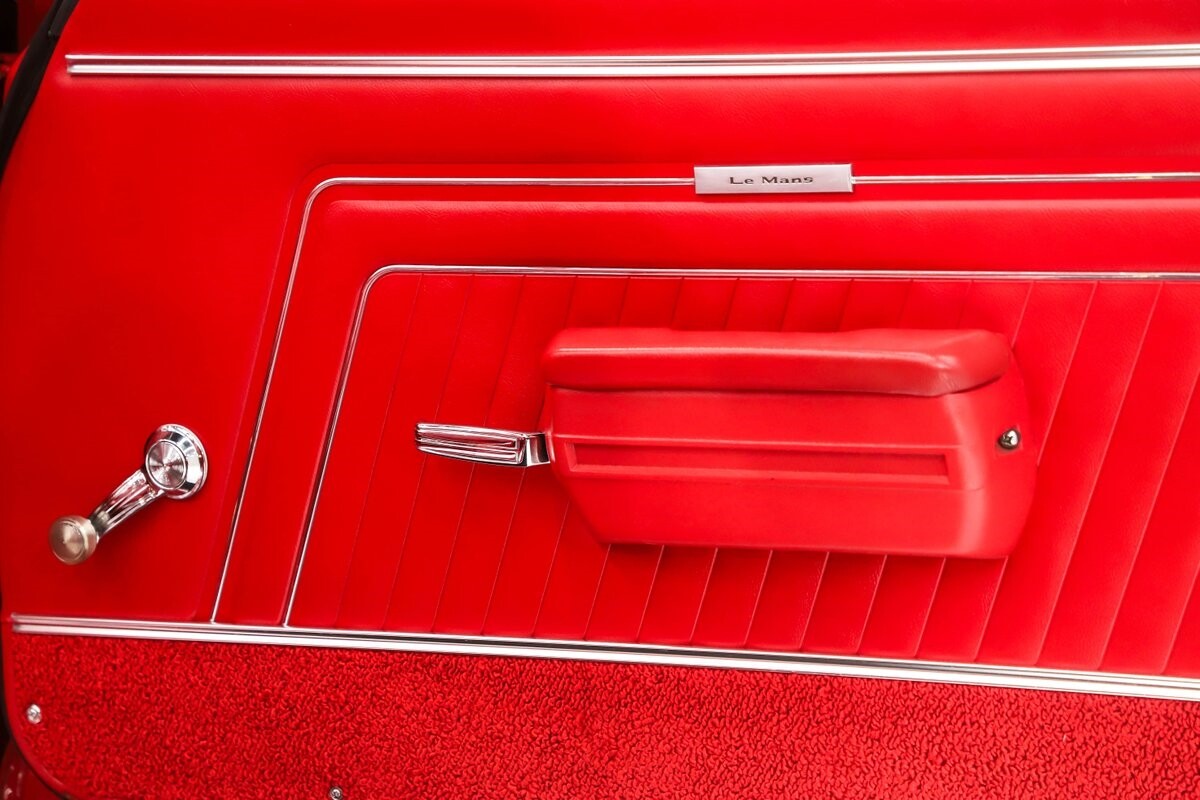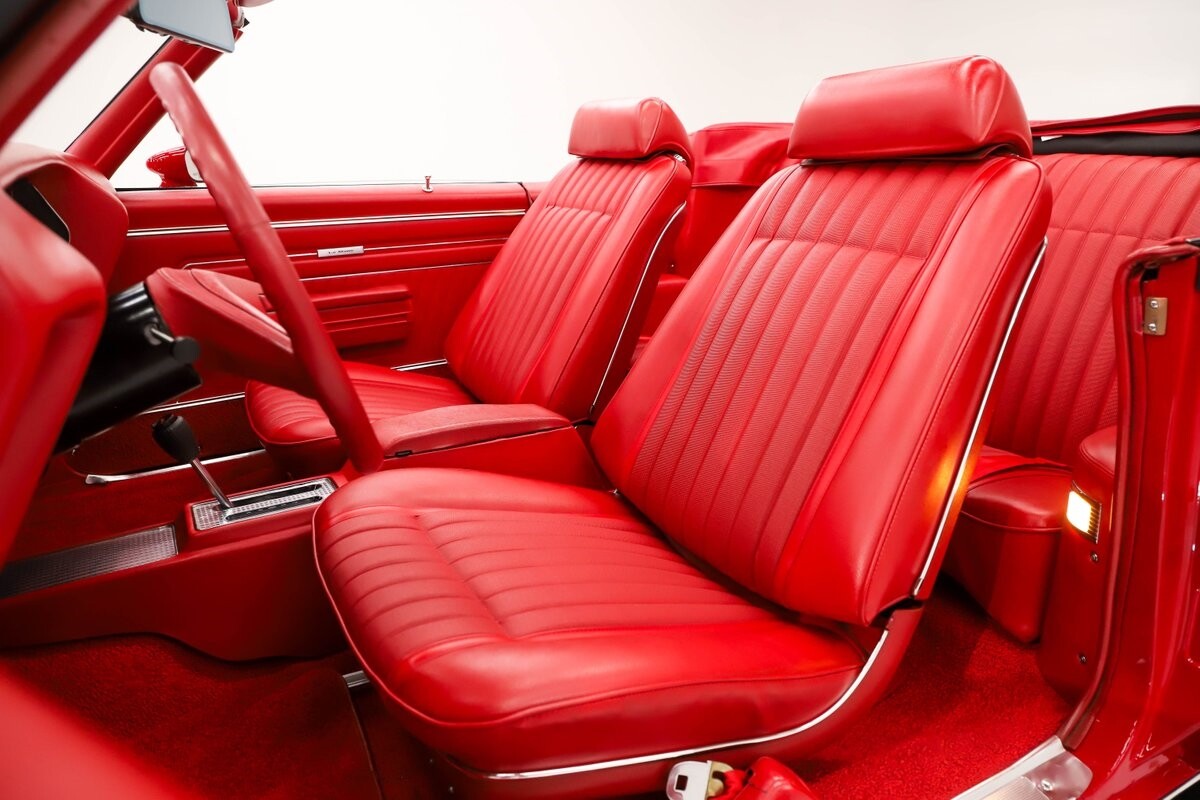 EXTERIOR: Incredible body and paint, better than new! Laser straight with body gaps like a Mercedes. Fitted with a GTO scooped hood and dual sport mirrors. Power top upgraded with a rich black cloth and glass window. The framework was completely prepped and painted. All the weatherstrips and seals were replaced. All new chrome and trim. The windshield was replaced. Upgraded with bright HID headlights. Sitting proud on a new modern version of the rally II wheels. They are billet 18x8s in front, 18x9s in back and are wrapped in performance tires.