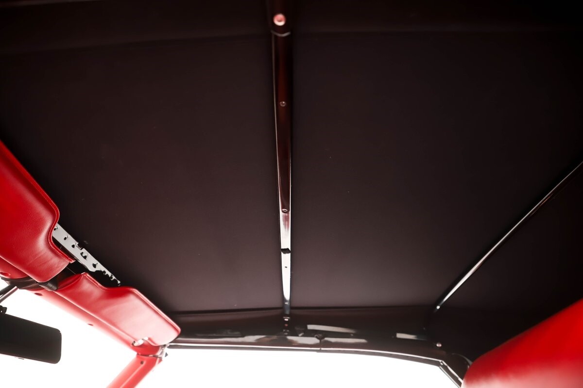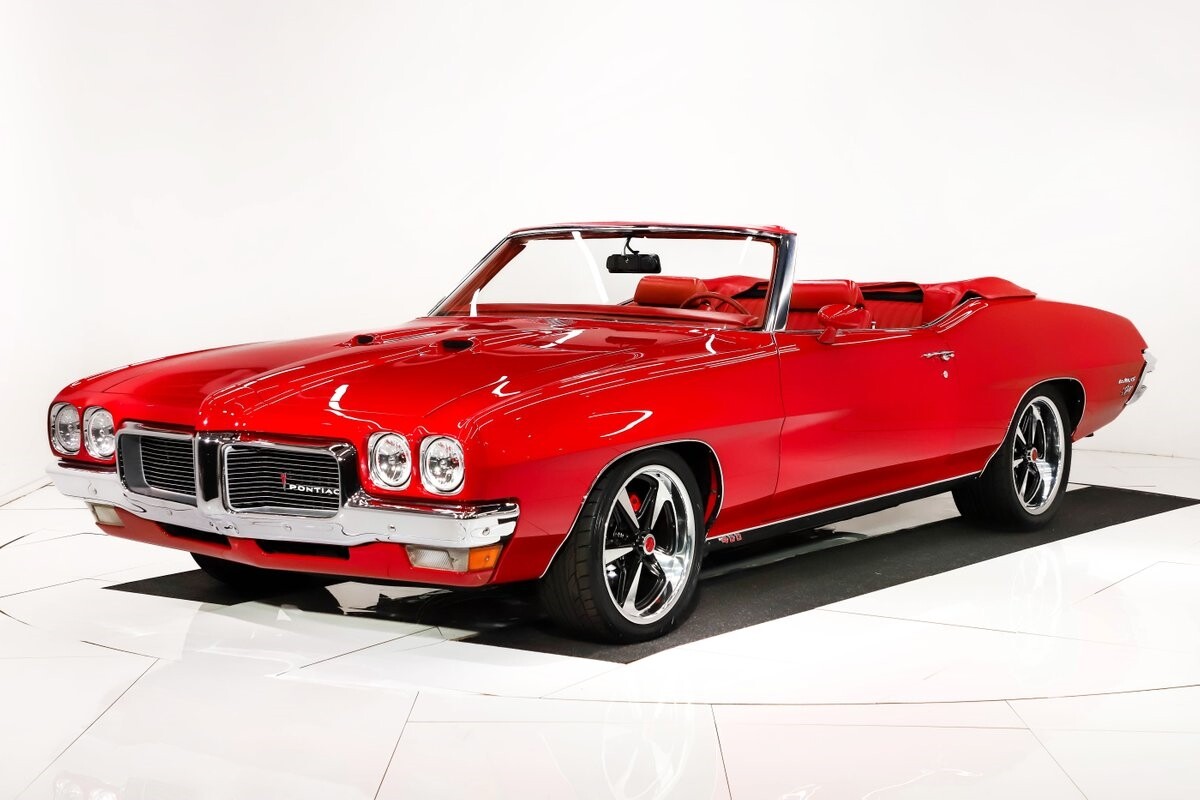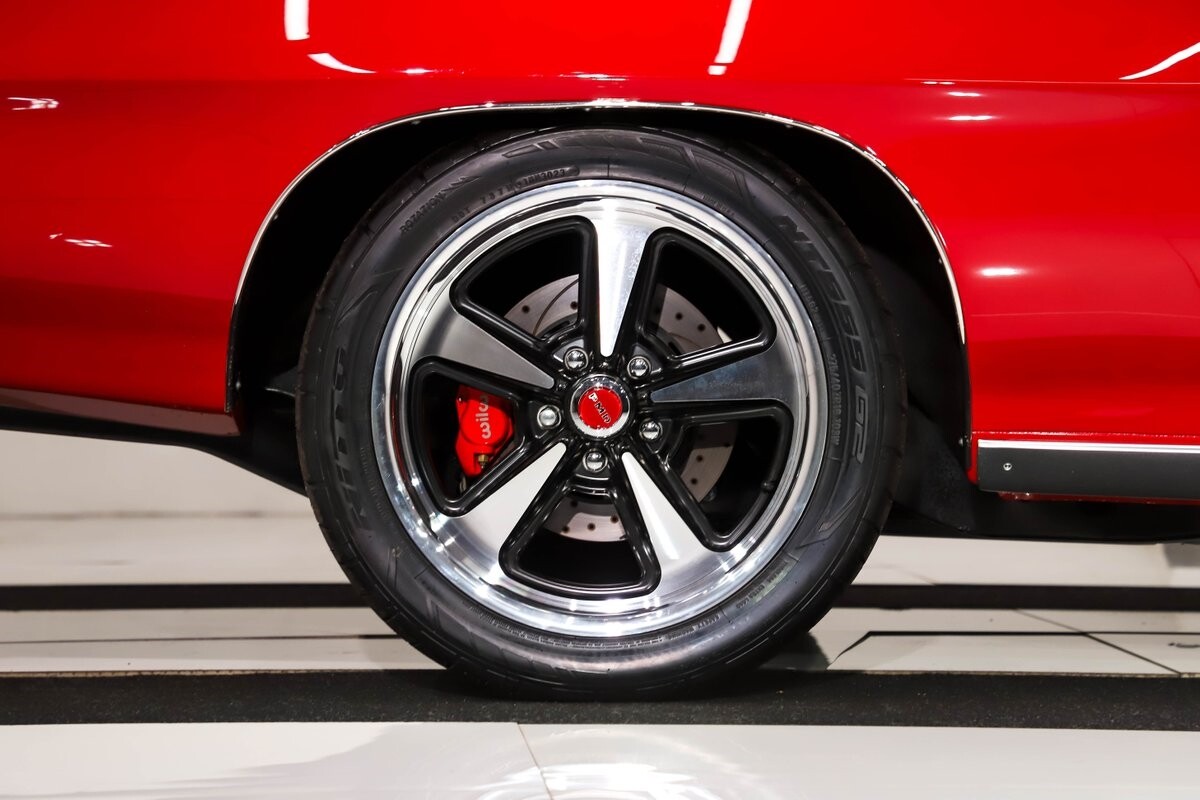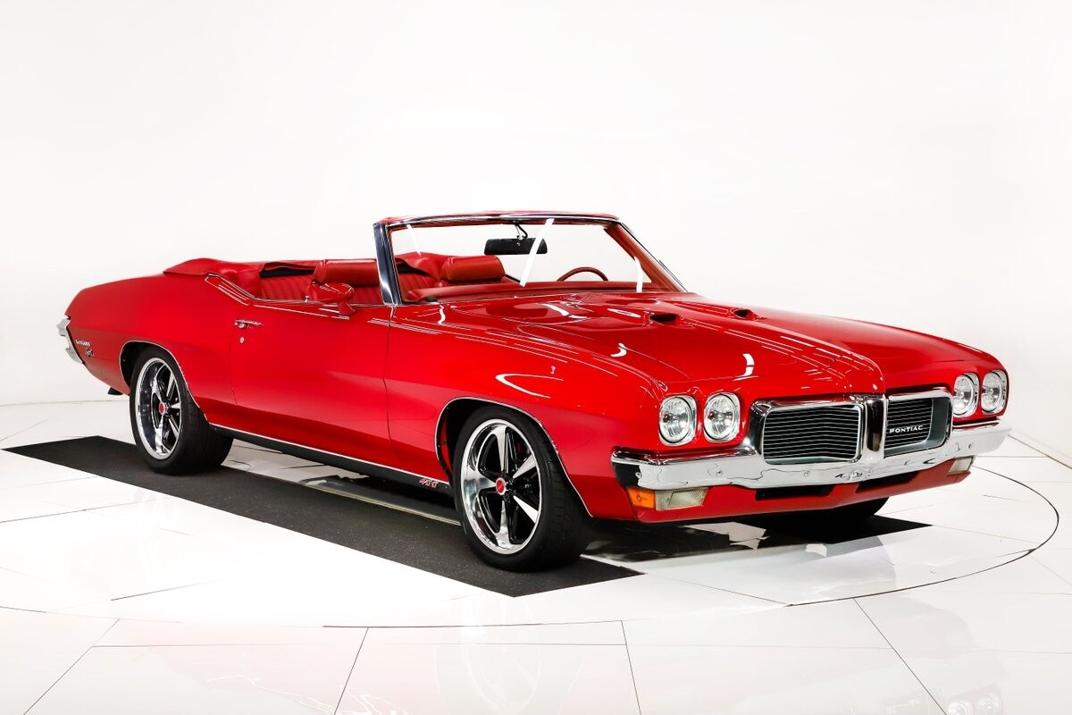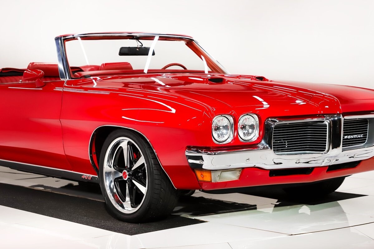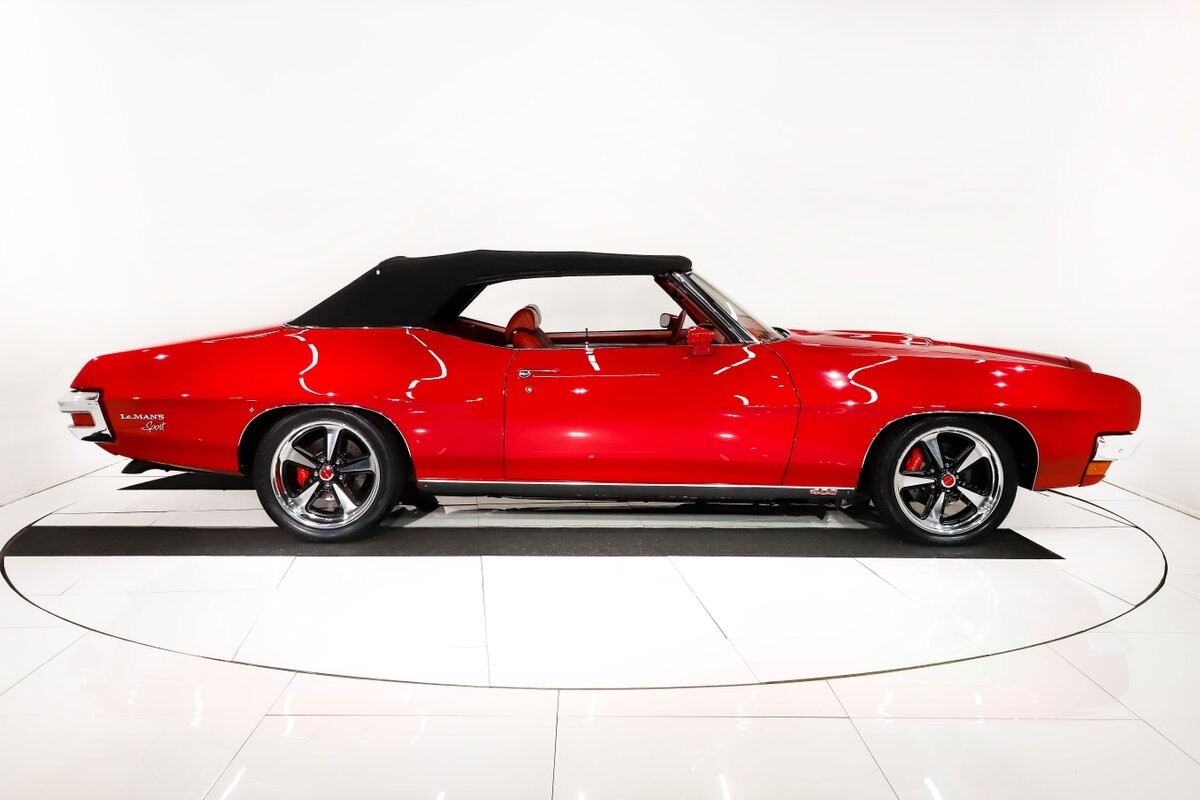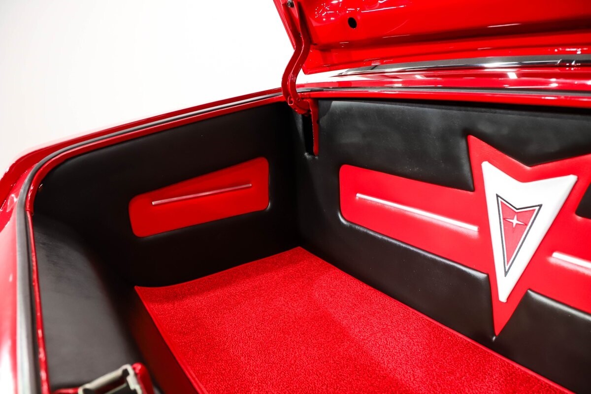 EXTERIOR: Incredible body and paint, better than new! Laser straight with body gaps like a Mercedes. Fitted with a GTO scooped hood and dual sport mirrors. Power top upgraded with a rich black cloth and glass window. The framework was completely prepped and painted. All the weatherstrips and seals were replaced. All new chrome and trim. The windshield was replaced. Upgraded with bright HID headlights. Sitting proud on a new modern version of the rally II wheels. They are billet 18x8s in front, 18x9s in back and are wrapped in performance tires.