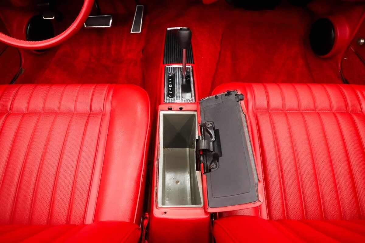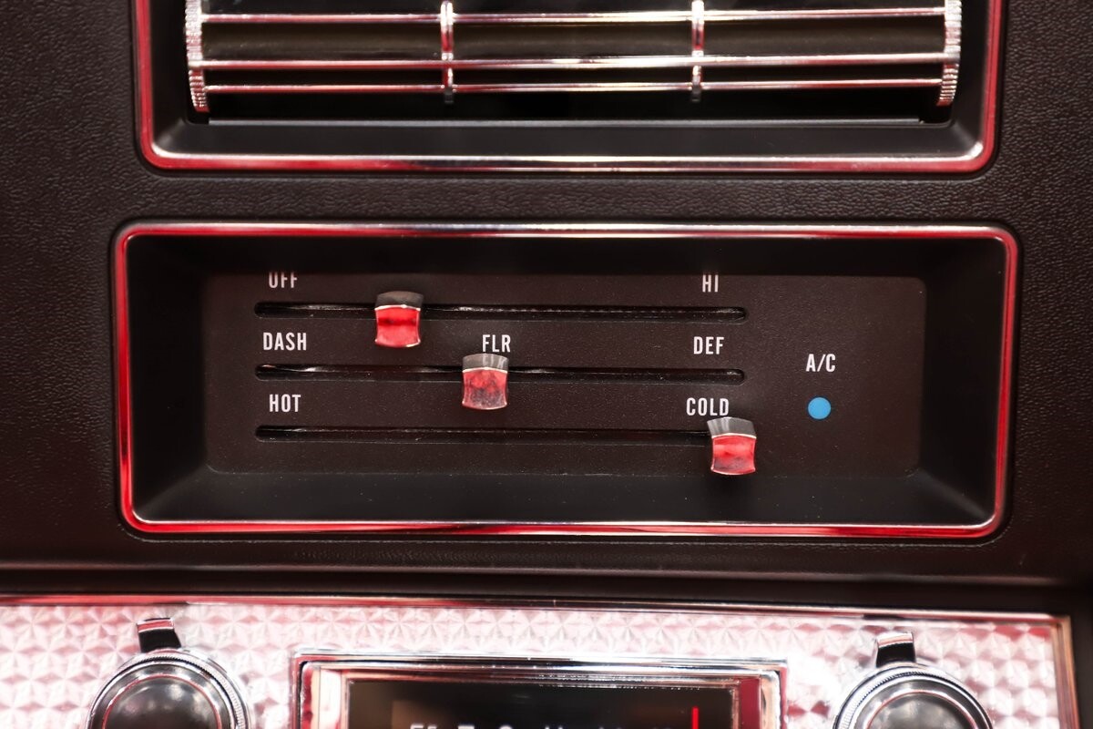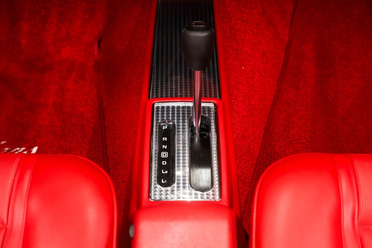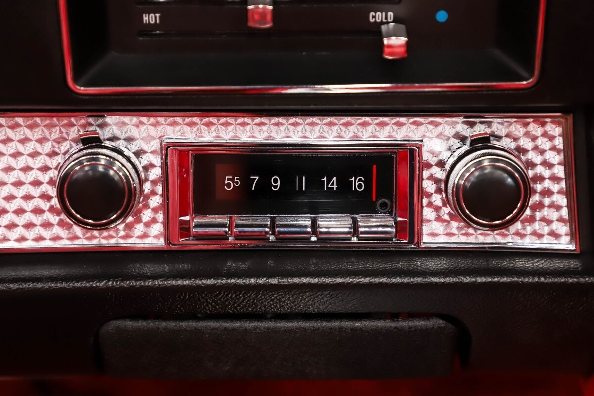 INTERIOR: Precision fit and finishes. It is all one shade of red that matches the exterior. On the floor is new carpet with embroidered mats. The seats were rebuilt and have new cushions, the upholstery was installed without a wrinkle. The seatbacks, headrests and chrome trim is new. Both have modern power seat assemblies that glide back and forth effortlessly. The center console is mint, and the shift indicator is updated for the overdrive. Door panels, armrests, handles are new. The dash pad and instrument panel are in excellent shape. I love the red lit Dakota gauges and the push button start. Upgraded with electric slide heater controls. The steering wheel is wrapped with glove soft leather. There is a retro stereo with satellite and aux plug. The kickpanels has built in speakers and there's an amp and subwoofer in the trunk. Oh yeah, another cool feature is the front and rear cameras with the monitor in the mirror!