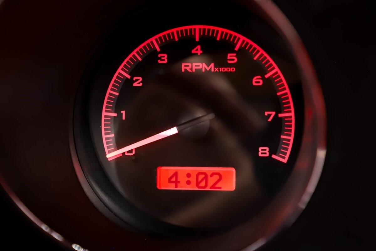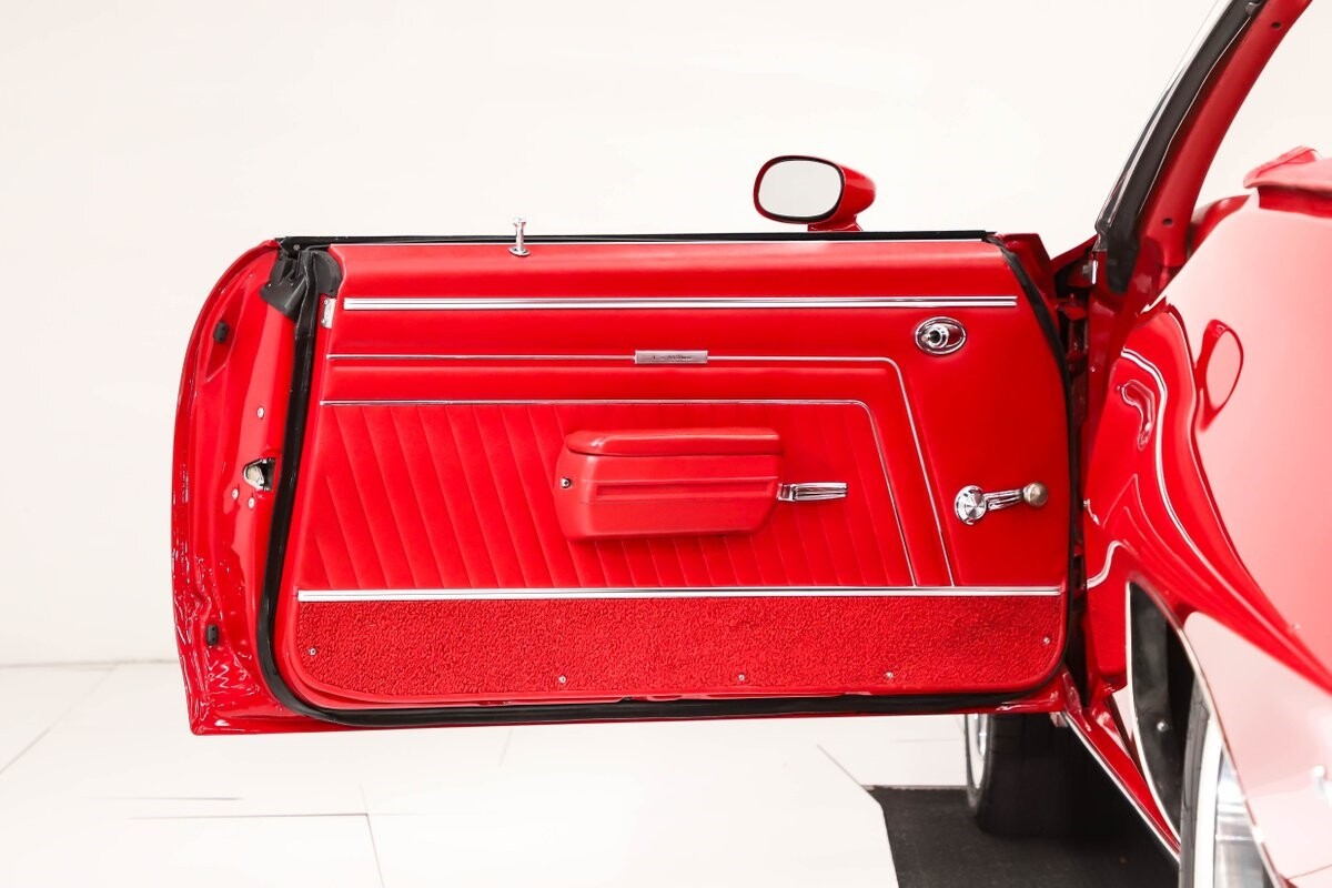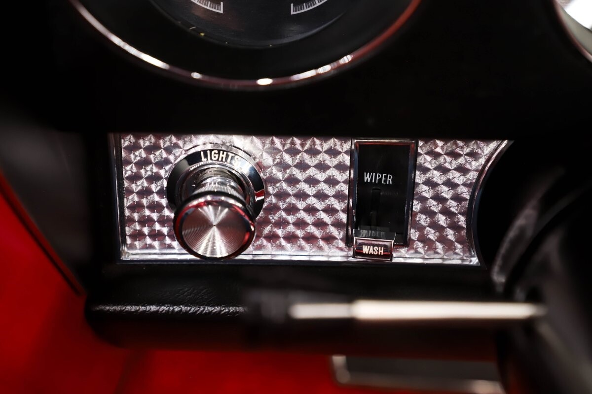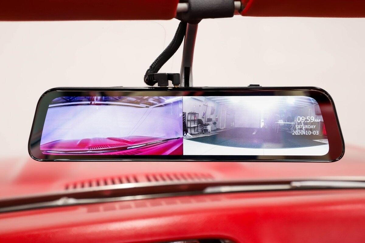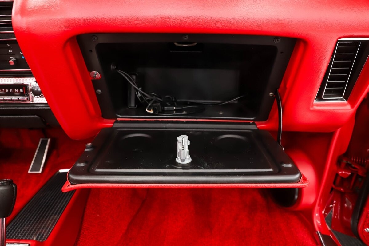 INTERIOR: Precision fit and finishes. It is all one shade of red that matches the exterior. On the floor is new carpet with embroidered mats. The seats were rebuilt and have new cushions, the upholstery was installed without a wrinkle. The seatbacks, headrests and chrome trim is new. Both have modern power seat assemblies that glide back and forth effortlessly. The center console is mint, and the shift indicator is updated for the overdrive. Door panels, armrests, handles are new. The dash pad and instrument panel are in excellent shape. I love the red lit Dakota gauges and the push button start. Upgraded with electric slide heater controls. The steering wheel is wrapped with glove soft leather. There is a retro stereo with satellite and aux plug. The kickpanels has built in speakers and there's an amp and subwoofer in the trunk. Oh yeah, another cool feature is the front and rear cameras with the monitor in the mirror!