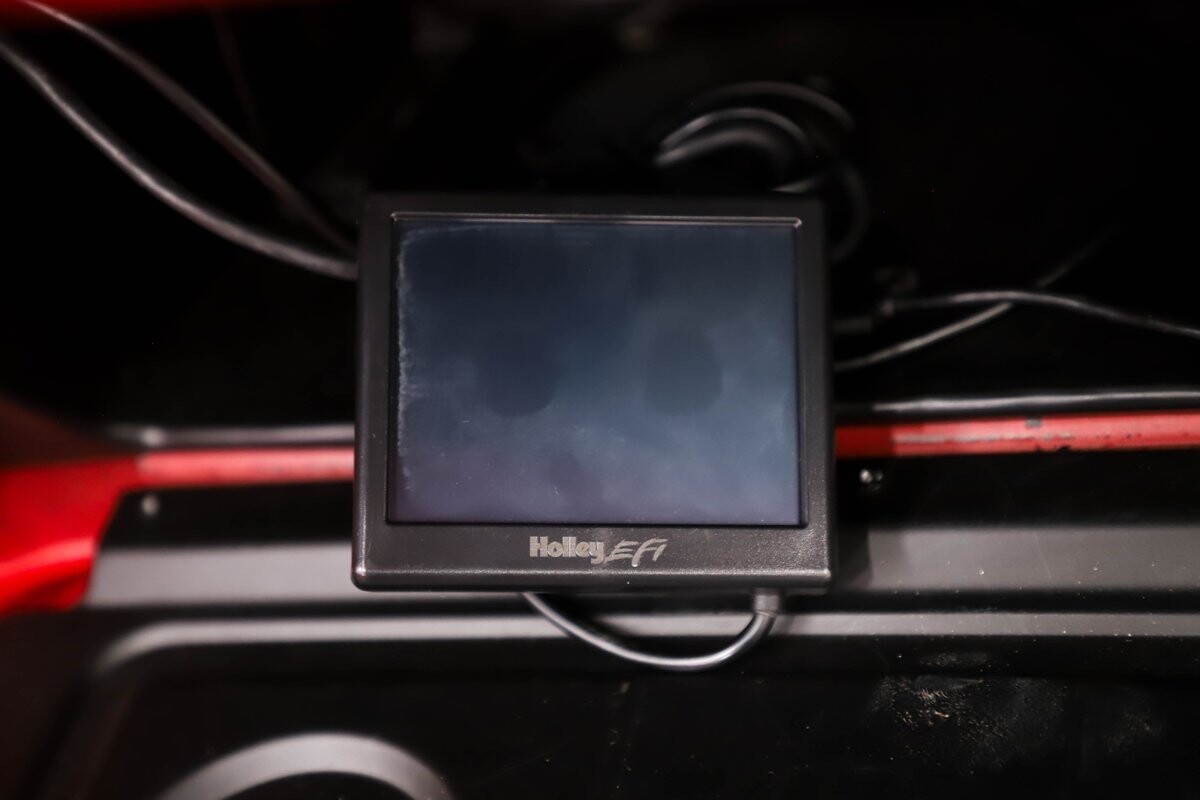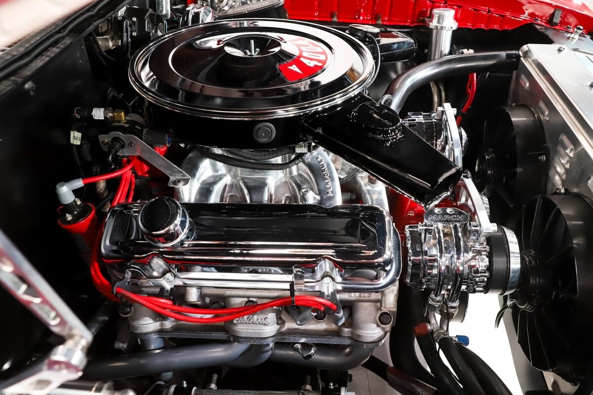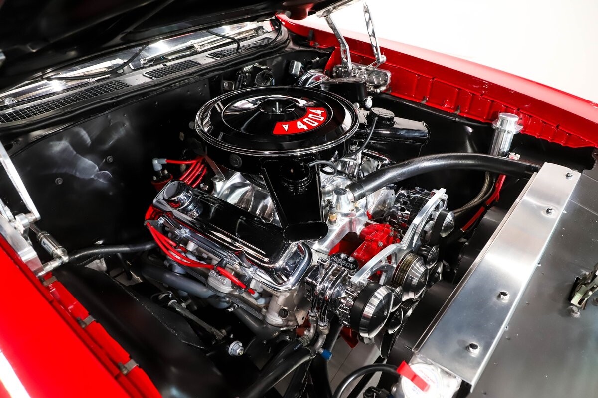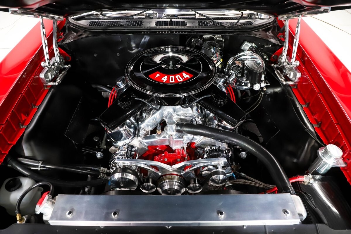 ENGINE COMPARTMENT: Sharp looking compartment and at the heart of it is a built Pontiac 400 motor with a performance cam, Edelbrock aluminum heads and a polished intake with a Holley fuel injection on top. It also has An MSD ignition and nickel-plated headers. Beautiful March front runner system with billet brackets and pulleys, a serpentine belt, polished compressor, alternator, and power steering with a remote reservoir. A Vintage Air heat and a/c system will keep you comfy. The chrome power brake booster has a Wilwood master cylinder. The wiper motor is new and the washers are hooked up. A big aluminum radiator with dual electric fans keeps it running cool. The entire engine bay is clean and painted nice, the firewall has been made smooth. Those billet hinges aren't just pretty, the hood opens so smoothly because of them.