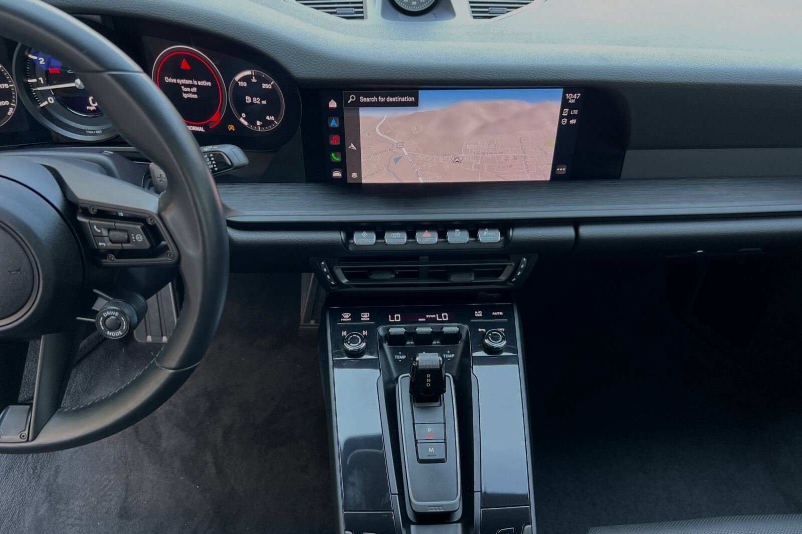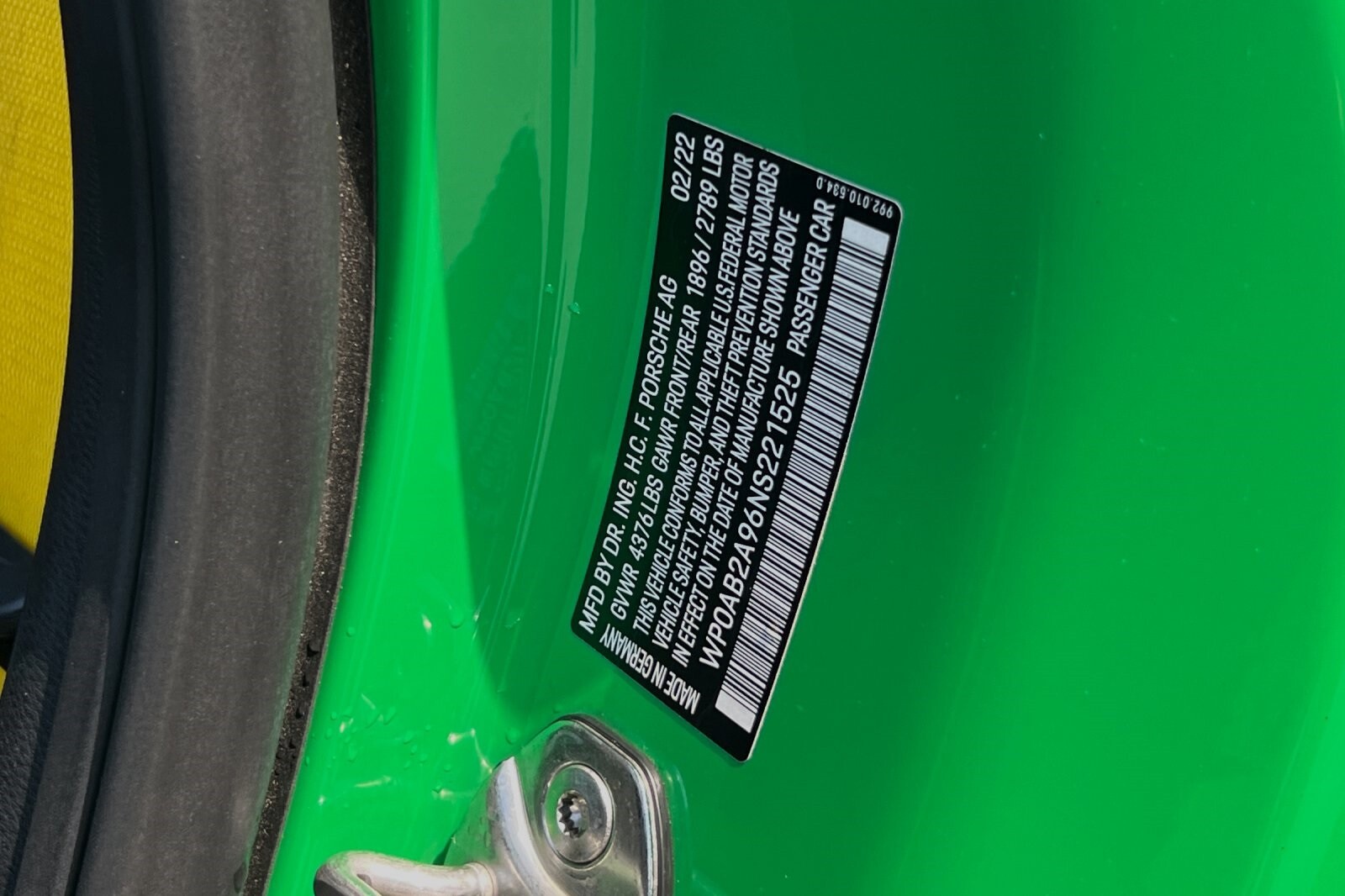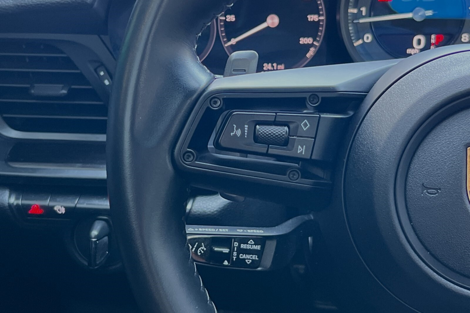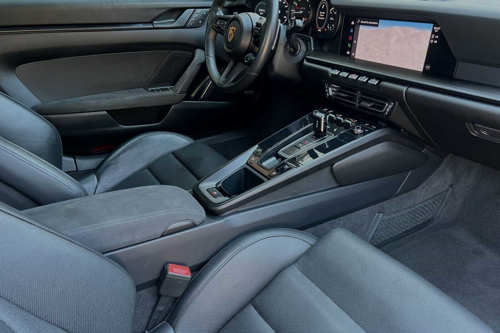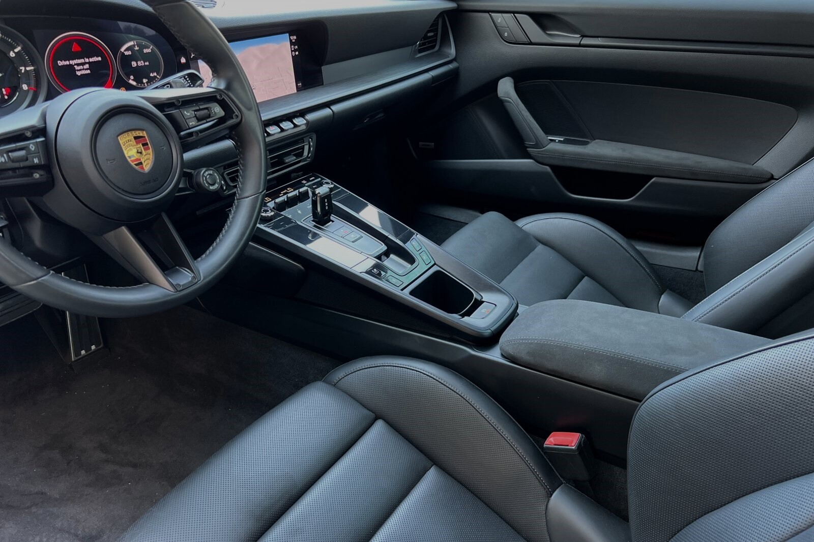This Porsche San Luis Obispo 2022 Python Green Porsche 911 Carrera GTS is well equipped and includes these features and benefits: 18-Way Adaptive Sport Seats Plus w/Memory Package, Premium Package (Ambient Lighting, BOSE Surround Sound System, Lane Change Assist (LCA), Power Folding Exterior Mirrors, and Surround View), Storage Package, 23.7 Gal. Extended Range Fuel Tank, Porsche Ceramic Composite Brakes (PCCB) in Yellow, Power Steering Plus, Rear Axle Steering, Wheels: 20 Front/21 Rear RS Spyder Design, 4-Wheel Disc Brakes, 8 Speakers, ABS brakes, Adaptive suspension, Air Conditioning, Alloy wheels, Auto-dimming door mirrors, Auto-dimming Rear-View mirror, Automatic temperature control, Brake assist, Bumpers: body-color, Delay-off headlights, Driver door bin, Driver vanity mirror, Dual front impact airbags, Dual front side impact airbags, Electronic Stability Control, Exterior Parking Camera Rear, Four wheel independent suspension, Front anti-roll bar, Front Bucket Seats, Front Center Armrest, Front dual zone A/C, Front reading lights, Fully automatic headlights, Garage door transmitter: HomeLink, Heated door mirrors, Heated front seats, Illuminated entry, Low tire pressure warning, Navigation system: Porsche Communication Management (PCM), Occupant sensing airbag, Outside temperature display, Overhead airbag, Overhead console, Passenger door bin, Passenger vanity mirror, Porsche Communication Management, Power door mirrors, Power driver seat, Power passenger seat, Power steering, Power windows, Radio data system, Rain sensing wipers, Rear anti-roll bar, Rear fog lights, Rear window defroster, Remote keyless entry, Security system, Speed control, Split folding rear seat, Spoiler, Sport steering wheel, Steering wheel mounted audio controls, Tachometer, Telescoping steering wheel, Tilt steering wheel, Traction control, Trip computer, and Variably intermittent wipers. 18-Way Adaptive Sport Seats Plus w/Memory Package, 23.7 Gal. Extended Range Fuel Tank, Ambient Lighting, BOSE Surround Sound System, Lane Change Assist (LCA), Porsche Ceramic Composite Brakes (PCCB) in Yellow, Power Folding Exterior Mirrors, Power Steering Plus, Premium Package, Rear Axle Steering, Storage Package, Surround View, Wheels: 20 Front/21 Rear RS Spyder Design.