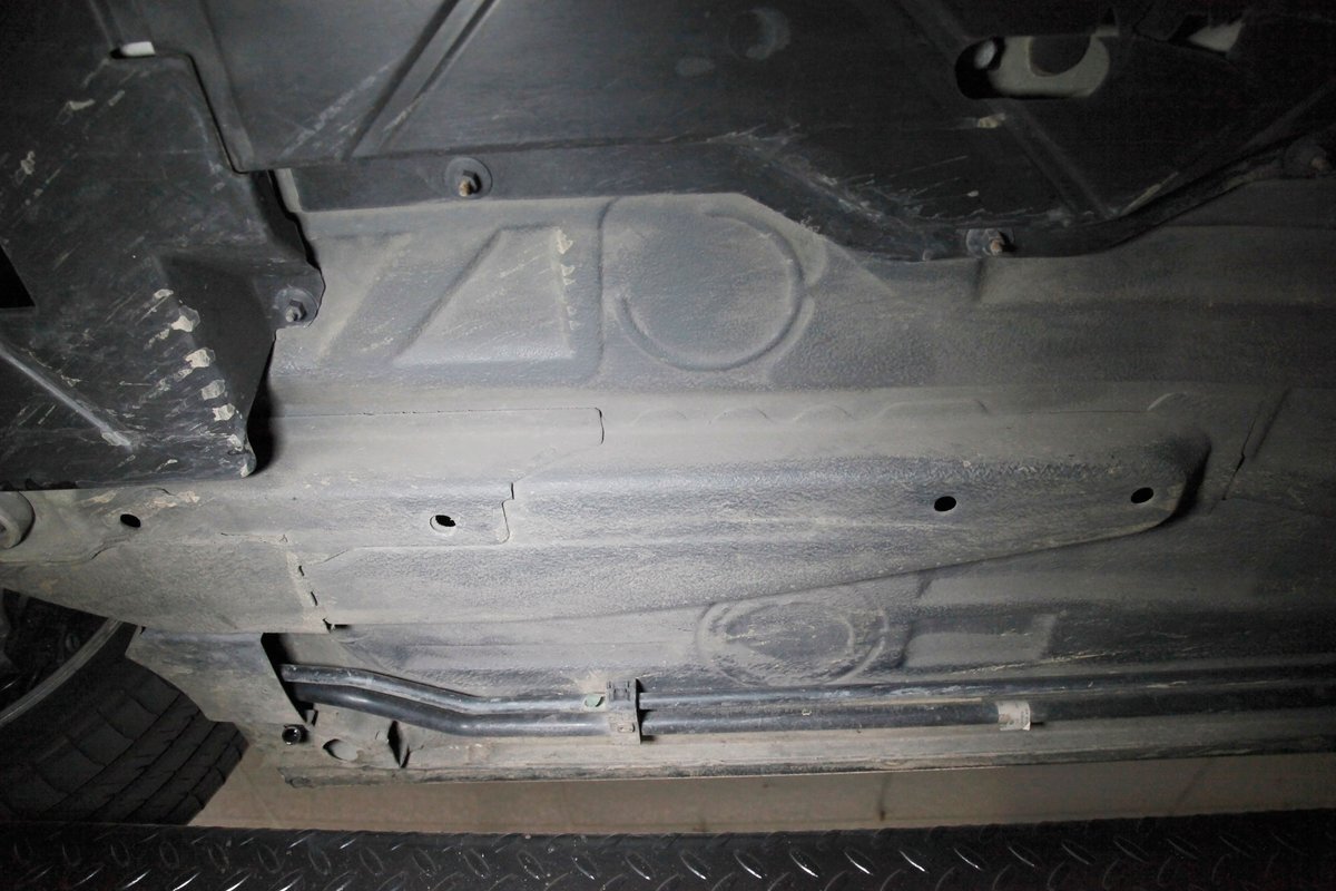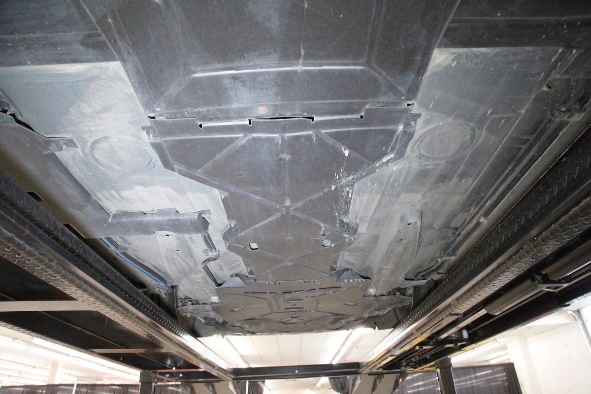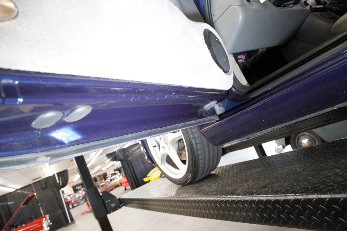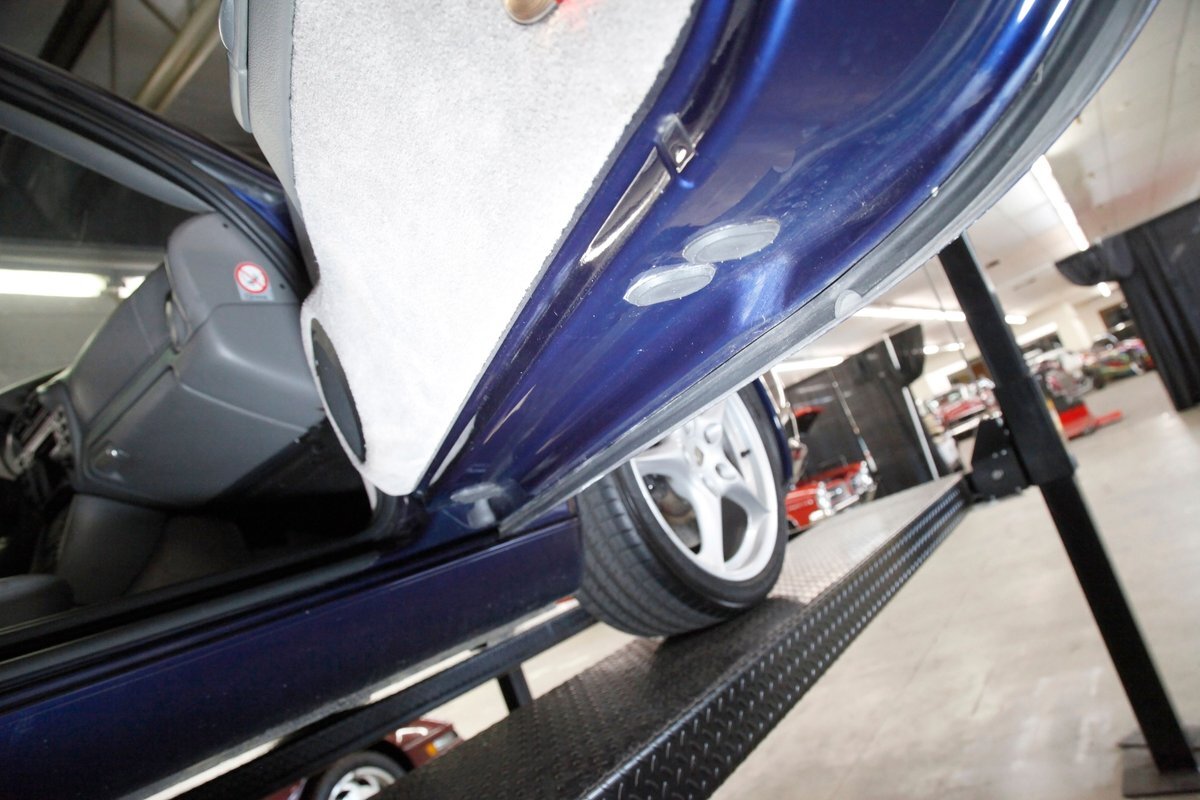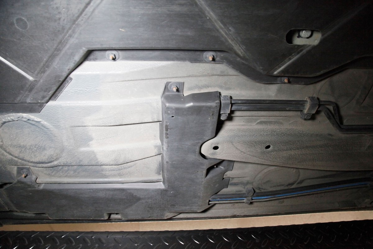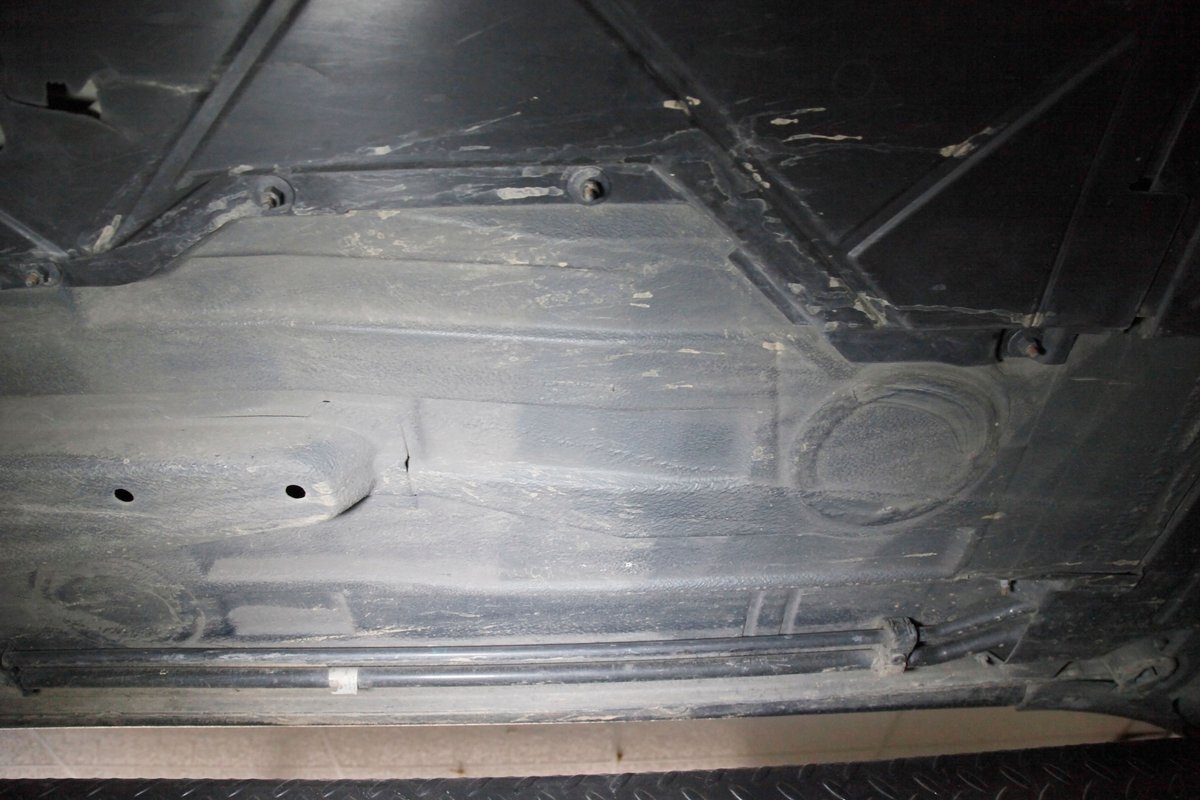 With a 95 percent coverage of ground effects panels, only the wheels are visible from the bottom. The panels are in very good condition with slight road dirt and some scrapes on the lower front cowl of the bodywork. Rockers are solid, and big 4-wheel disc brakes are present along with 4 wheel independent suspension.