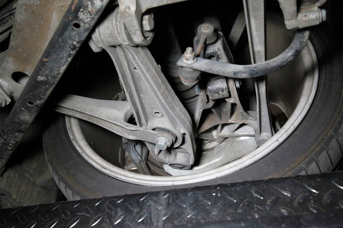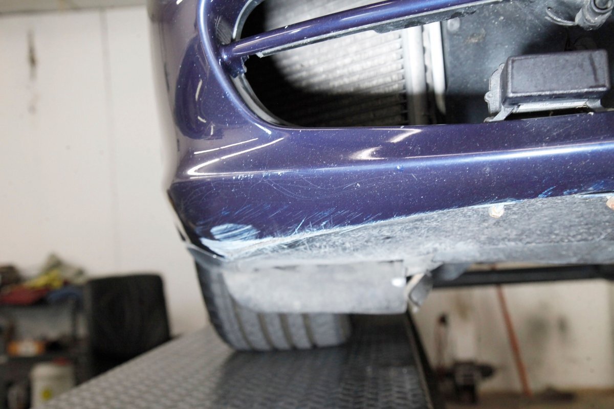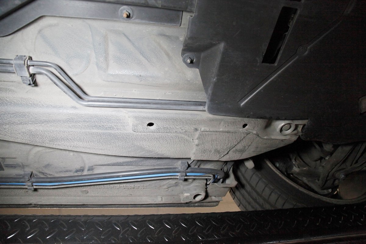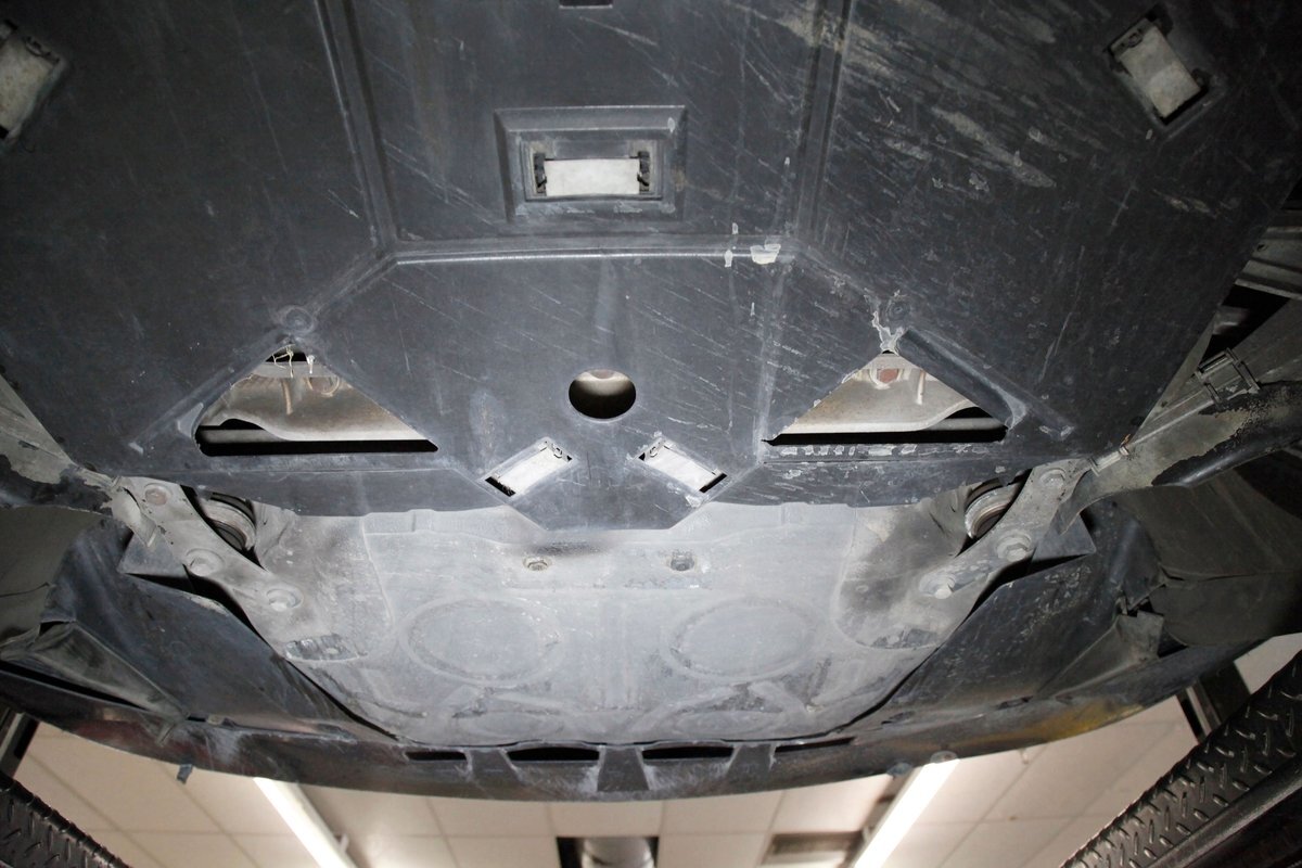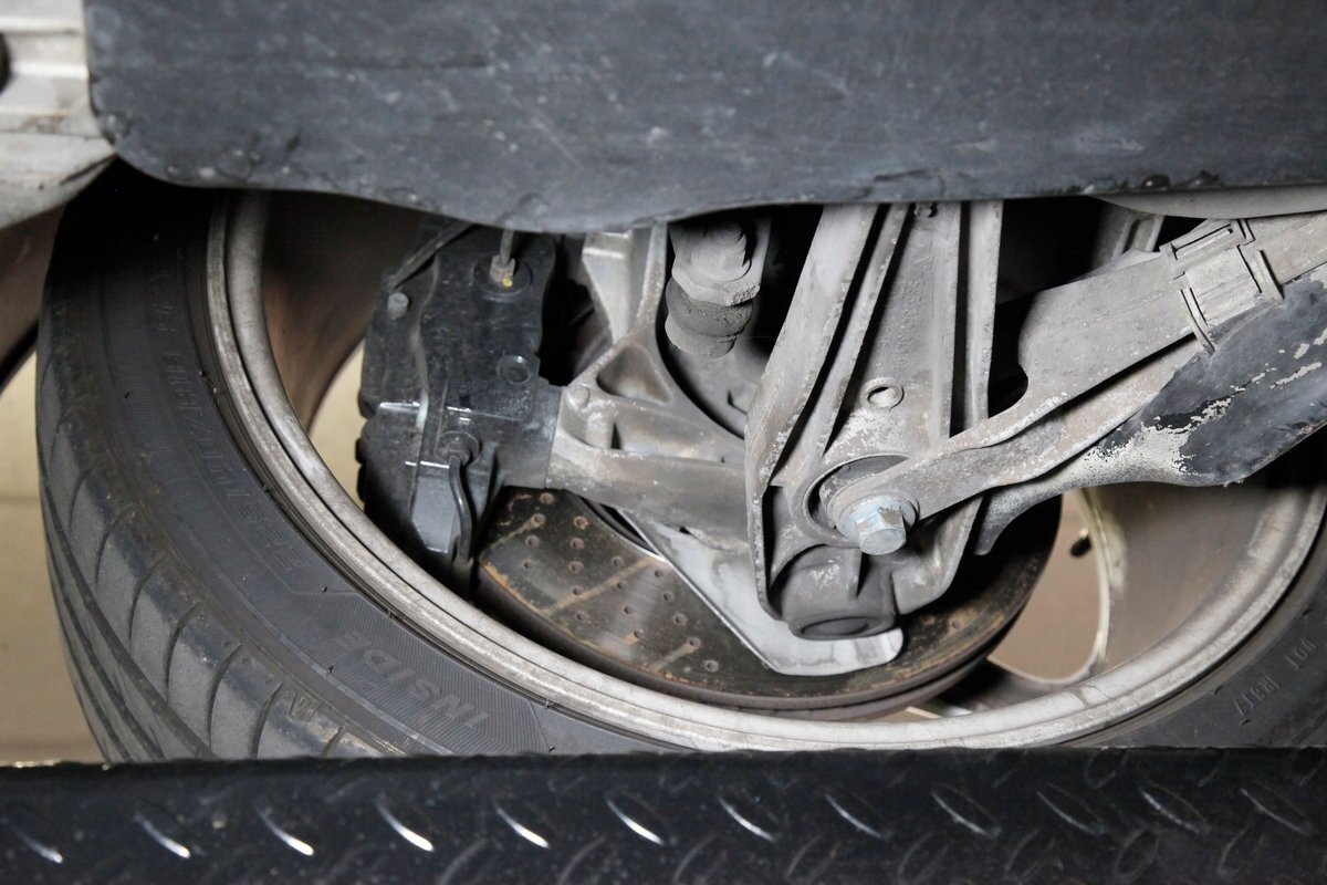 With a 95 percent coverage of ground effects panels, only the wheels are visible from the bottom. The panels are in very good condition with slight road dirt and some scrapes on the lower front cowl of the bodywork. Rockers are solid, and big 4-wheel disc brakes are present along with 4 wheel independent suspension.