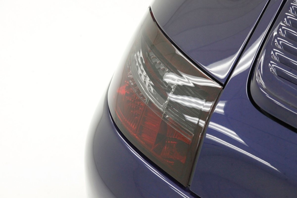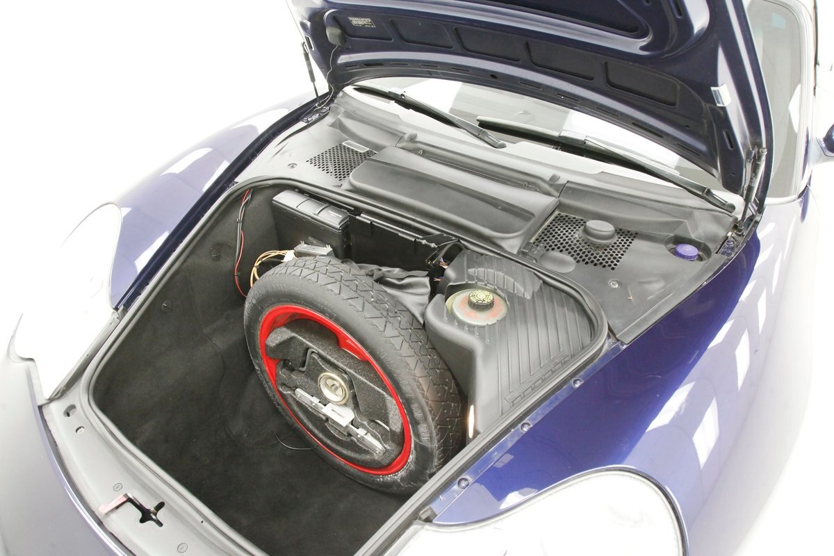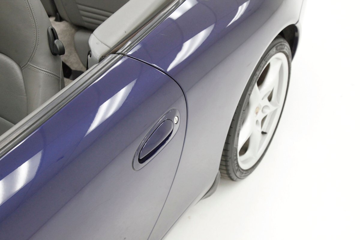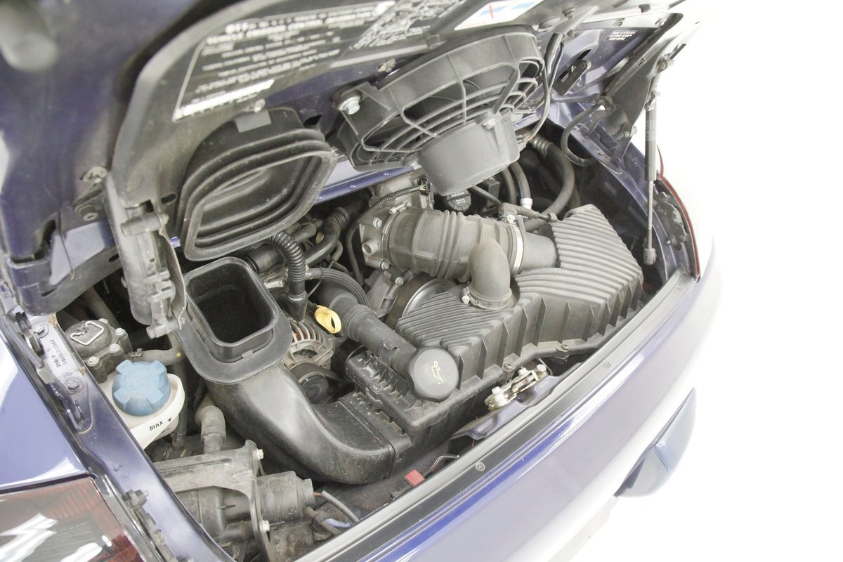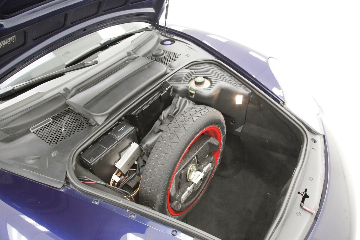 Sexy is the keyword for this car and it starts with the aerodynamic integrated bumper, gracefully sloping headlights, and the smooth front hood, all bathed in Porsche Midnight Blue Metallic. All of the gaps are fairly straight, but we do note a few flaws in the paint that are limited to stone chips and a few inclusions along with a yellowed passenger's side headlight. The bulbous rear of the vehicle works with the gray canvas drop top to form the sloping rear, also with a seamless rear body matching bumper complete with the sculpted taillights sounding either edge of the rear quarters. A hidden rear spoiler automatically rises to help with the handling when up to speed and fits nicely into the engine lid. Big 18-inch multi-spoke Porsche wheels are wrapped in low profile all season rubber on all 4 corners.