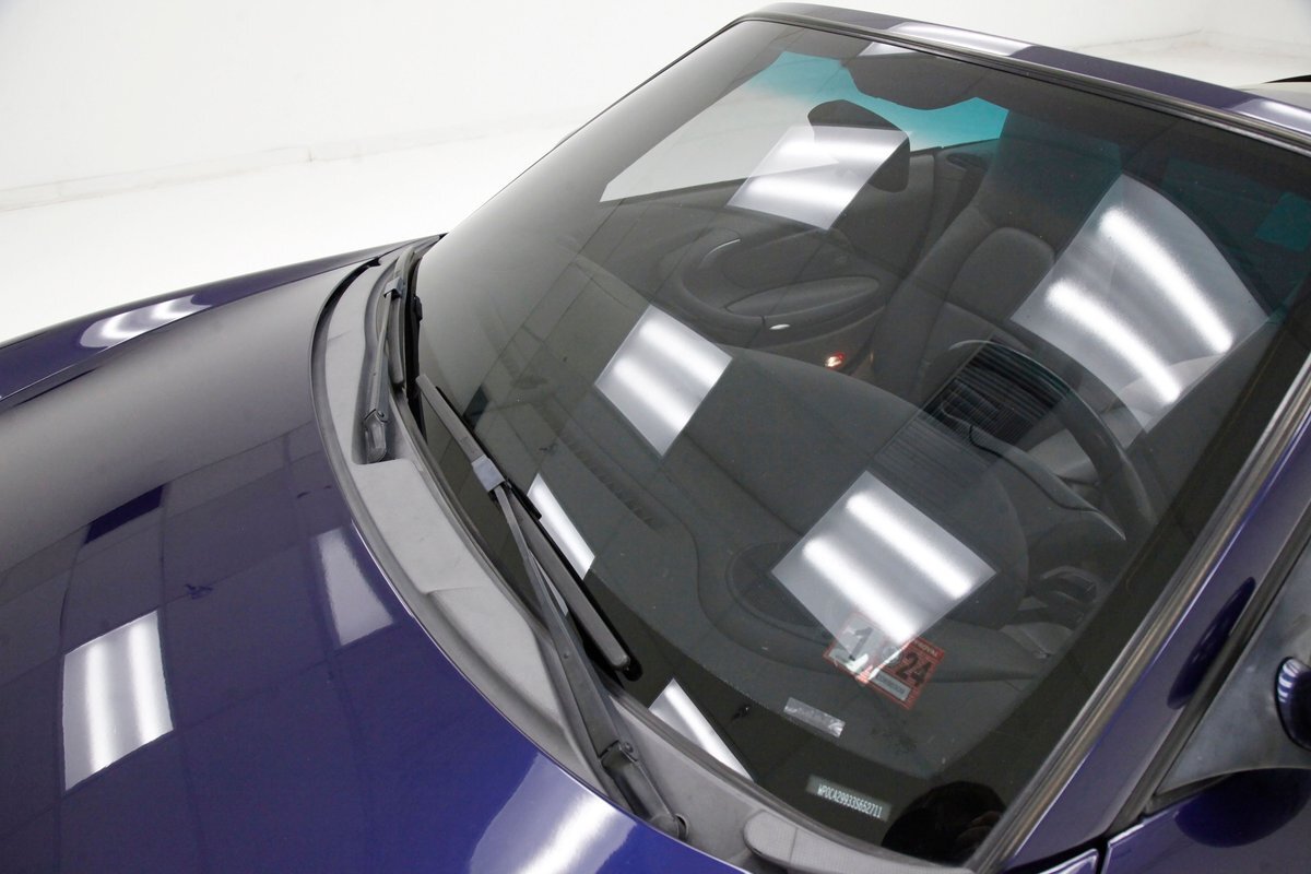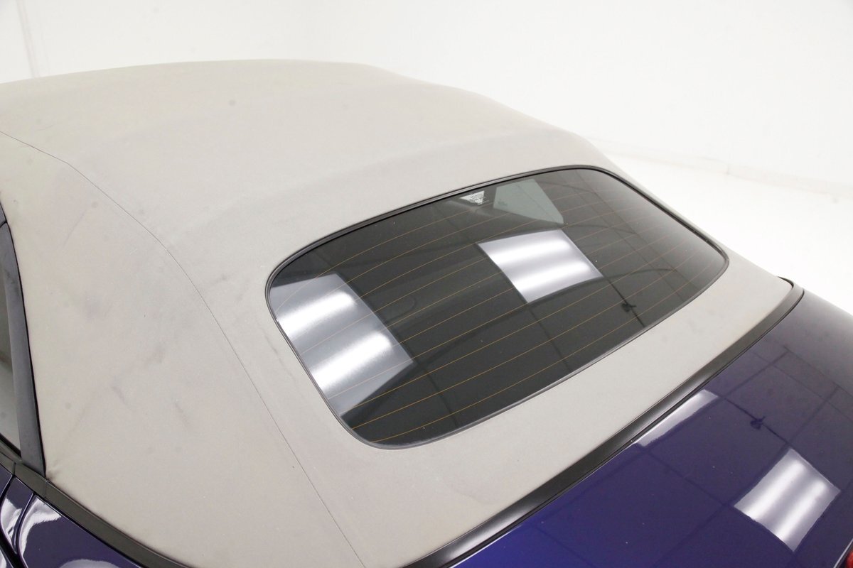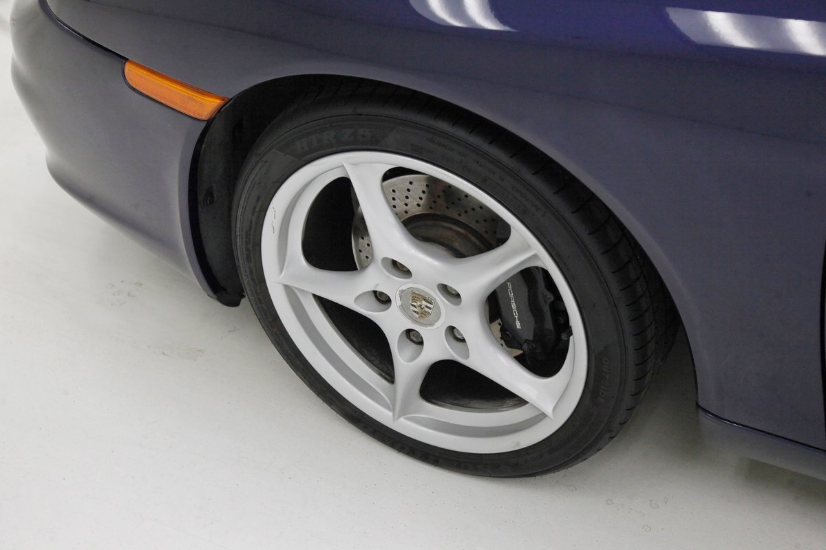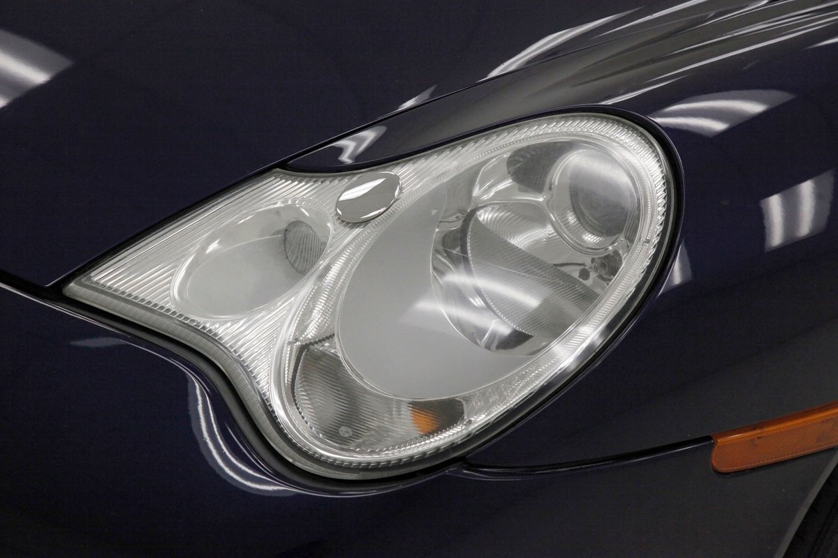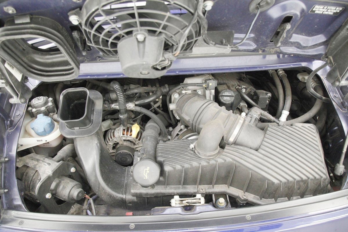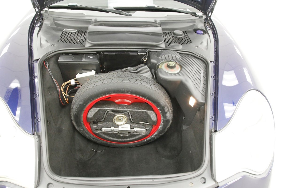 Sexy is the keyword for this car and it starts with the aerodynamic integrated bumper, gracefully sloping headlights, and the smooth front hood, all bathed in Porsche Midnight Blue Metallic. All of the gaps are fairly straight, but we do note a few flaws in the paint that are limited to stone chips and a few inclusions along with a yellowed passenger's side headlight. The bulbous rear of the vehicle works with the gray canvas drop top to form the sloping rear, also with a seamless rear body matching bumper complete with the sculpted taillights sounding either edge of the rear quarters. A hidden rear spoiler automatically rises to help with the handling when up to speed and fits nicely into the engine lid. Big 18-inch multi-spoke Porsche wheels are wrapped in low profile all season rubber on all 4 corners.