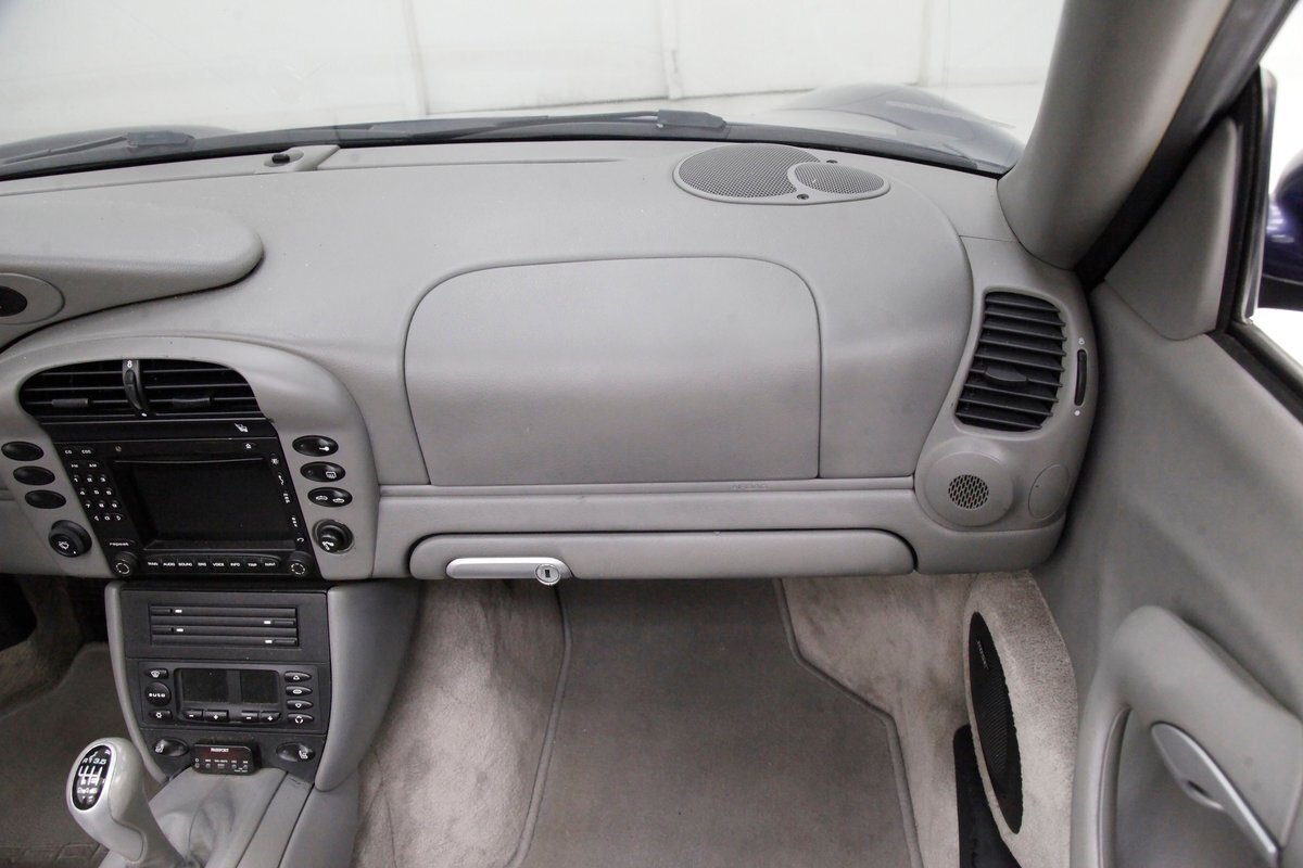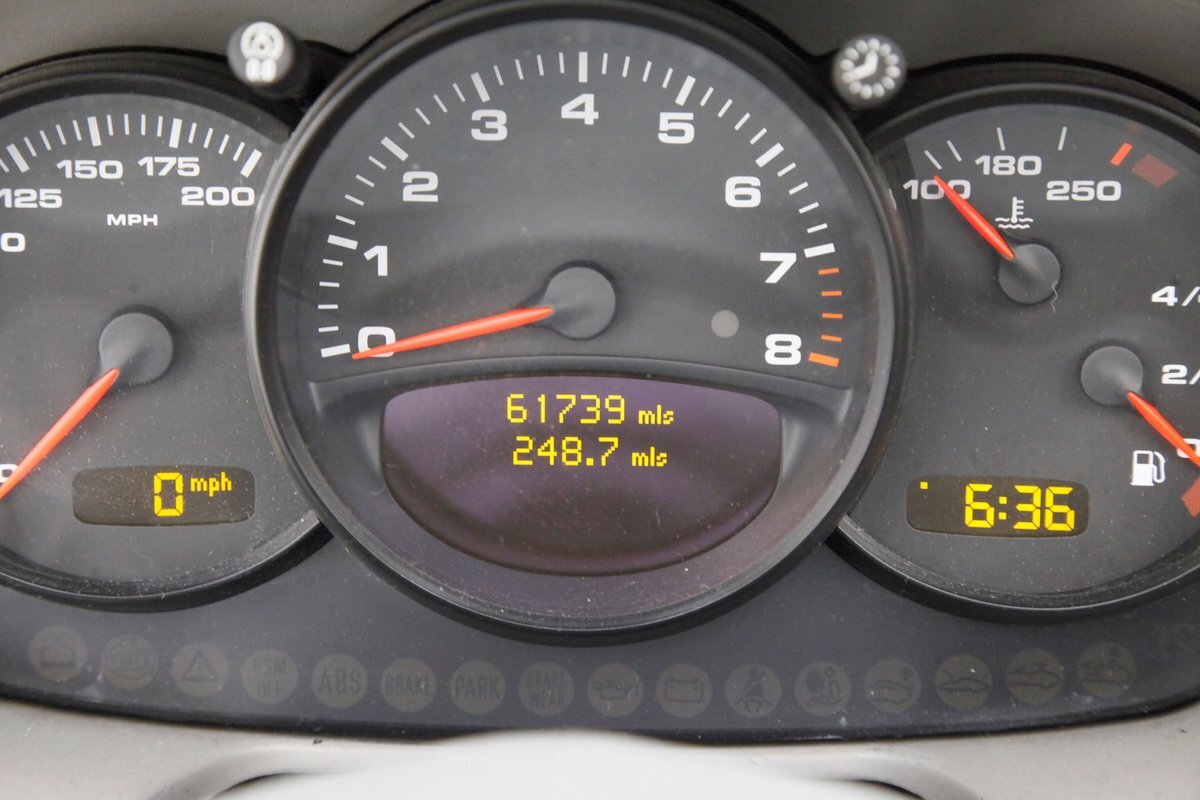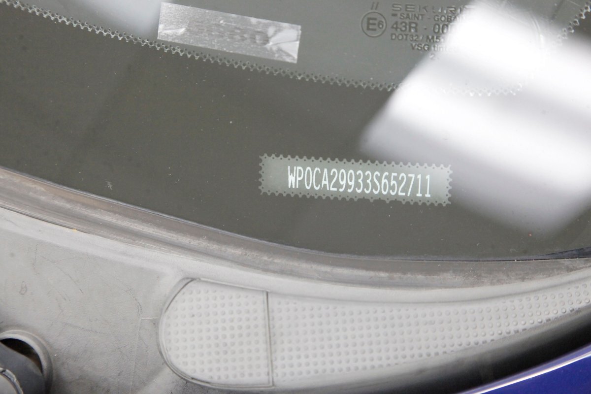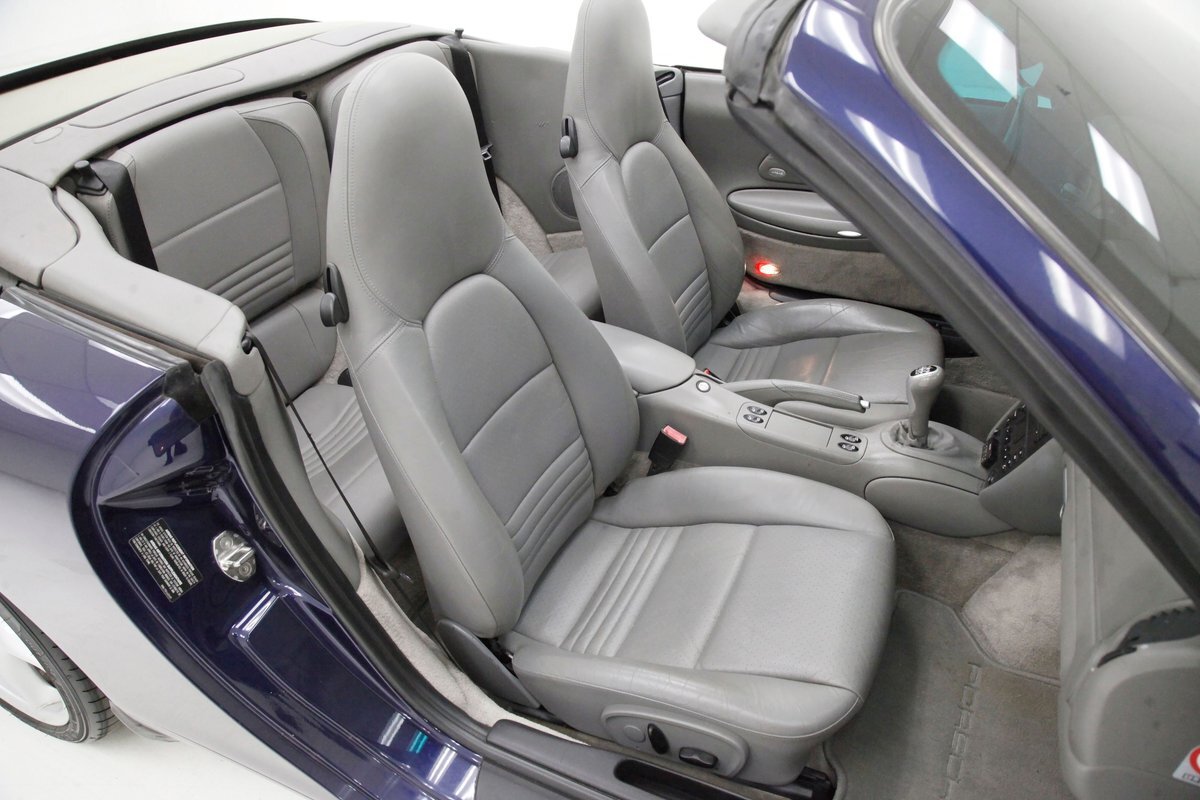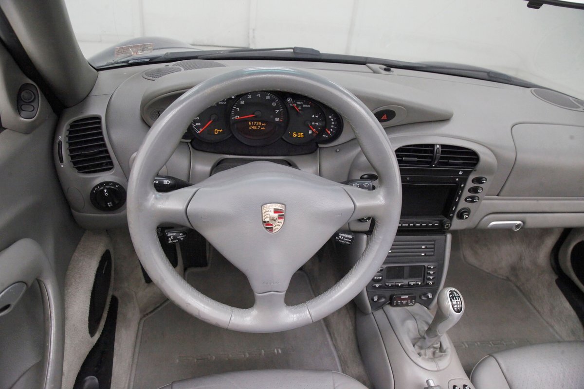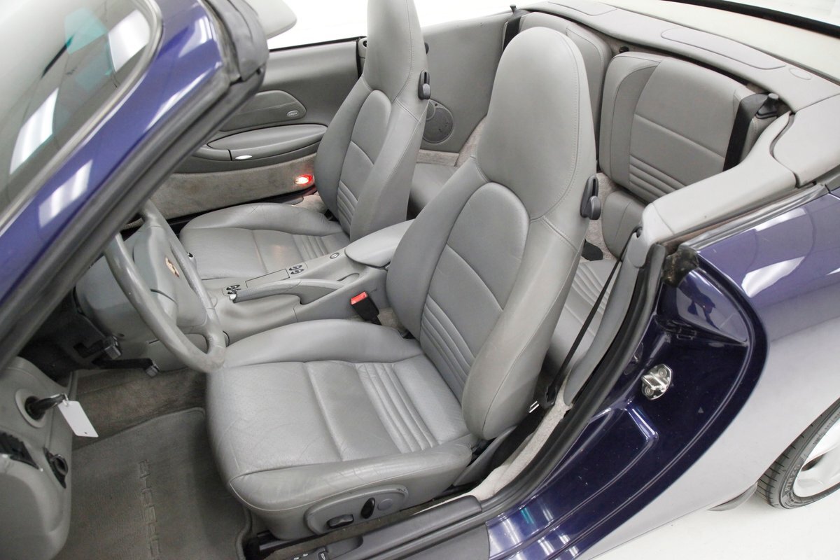 Graphite Gray leather, with just a nice touch of some break in wear, covers the high back buckets, emblazoned with embossed Porsche badges in the upper headrests portions. These front a curvaceous sexy dash with some interplay of black panels and cascading circular black faced gauges. A Sirius enabled radio along with AM/FM functions as well as Bluetooth and Navigation can keep you entertained on those long fast commutes via the Autobahn or your local 4 lane interstate track. Take liberties with the speed as this car is enabled with front and rear radar detection, cruise control, memory seats, power windows, power locks, and a power top. Matching pristine Graphite Gray carpet floods the floors and remains amazingly clean. Noted is a gray top cover which adds to the aero look when the top is in the down position.